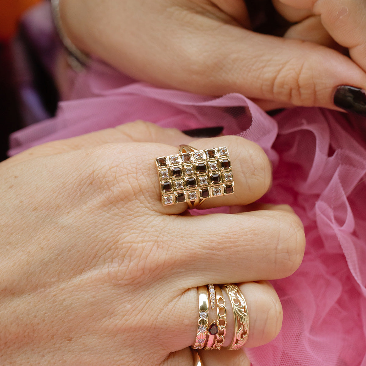 Solid Gold Checkerboard Gemstone Shield Ring