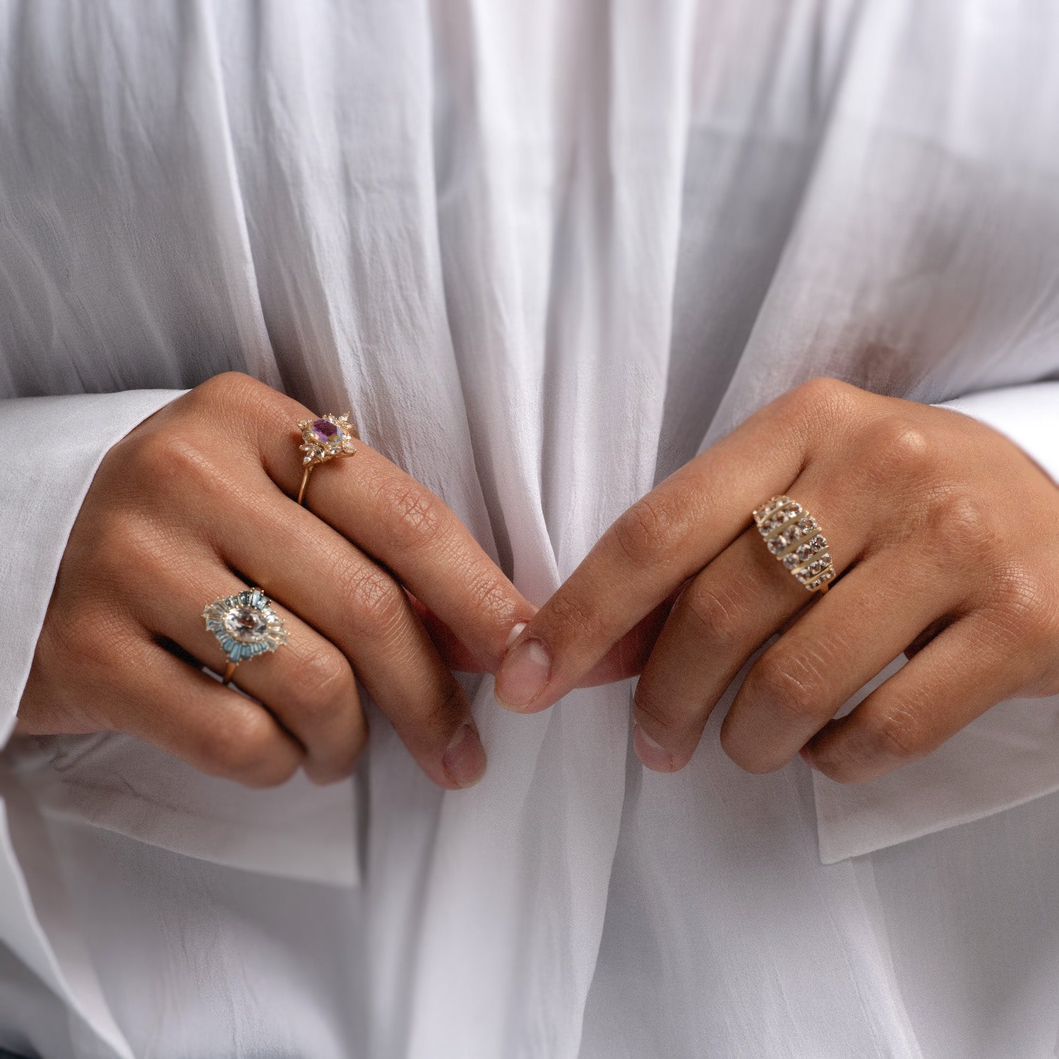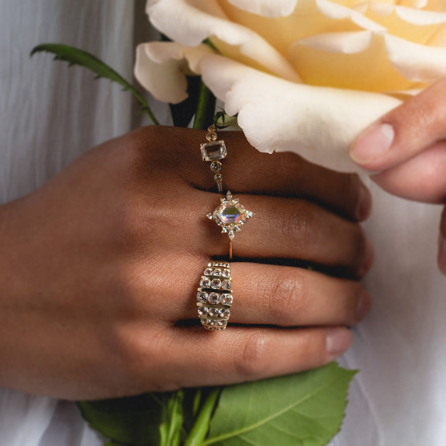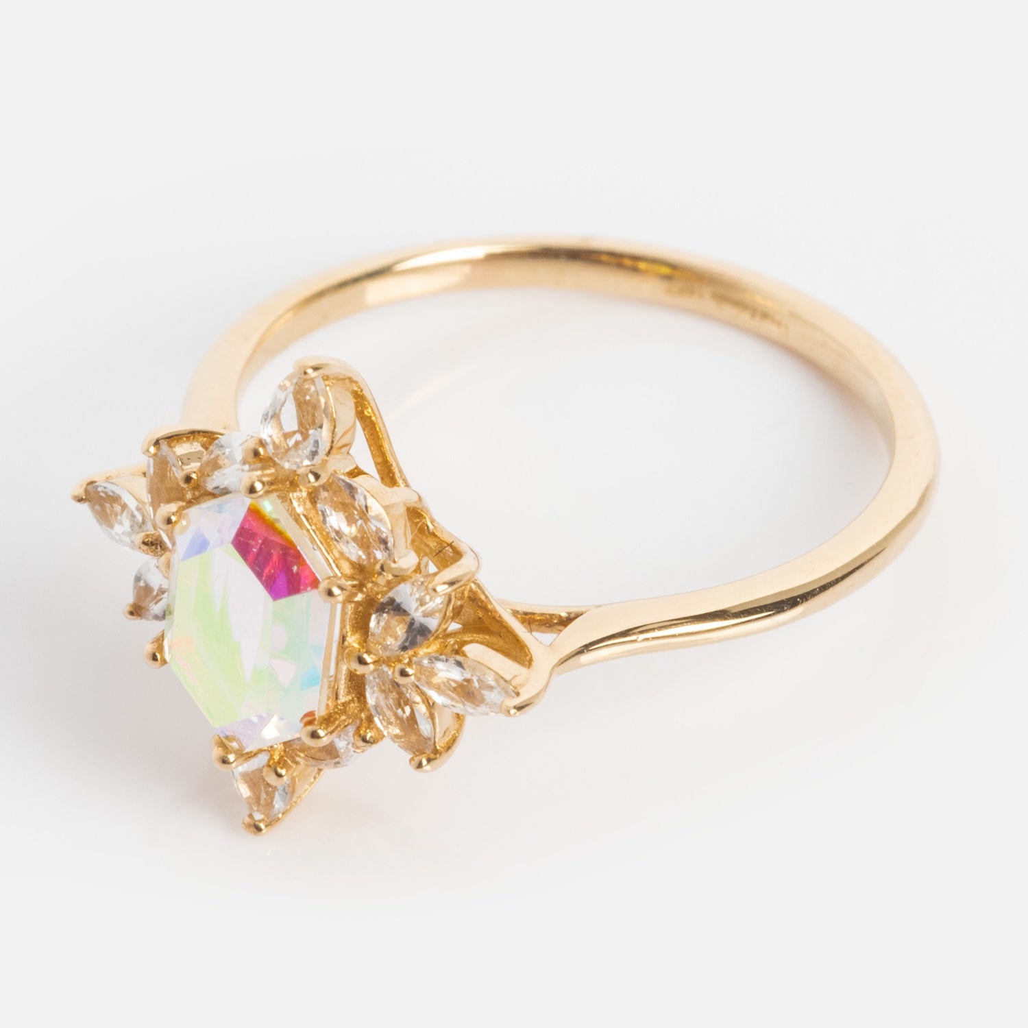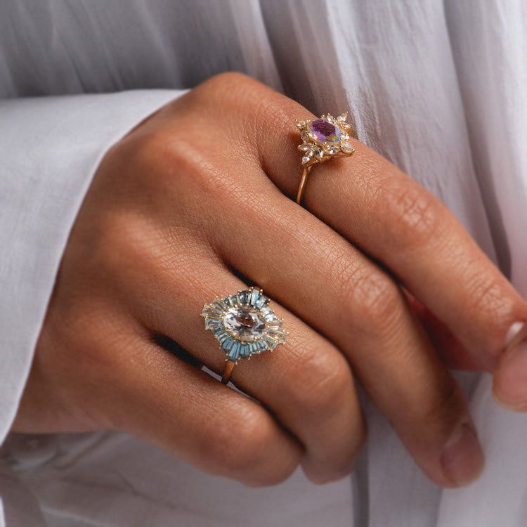 This awe-striking statement ring features a ethereally iridescent angel aura quartz at the center of an intricate cluster of white sapphires. This stunning ring in all of its elegant splendor is crafted in solid gold and built to last a lifetime.