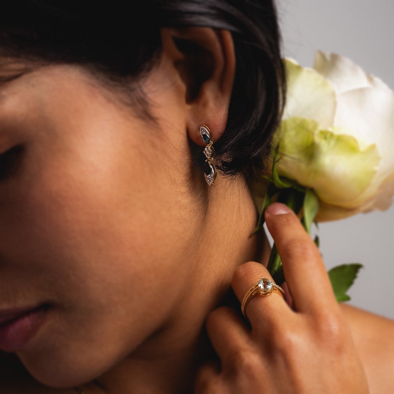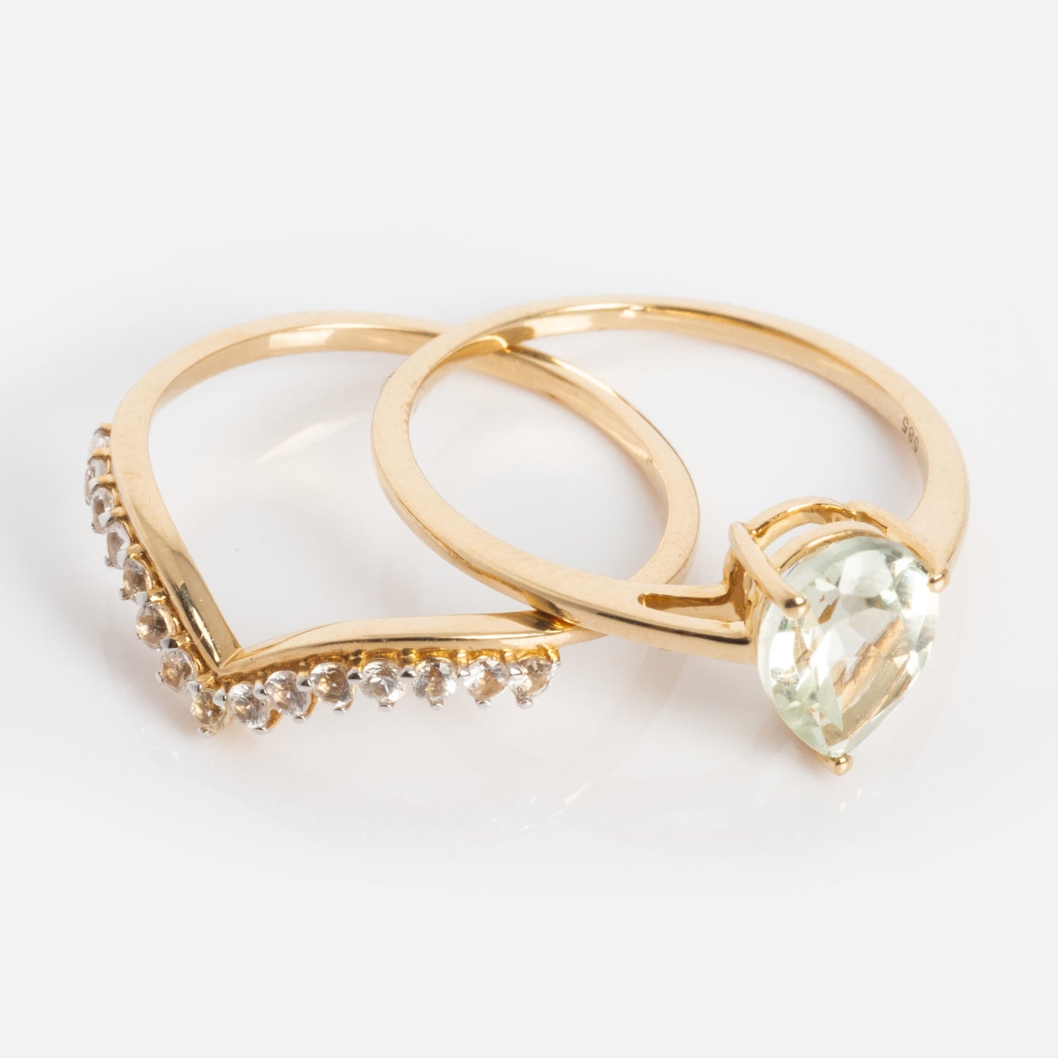 A breathtaking future heirloom in two parts. The 14k Classic Green Grandeur Nesting Ring set features two elegant solid gold rings: a stunning classic solitaire with a show-stopping soft green sapphire and an lovely accompanying pointed pave band.