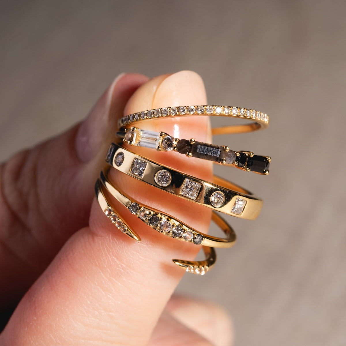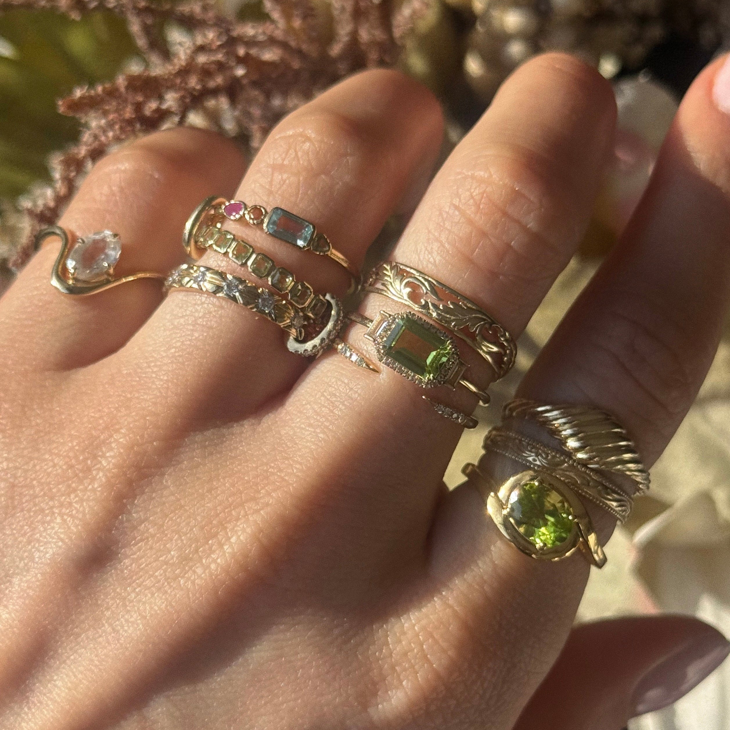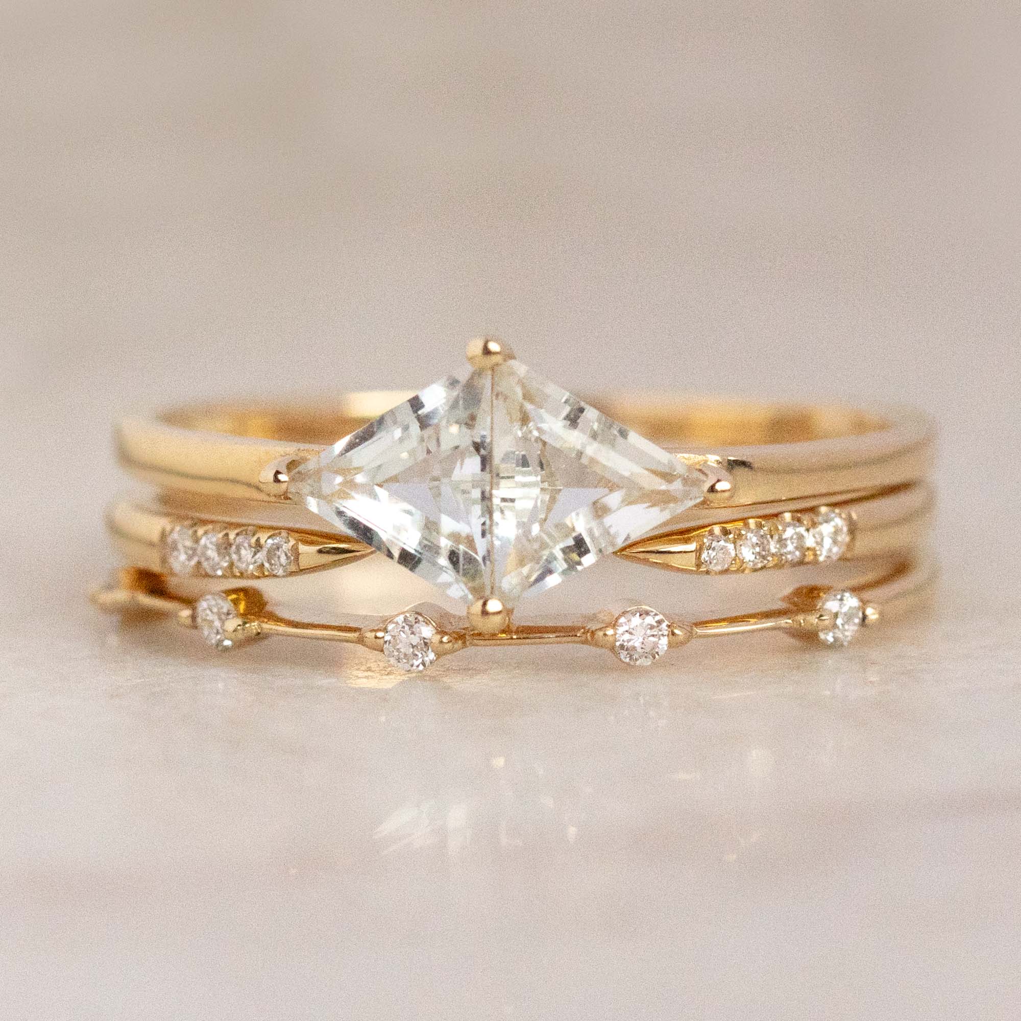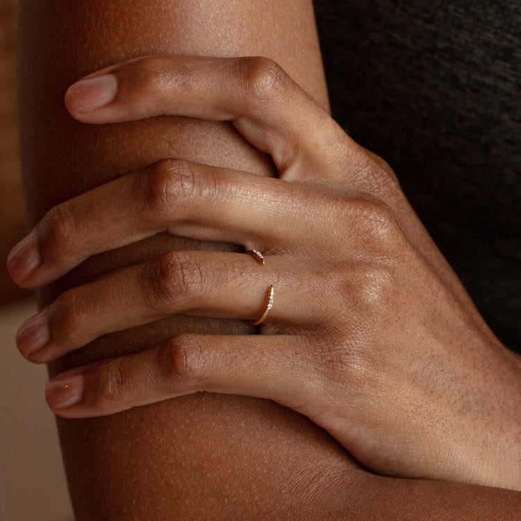 The 14k Open Front Stacking Ring was designed to beautifully complement any Carried Jewels engagement ring. The open front draws attention to the center stone configuration of its counterpart with shimmering perfection.