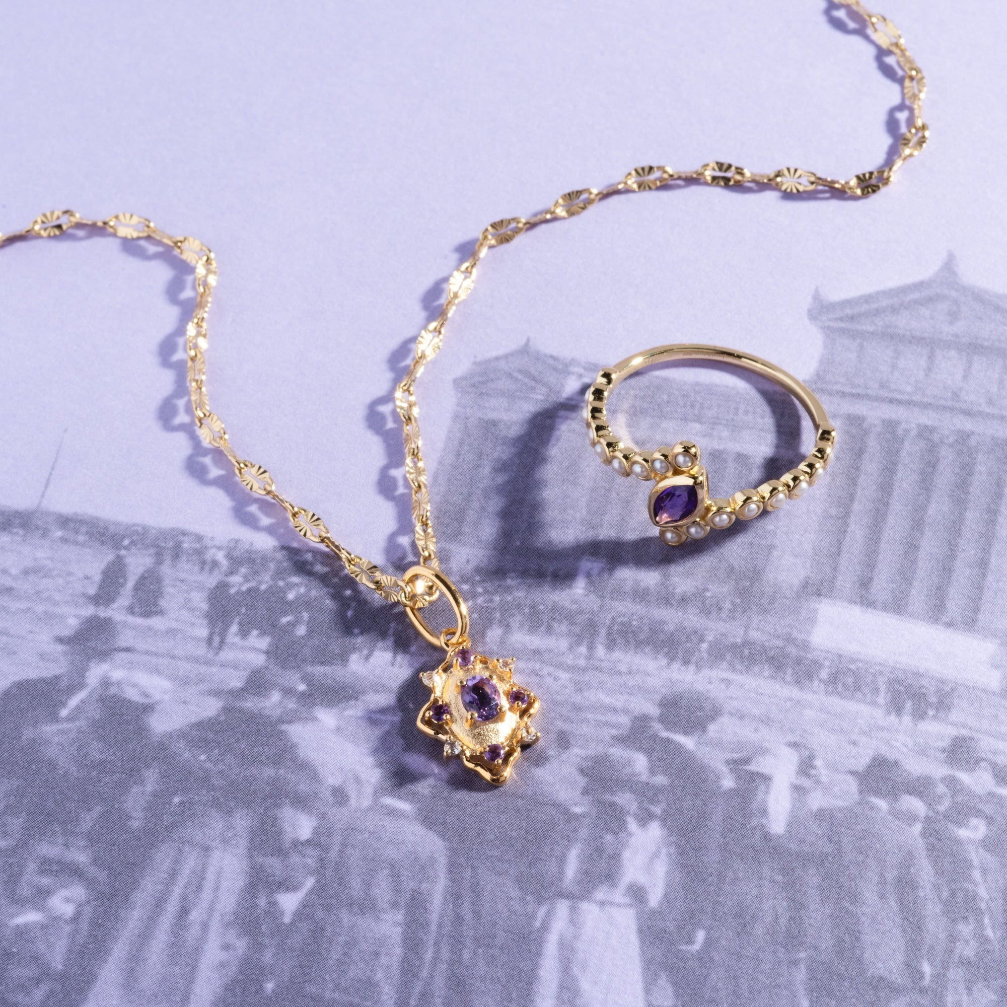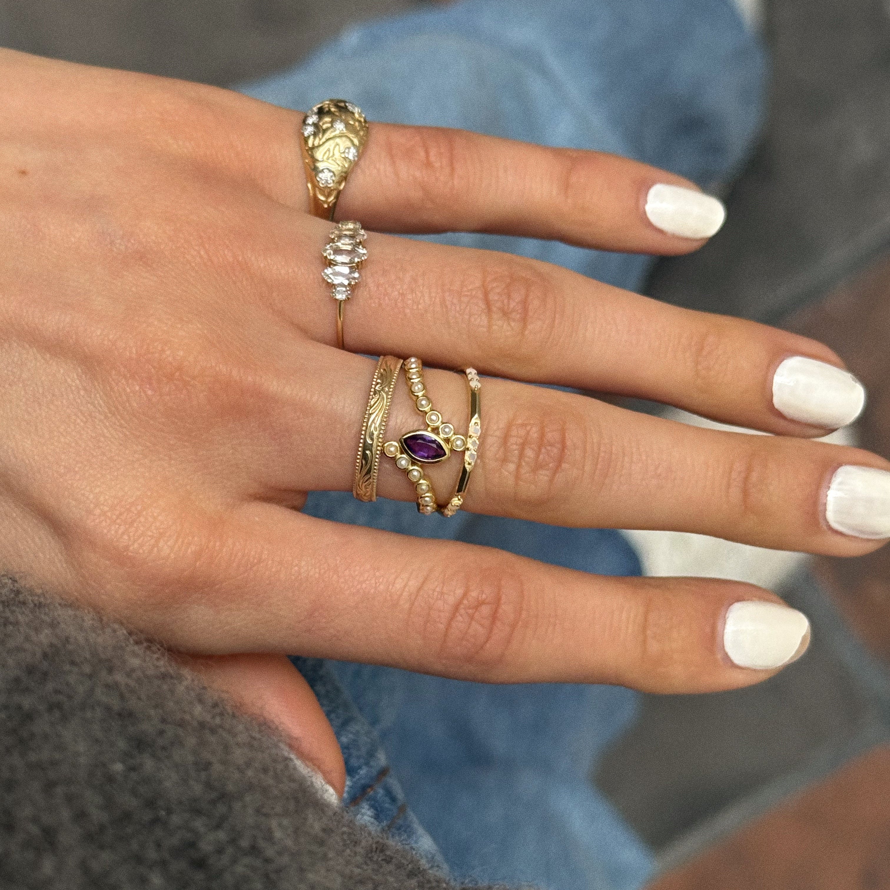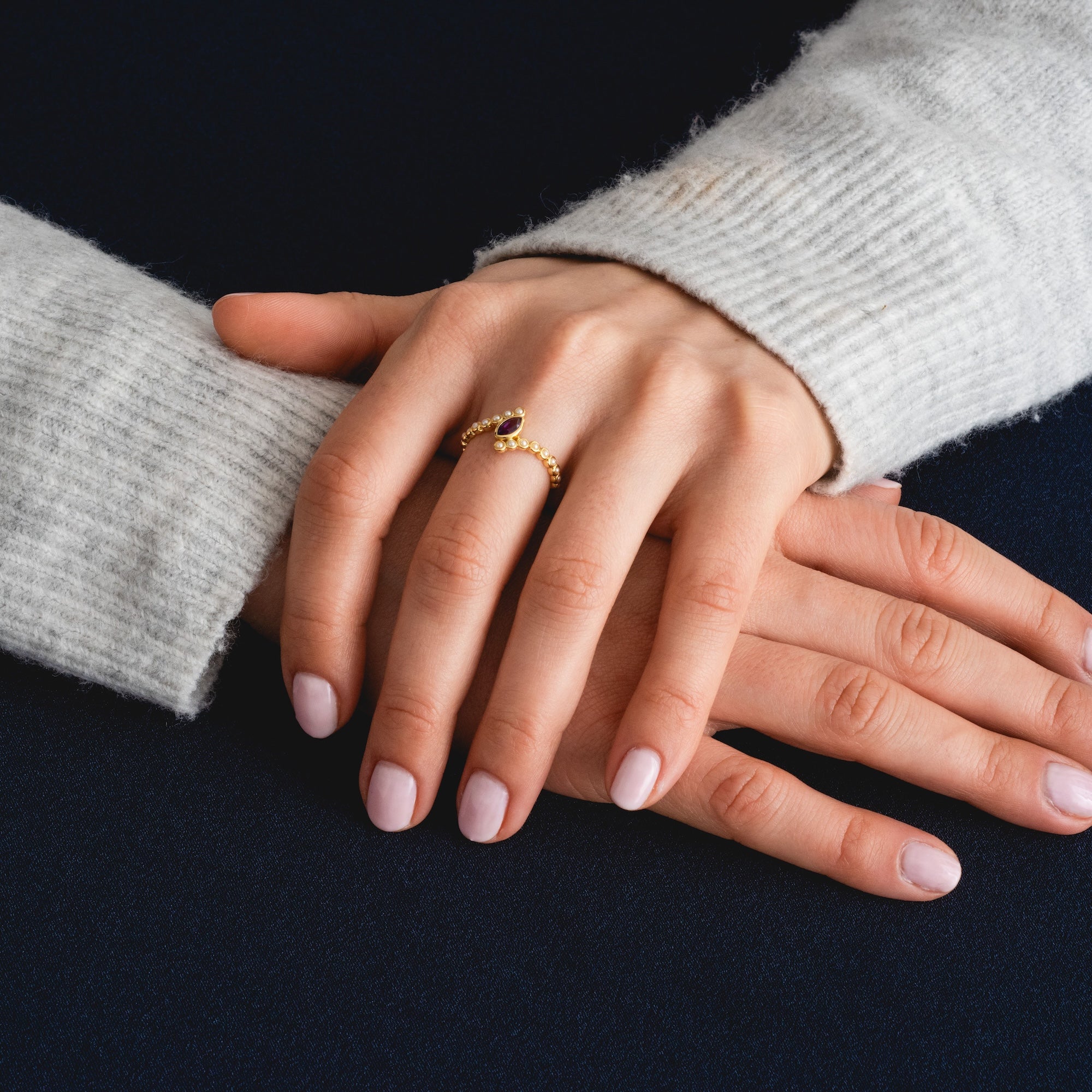 This piece will be stocking soon! The 2026 February Capsule Floating Amethyst and Pearl Twist Ring is expected to arrive in late April. Join the waitlist to be notified as soon as it arrives!