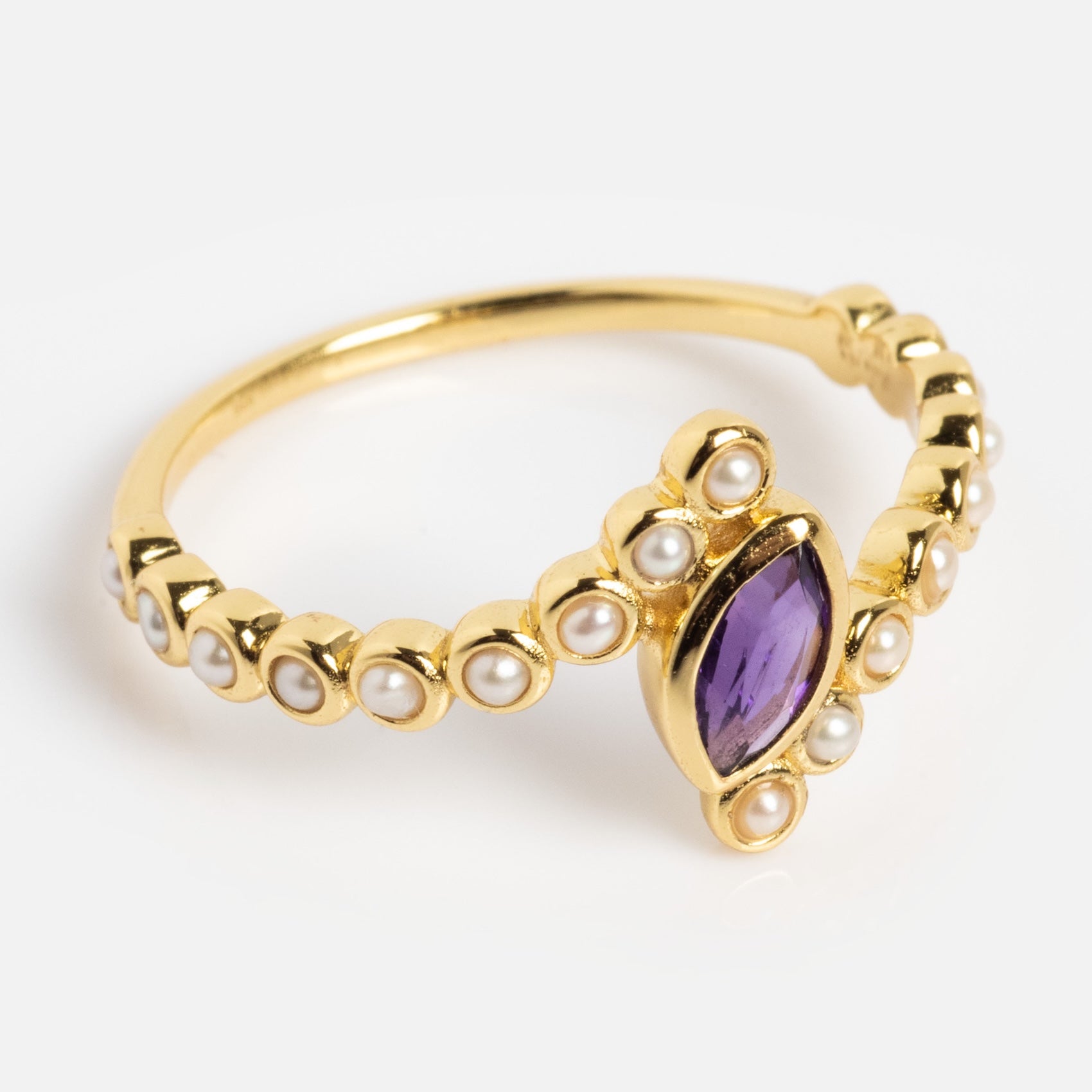 Twist into February with this gorgeous statement ring featuring a vibrant amethyst marquise floating between a twisting pearl band. Crafted in premium quality yellow gold vermeil. this birthstone stunner is perfect for anyone celebrating a February birthday.