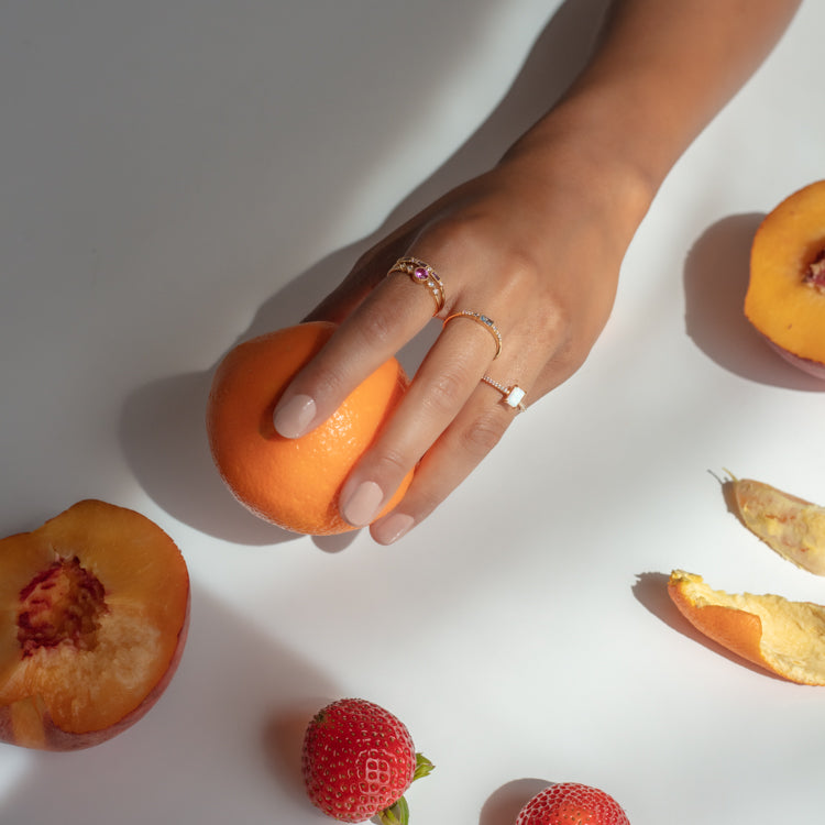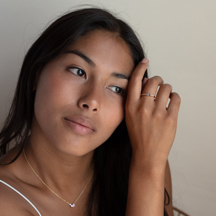 Calm. cool. and colorful. This gold ring by For You. With Love features a blue cz center with adjacent shimmering cz's along the delicate gold band. This colorful ring will be your new everyday staple!