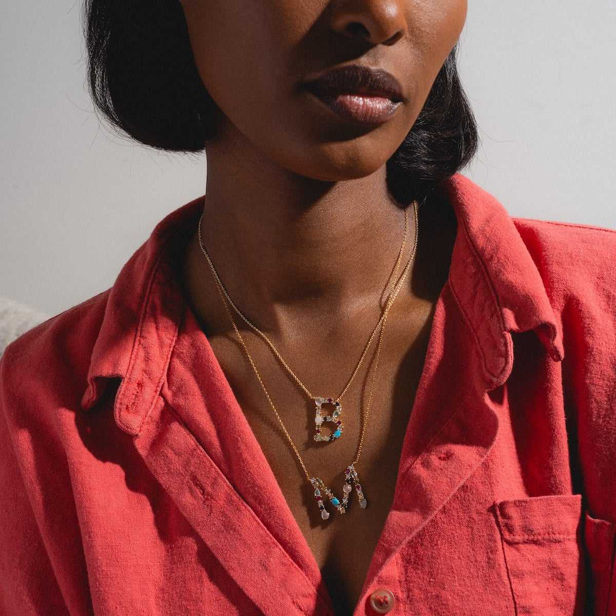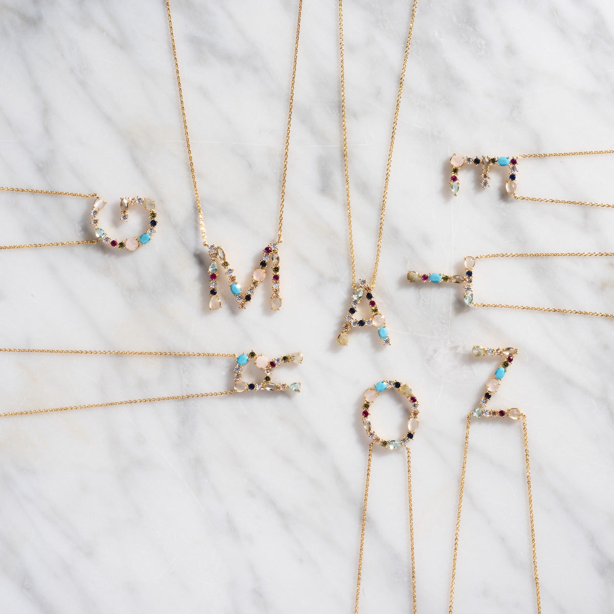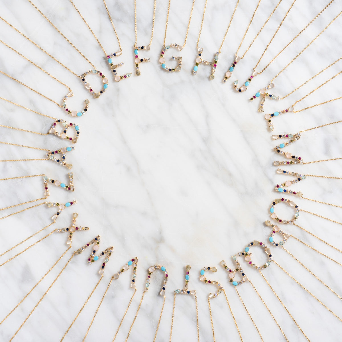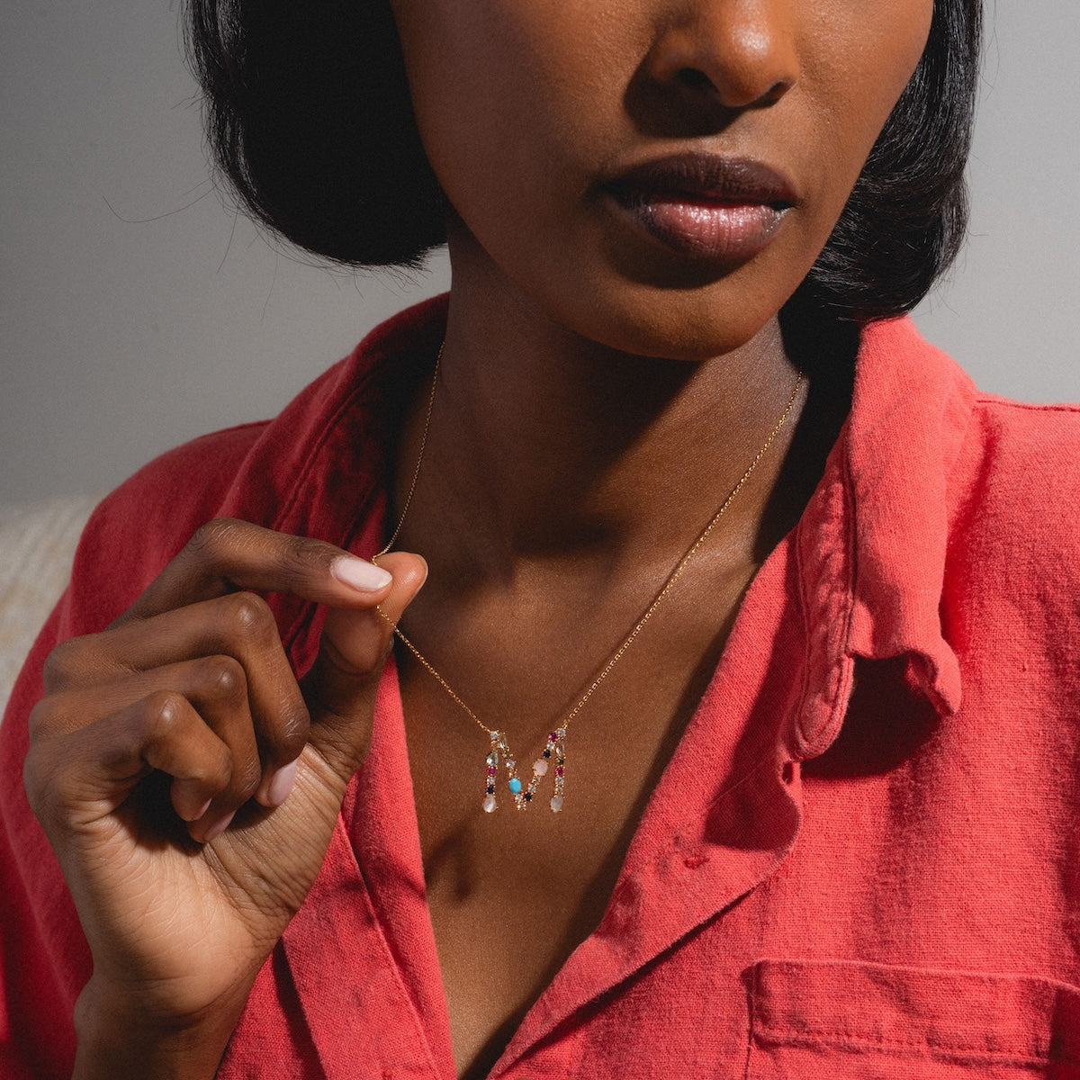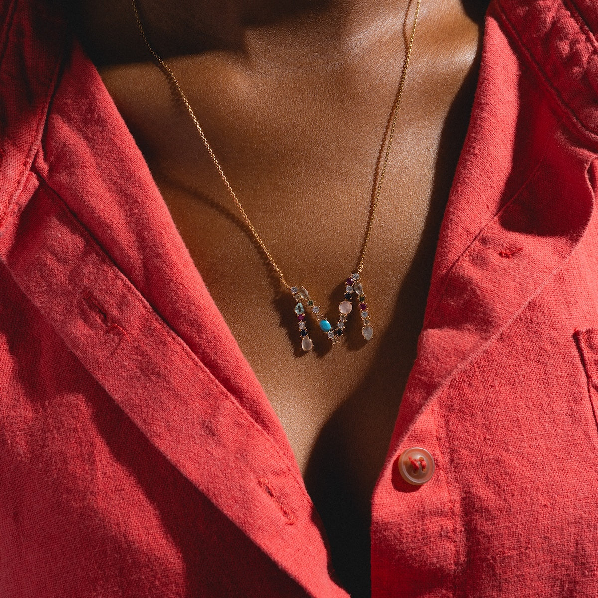 A colorful new take on a favorite monogram style by Tai Jewelry. Gleaming with sparkling cubic zirconia stones in a vibrant array of colors and shapes. this stunning necklace is the most gorgeously bold way to personalize your necklace stack.
