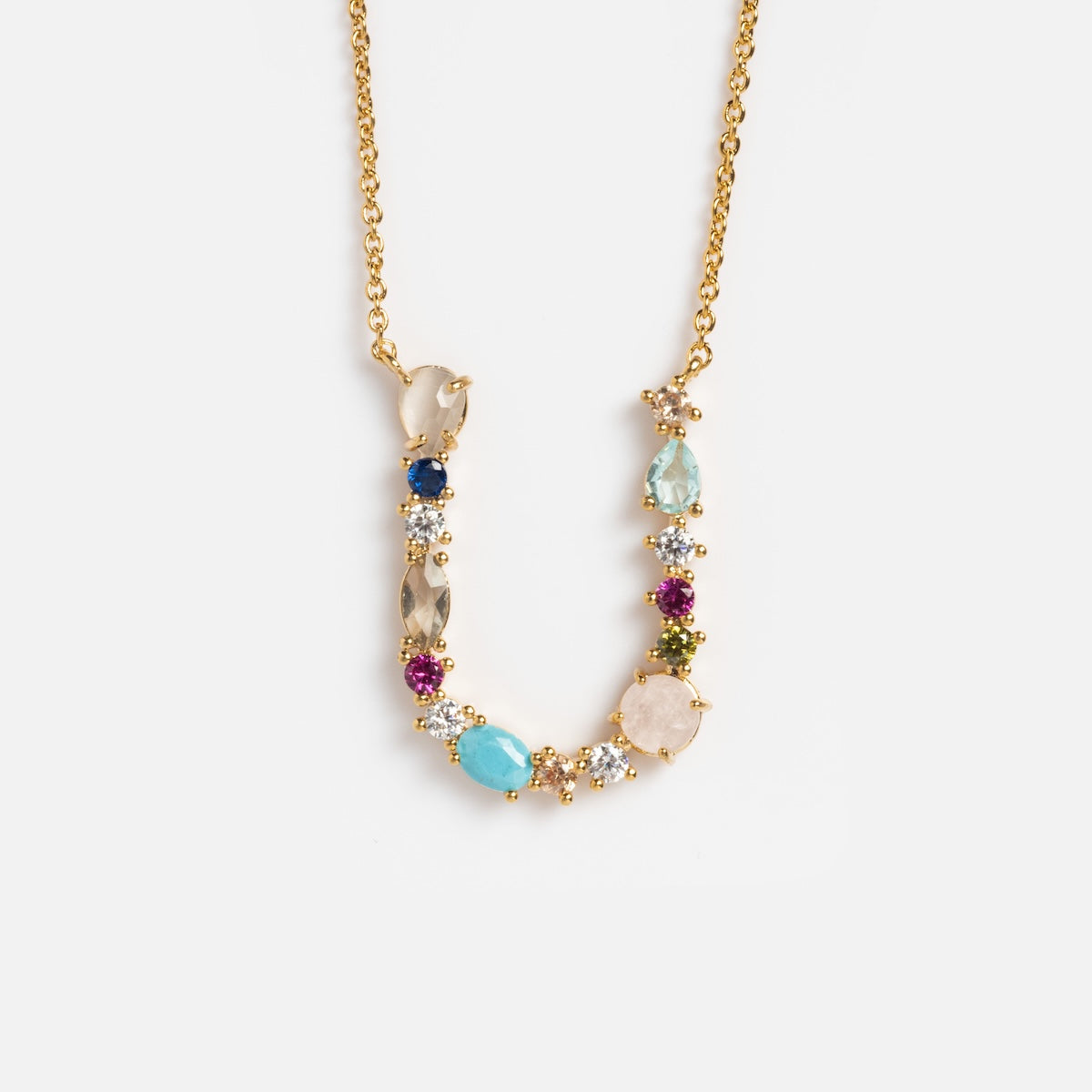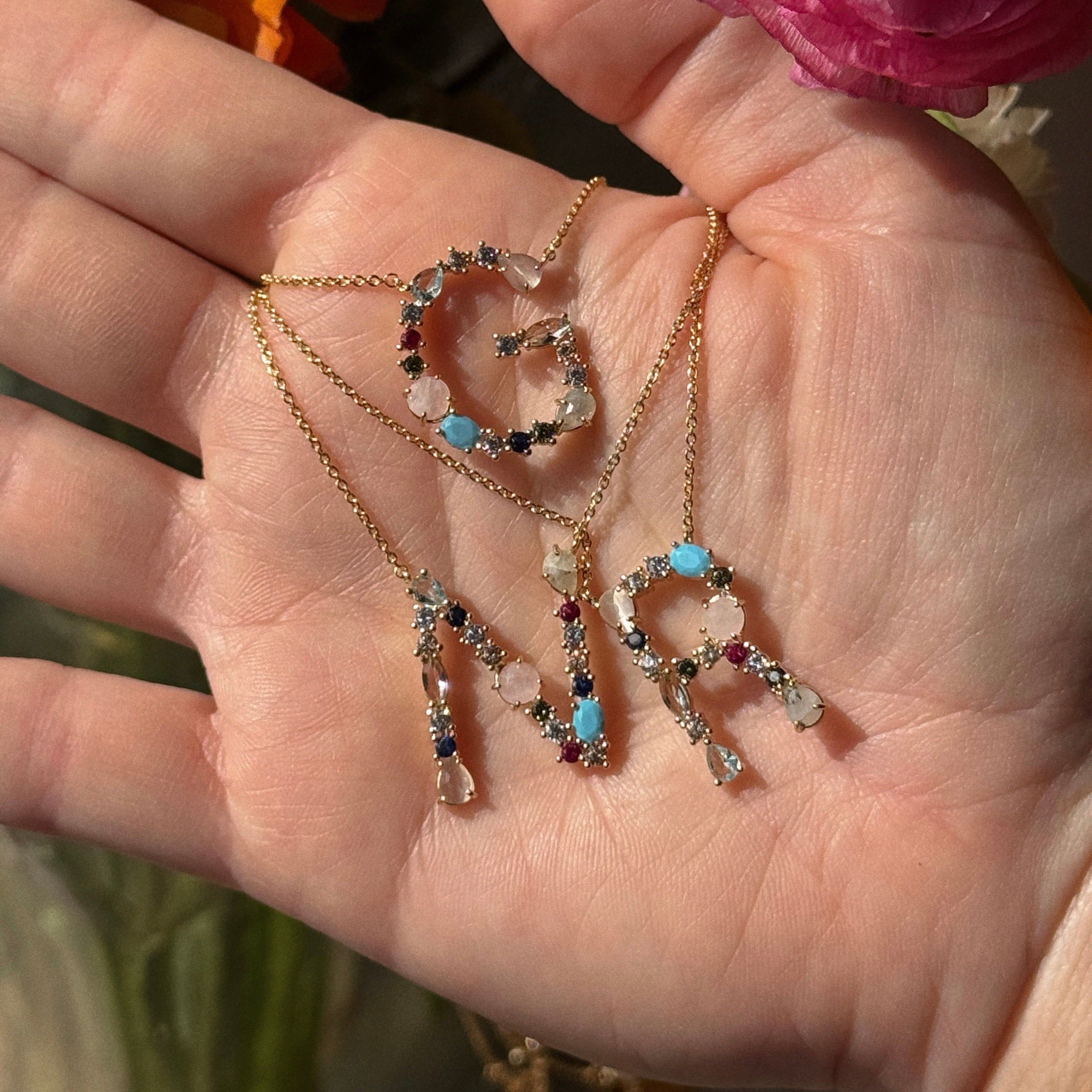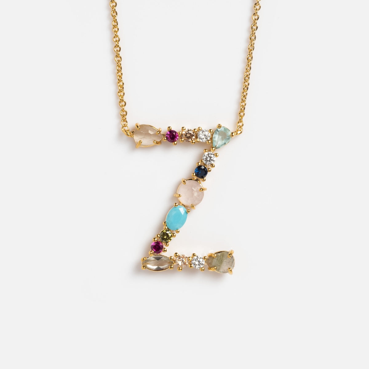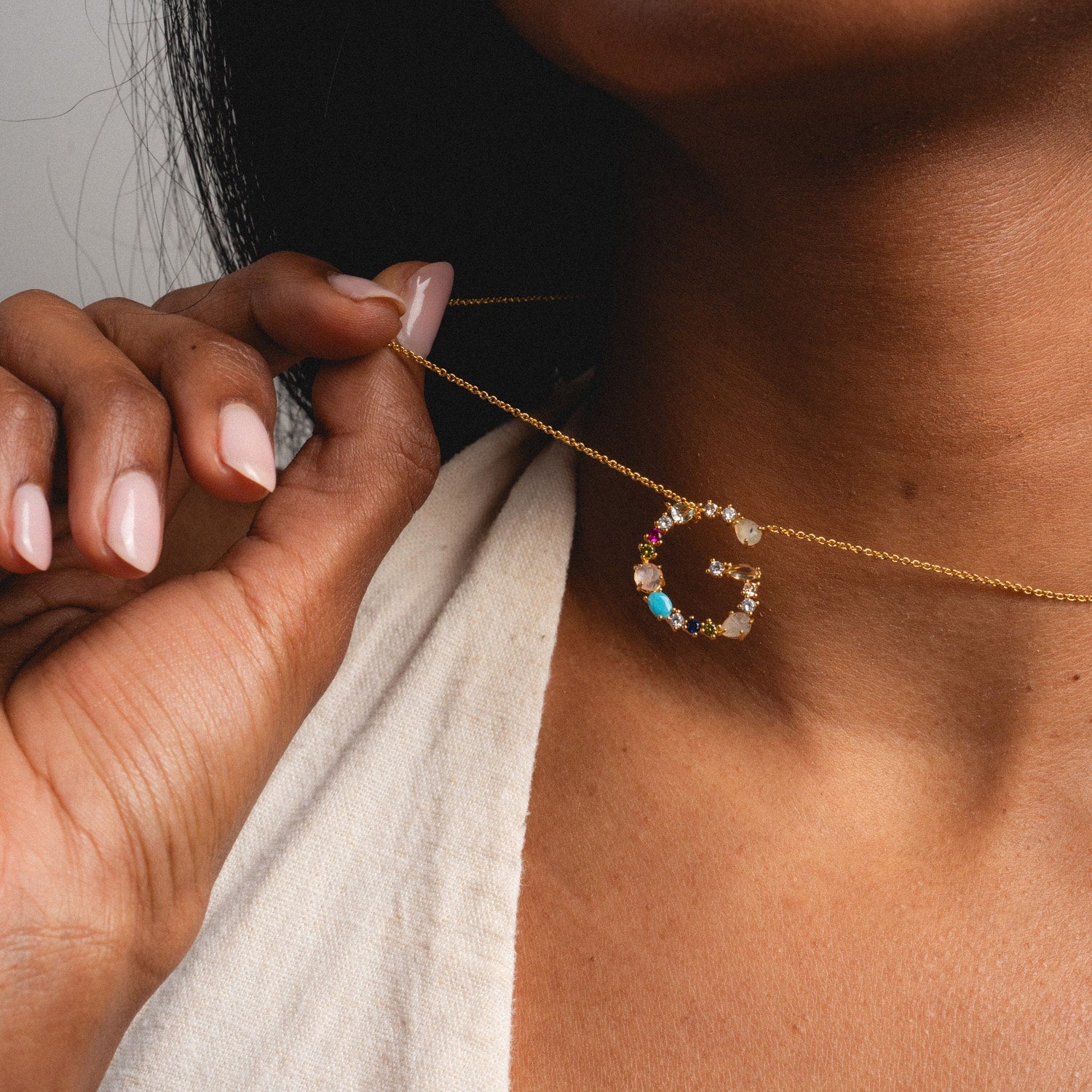A colorful new take on a favorite monogram style by Tai Jewelry. Gleaming with sparkling cubic zirconia stones in a vibrant array of colors and shapes. this stunning necklace is the most gorgeously bold way to personalize your necklace stack.