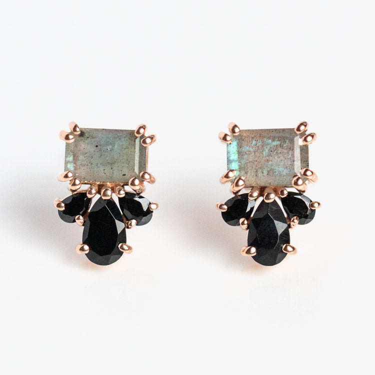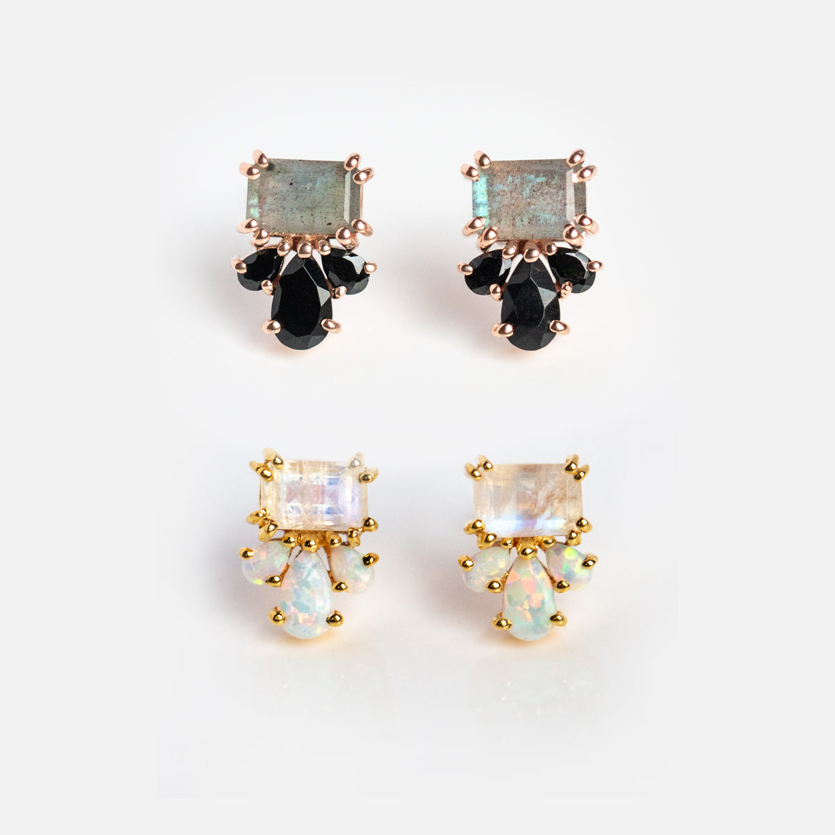 Wear a little bit of magic everyday with these gemstone stud earrings by La Kaiser featuring labradorite and black onyx or rainbow moonstone and lab created opal.