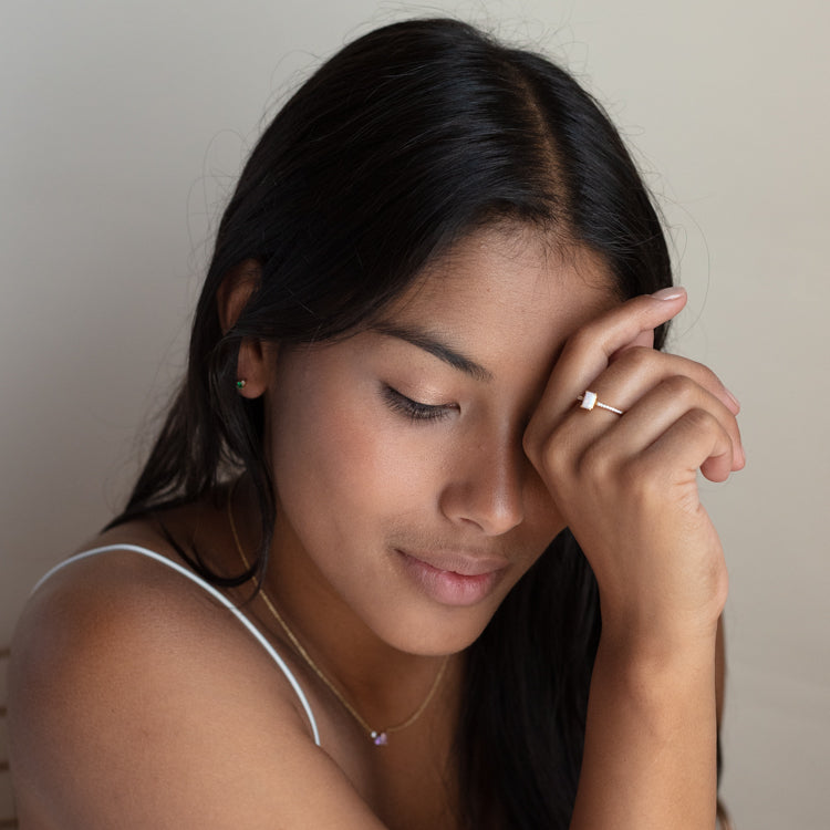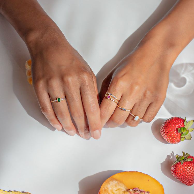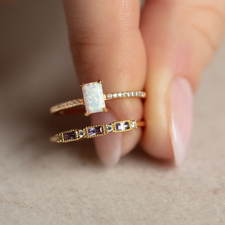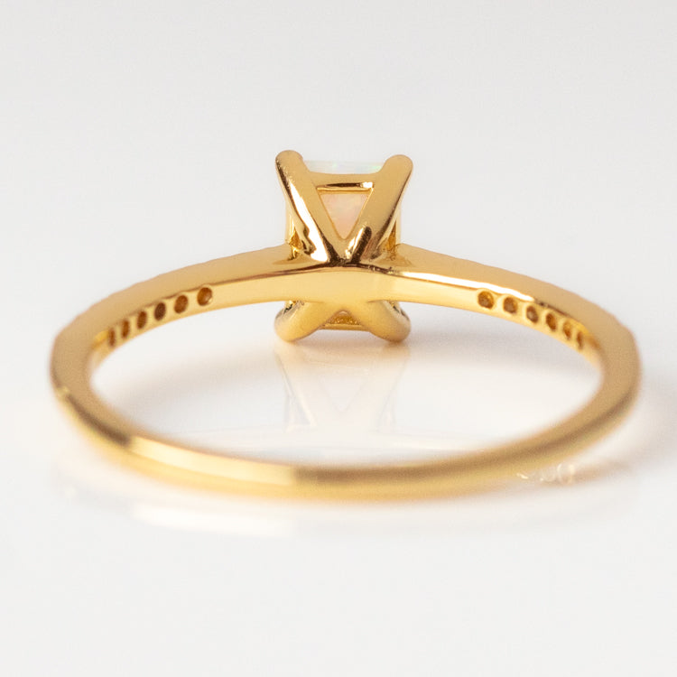 The Hopeful Opal Baguette Ring features a yellow gold pave cubic zirconia band with a simulated opal stone center to create a look that's both classic and whimsical.