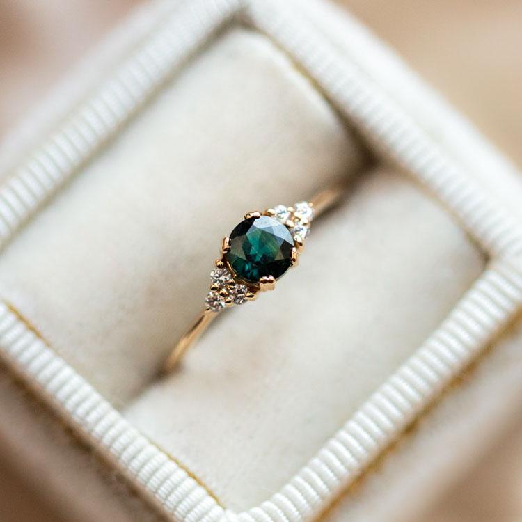 The Lune Ring features a tel sapphire celestial body orbited by a cluster of sparkling white brilliant cut diamonds. This stunning piece makes the ultimate alternative engagement ring. and it looks just as good on your right hand.