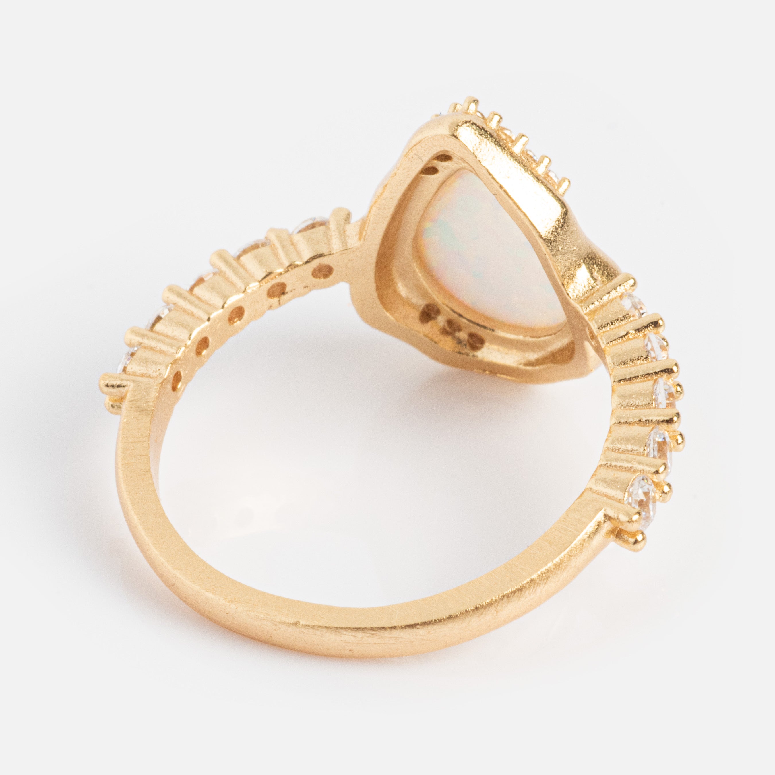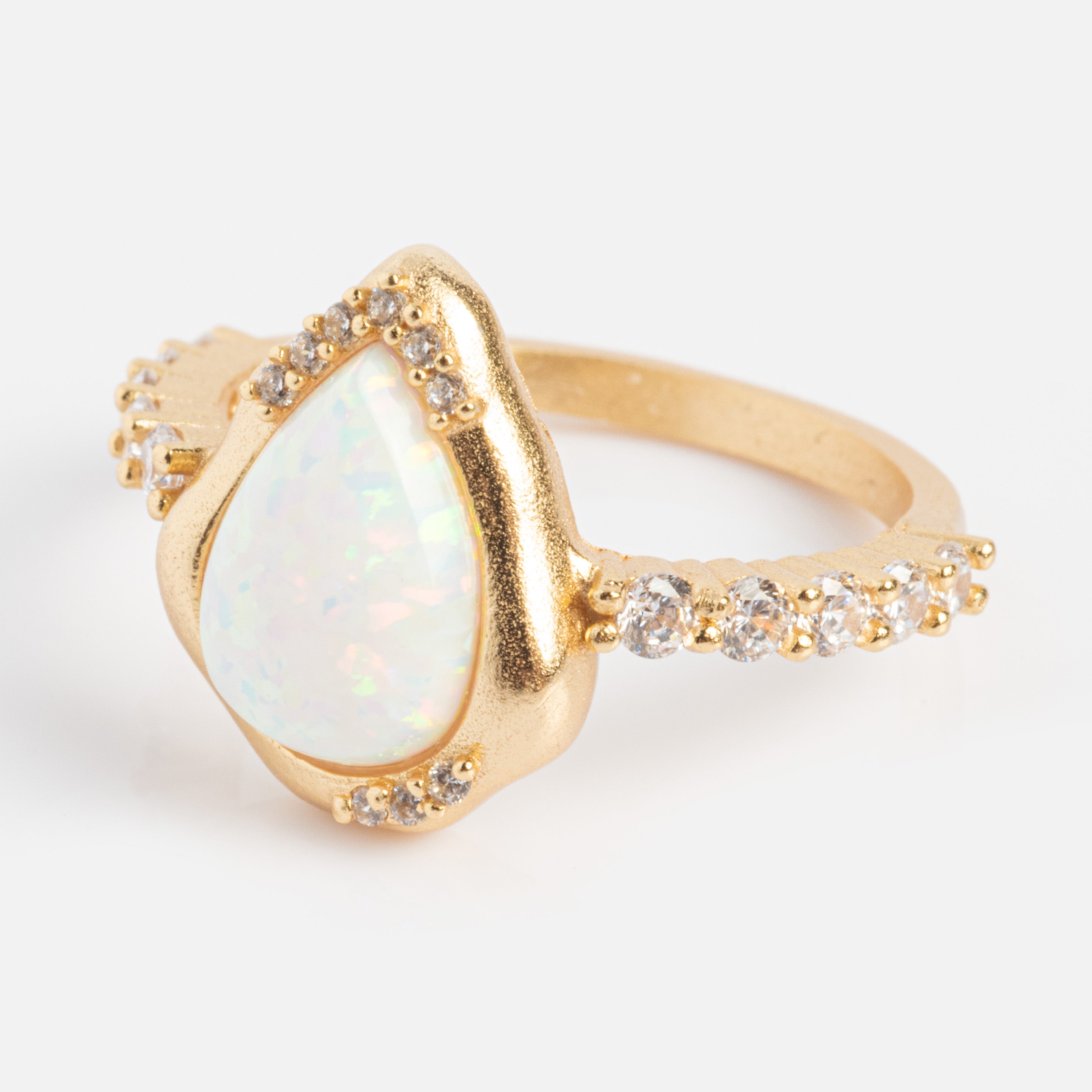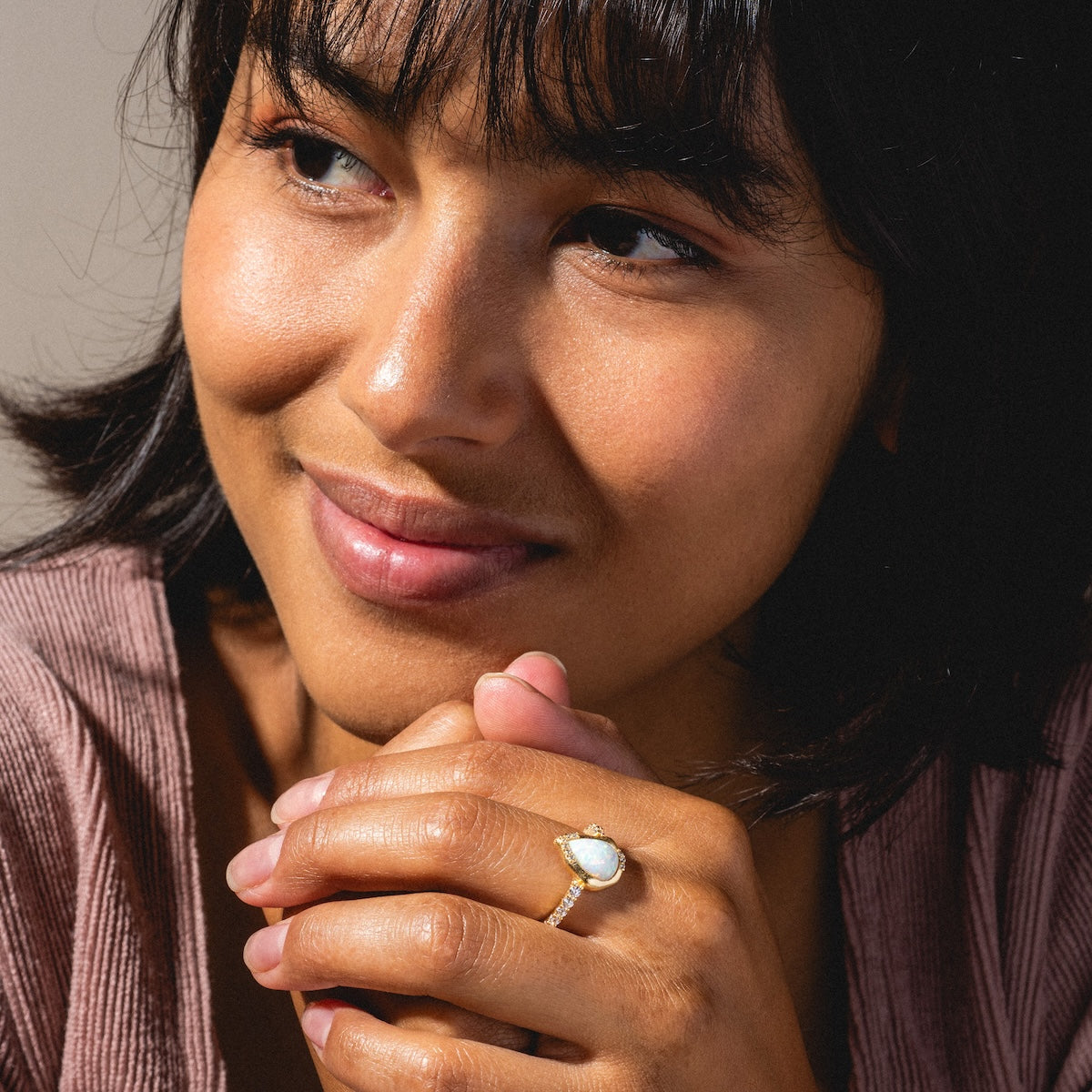The stunning Luster Solitaire Ring features a pear shaped genuine opal center in a textured gold setting set with sparkling CZs.