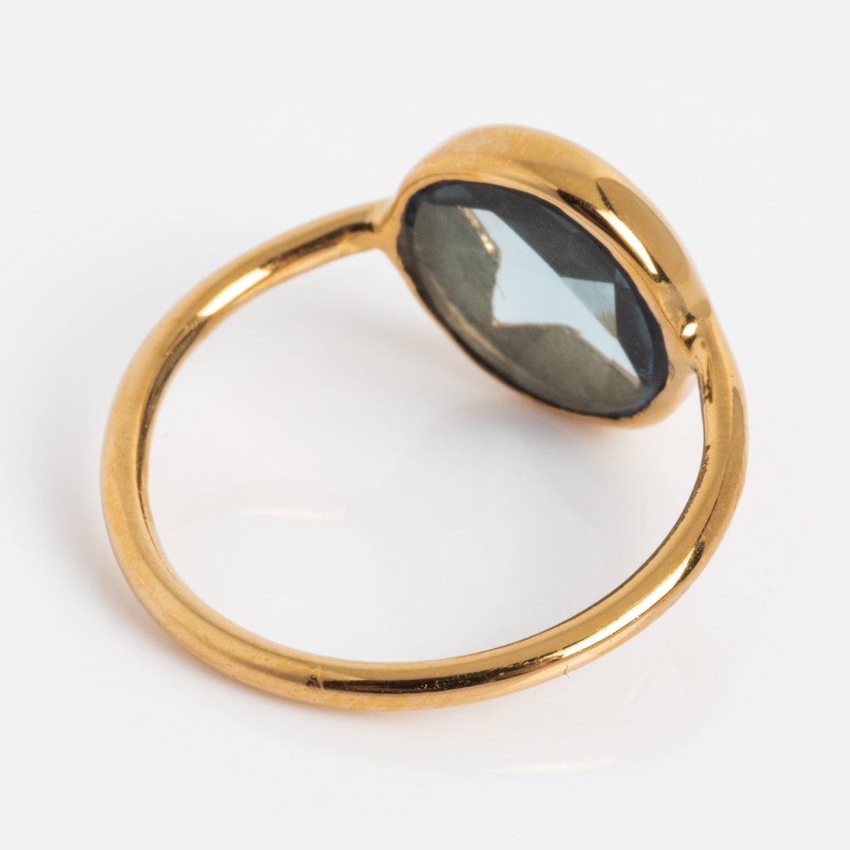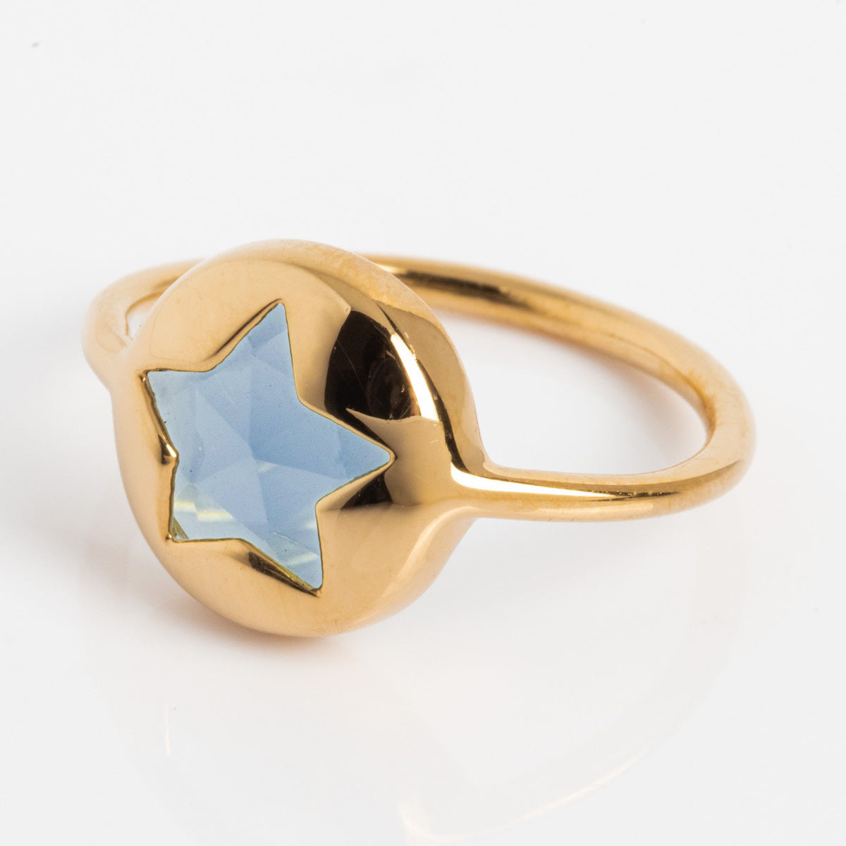 Be the brightest star with the Maomi Ring by Sophie Deschamps Bijoux. This gorgeous show-stopper features a stunning London blue topaz stone encapsulated by a golden overlay with a star cut-out.