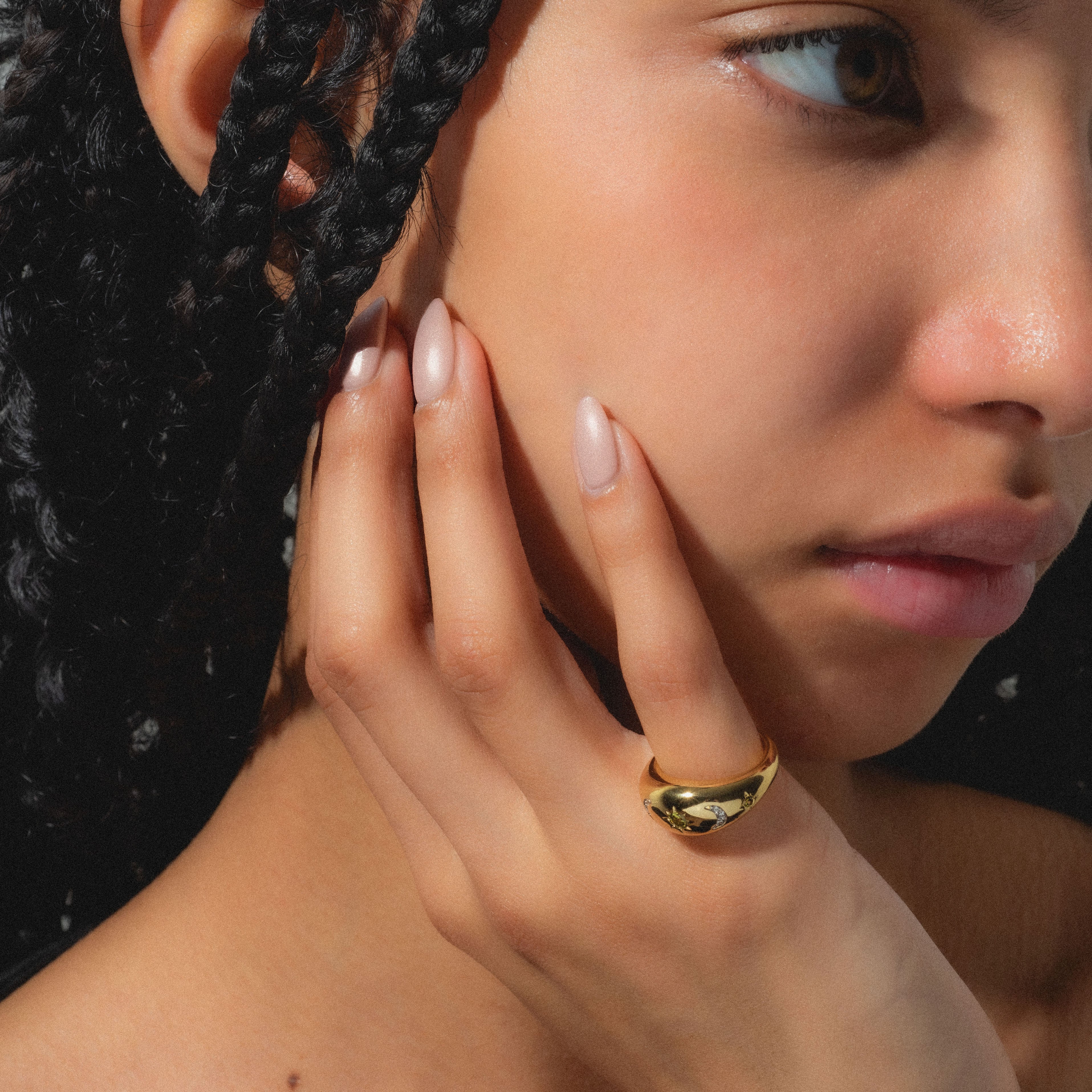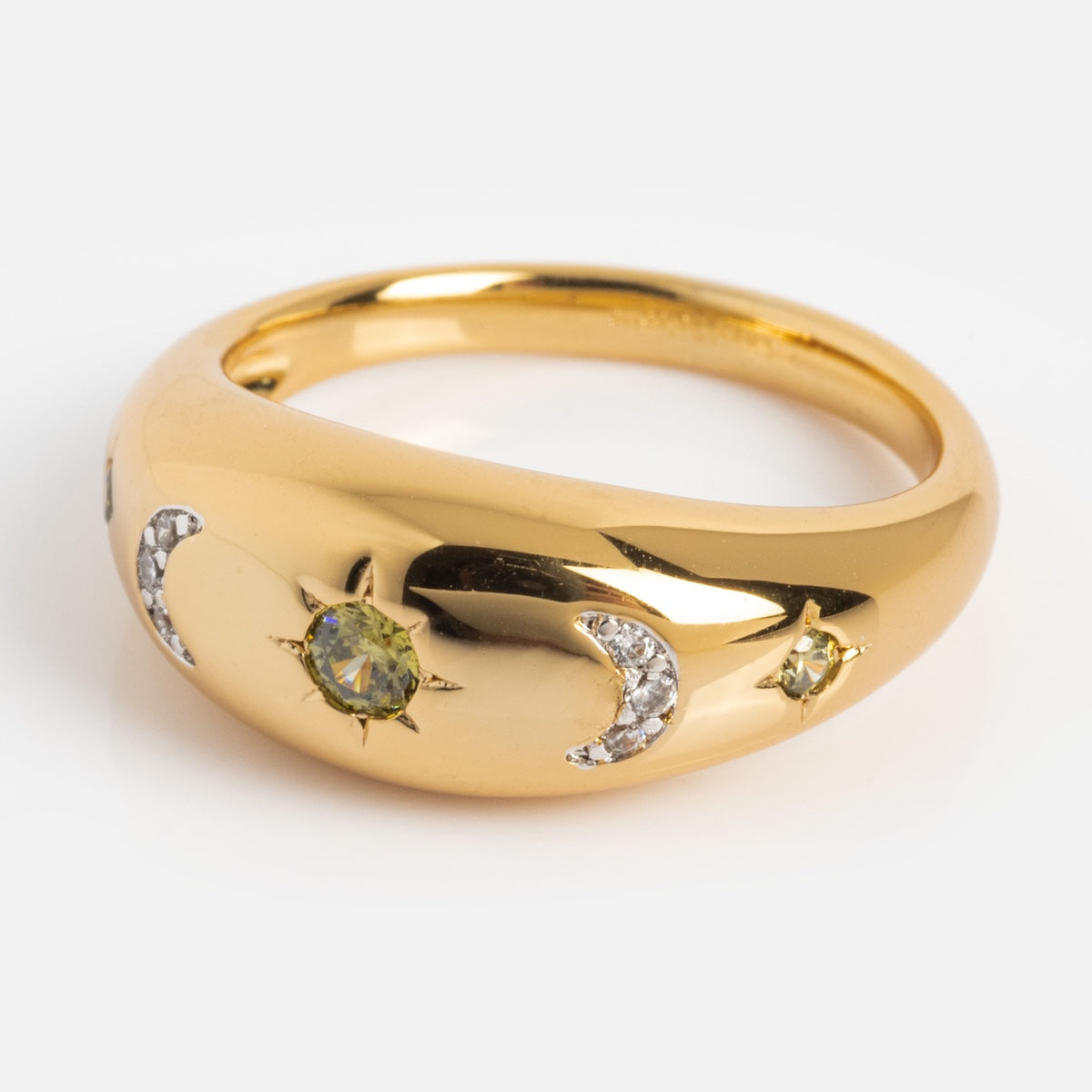 Shine like the moon and all her stars with the sparkling Moonstruck Bold Dome Ring by For You. With Love! This striking statement ring features shimmering celestial motifs on a gorgeous dome band and will give any look whimsically modern touch.