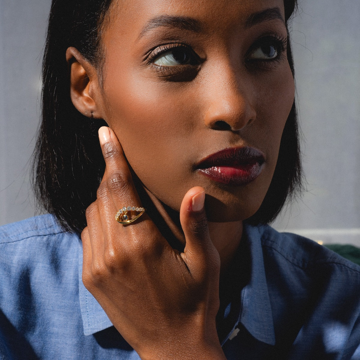 Ultra luxe sparkle and protective energy to boot - The Mystique Evil Eye Charm Ring features a gorgeous evil eye inspired design with sparkling gems and a charm drop center for a unique statement piece that invites good vibes only.