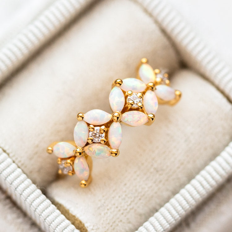 This floral ring has major fairy energy. featuring magical opal blooms punctuated by sparkling CZs set into yellow gold.