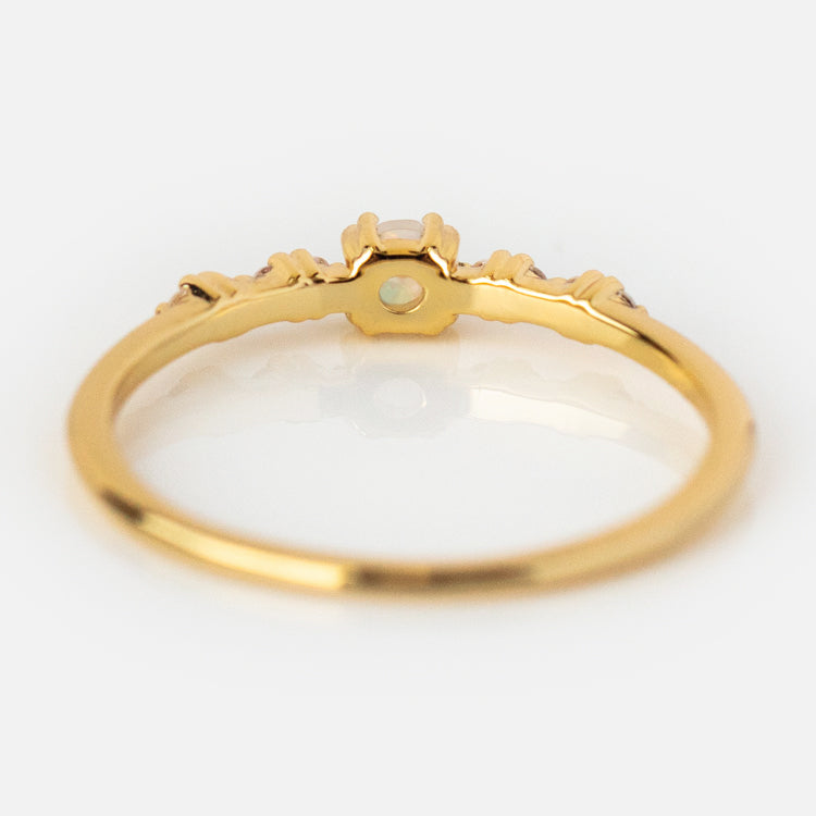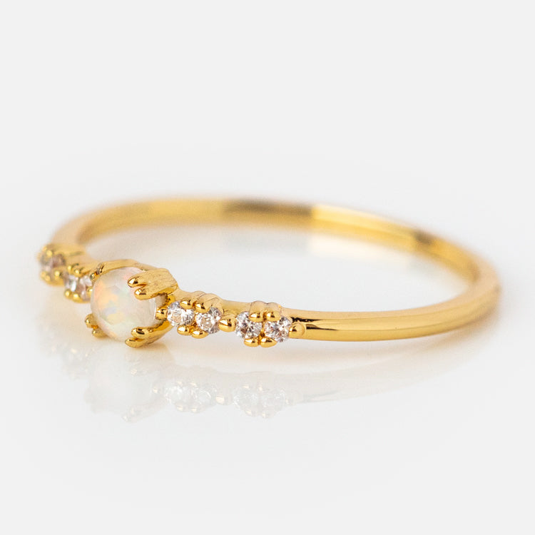 Opal glow and CZ sparkle: our favorite combination! This everyday gold ring features iridescent simulated opal with sparkling CZs set on either side in a delicate band.