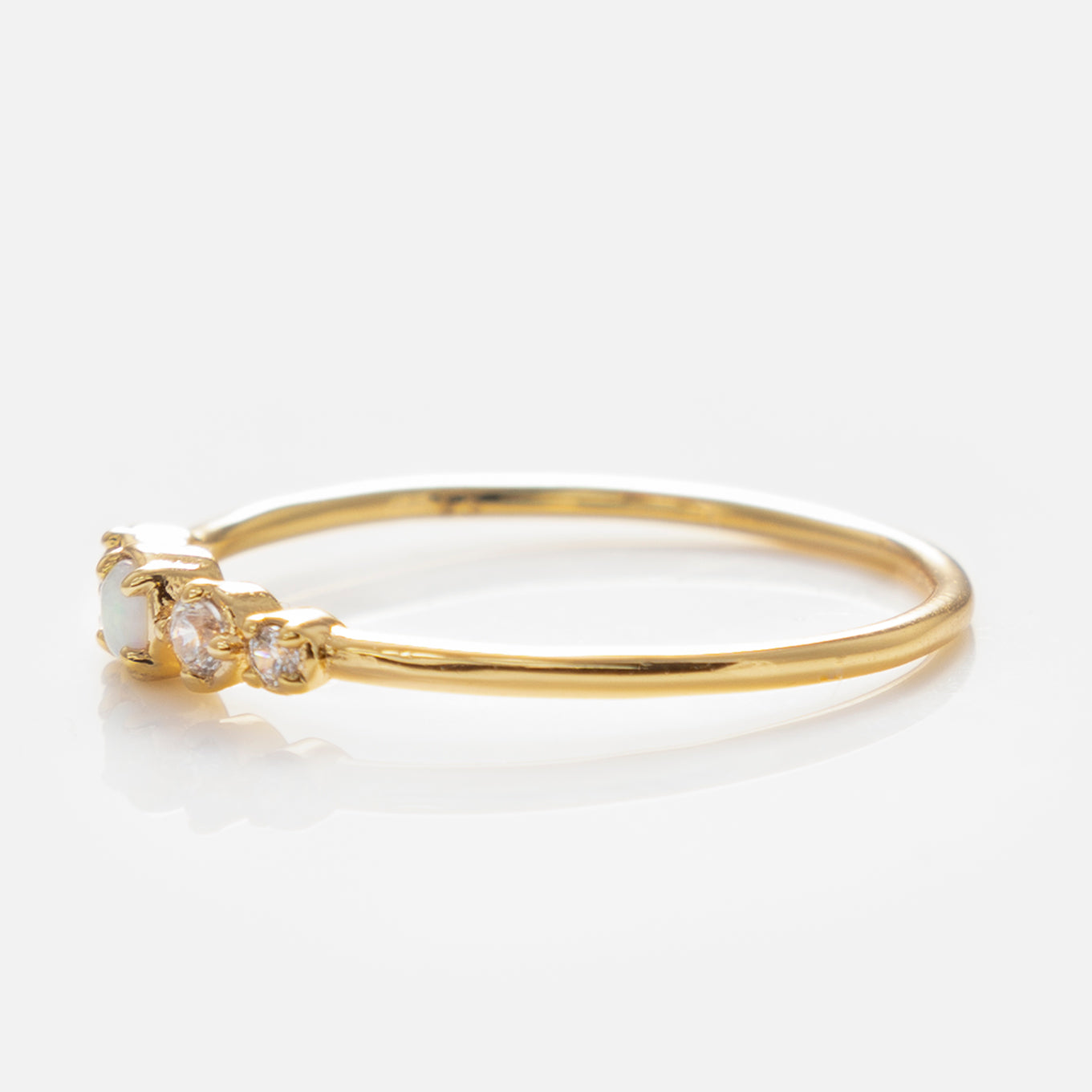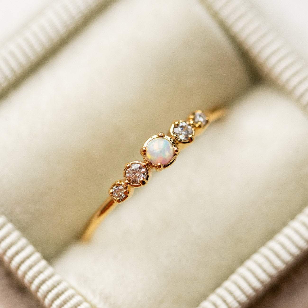 The Opal Stacking Ring from Elizabeth Stone features a center shimmering opal surrounded on either side by supremely sparkling CZ's. The ultra thin band makes this the perfect dainty ring to stack with!