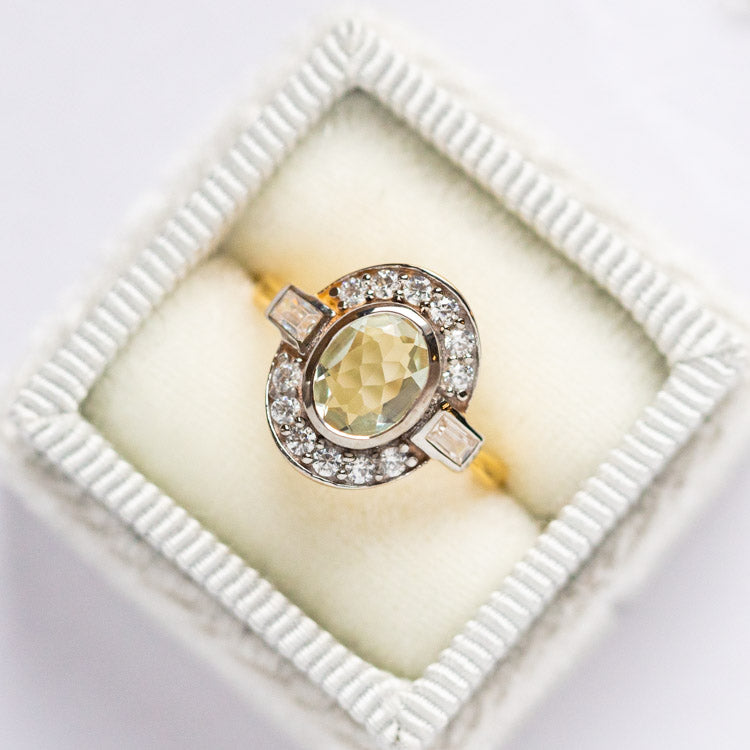 Reminiscent of art deco. this stunning ring by Carrie Elizabeth features a glowing green amethyst surrounded by shimmering cubic zirconia.