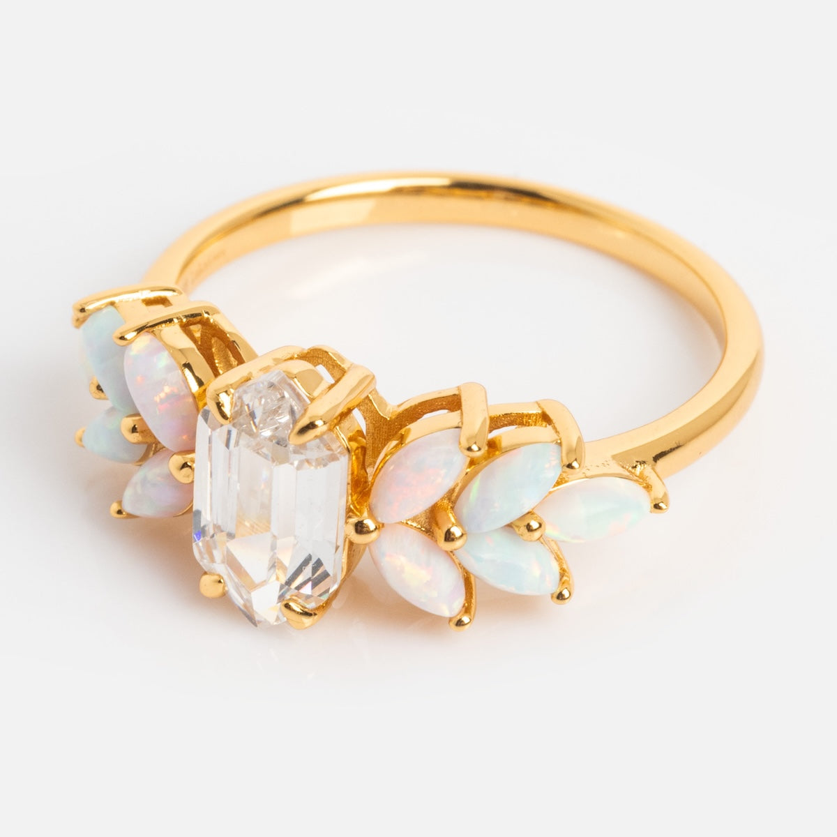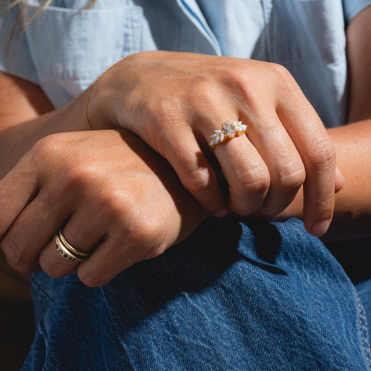 The Pink Opal Ombre and Topaz Lotus Ring is fit for a fairytale. This dreamy stunner features a crown of luminescent pastel opals surrounding a dazzling white topaz center stone - fit to adorn any look with everything that dreams are made of.