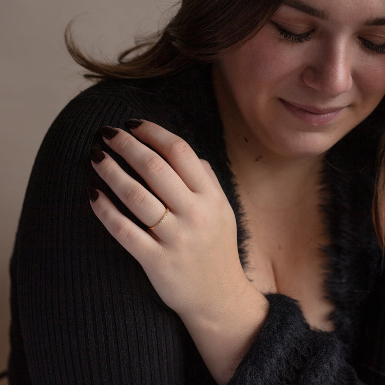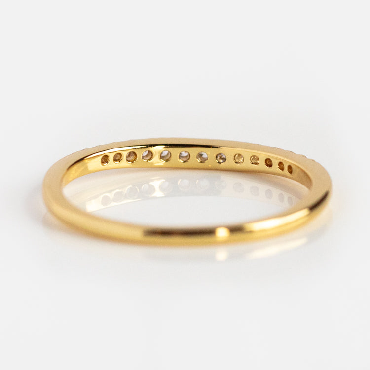 The perfect ring for everyday wear. This delicate band features varying sizes of cubic zirconia set in a 14k yellow gold plated band. Simple. special. and made for stacking.