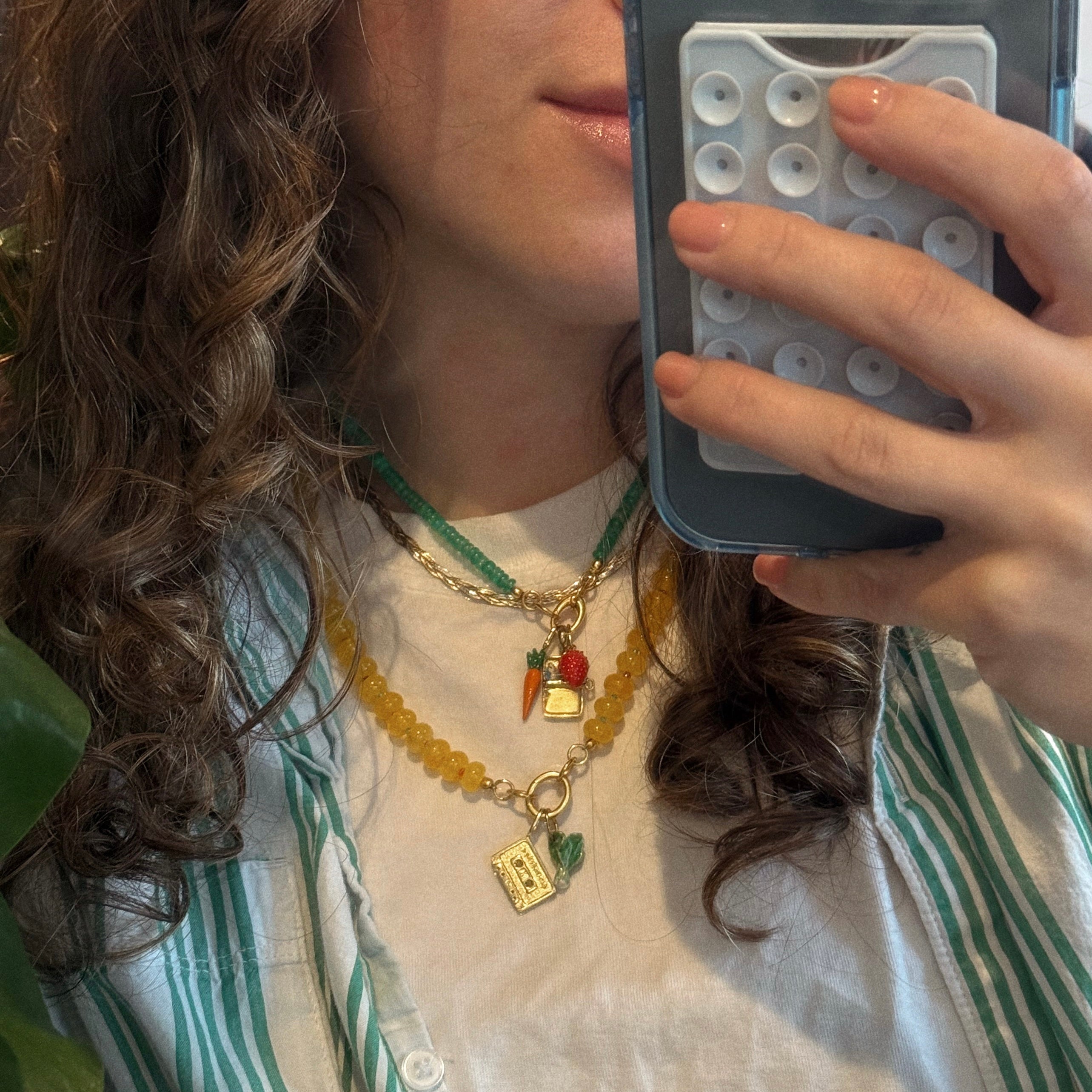 These colorful gemstone statement necklaces combine the two hottest trends of the summer: beaded necklaces and charms! Wear this necklace with the charm holder in the front to show off your favorite charms. or shift it to the back of your neck for a traditional beaded necklace look. These necklaces are made with natural stones and are available in two lengths for all your layering needs.