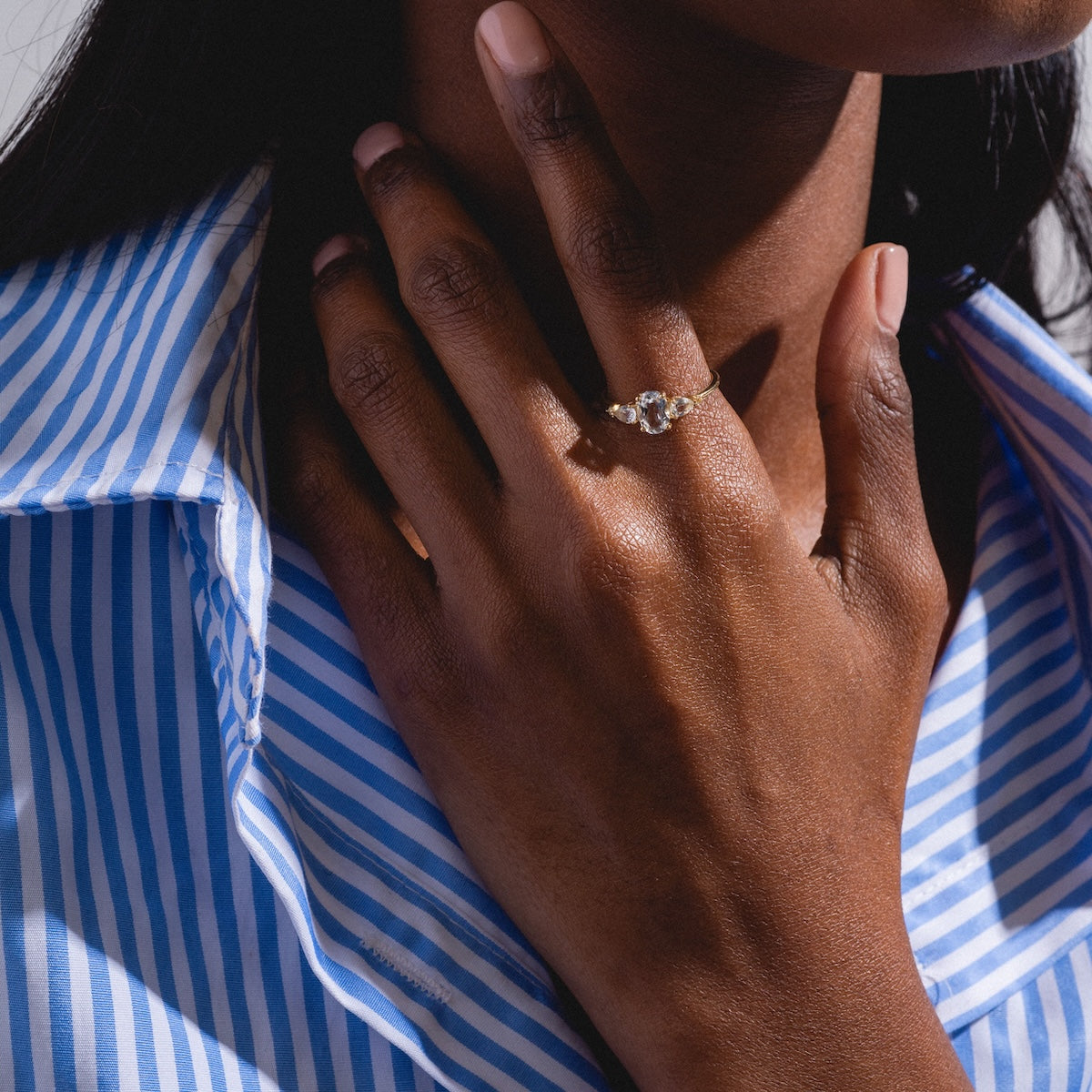 The Solid Gold 2025 April Capsule Classic White Topaz Statement Ring is an impressive take on a classic side stone setting. This ultra classic ring features a stunning oval cut white topaz elegantly flanked with sparkling tear drop and round side stones.