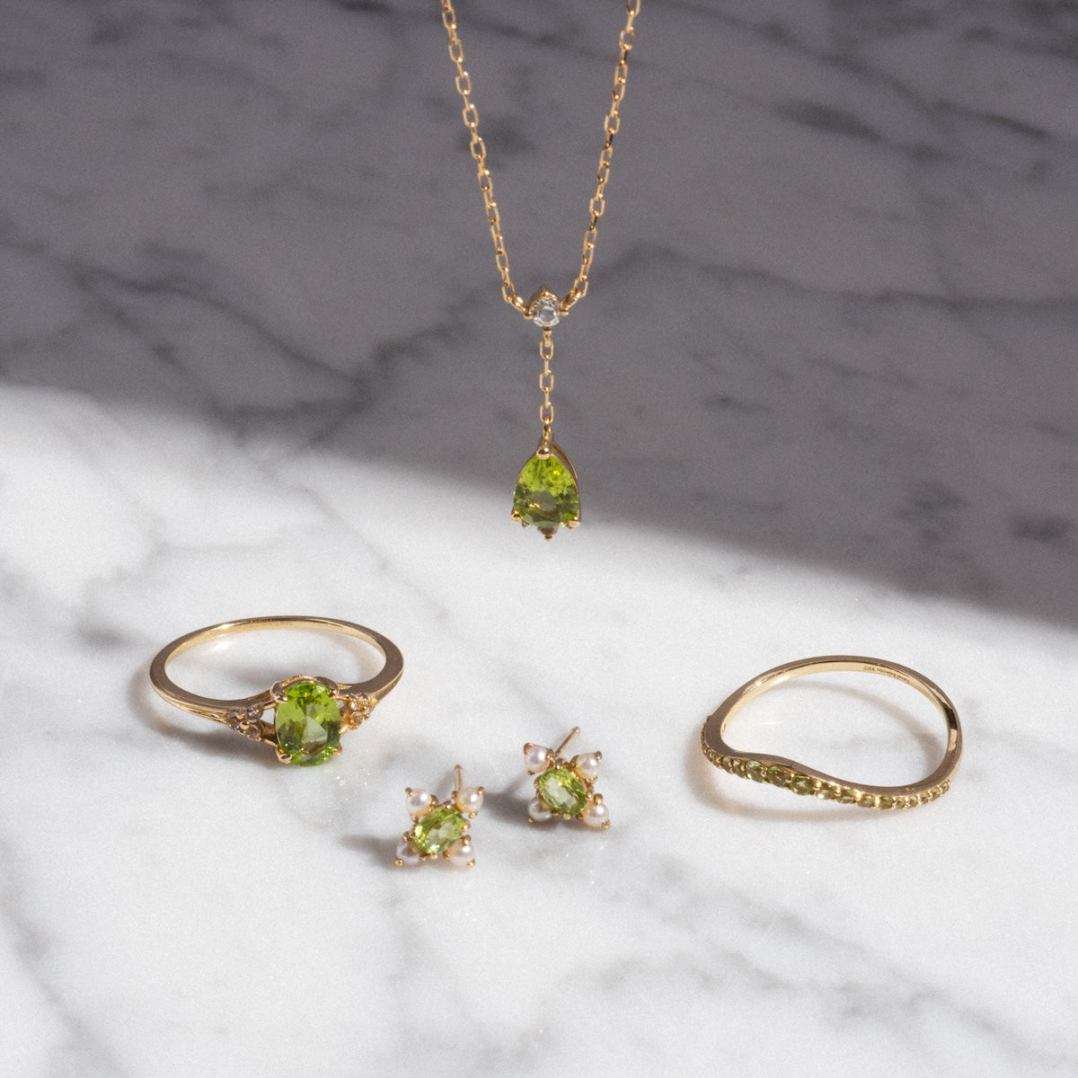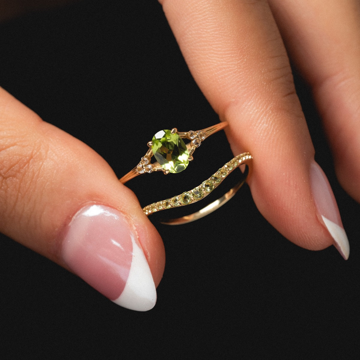The Solid Gold 2025 August Capsule Classic Peridot Statement Ring is elegantly classic. featuring a striking peridot oval center with sparkling white topaz accents on a classic solid gold band.