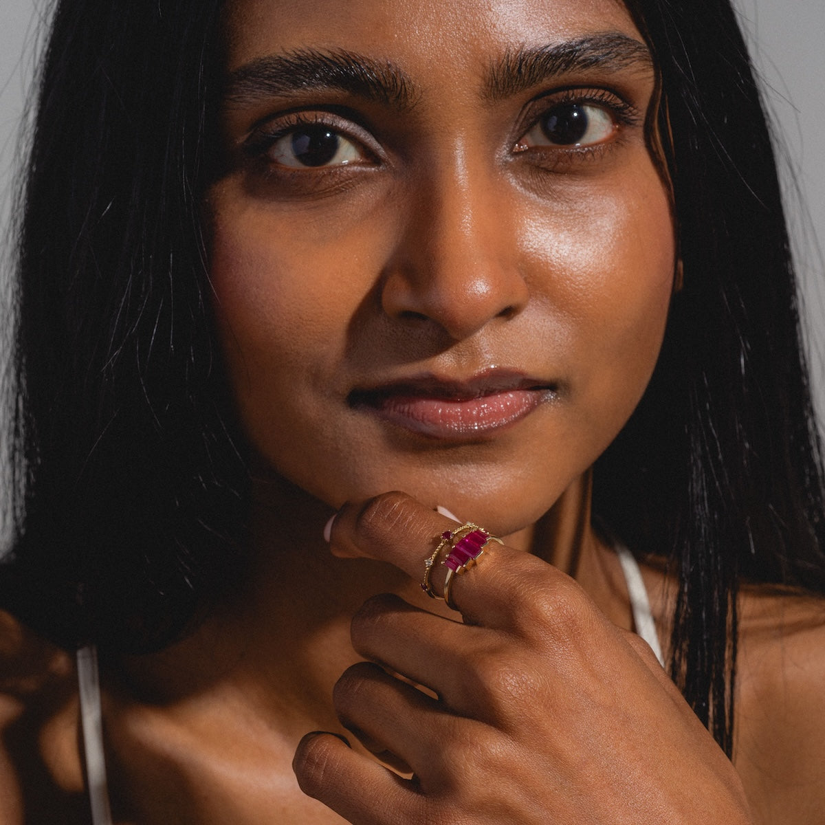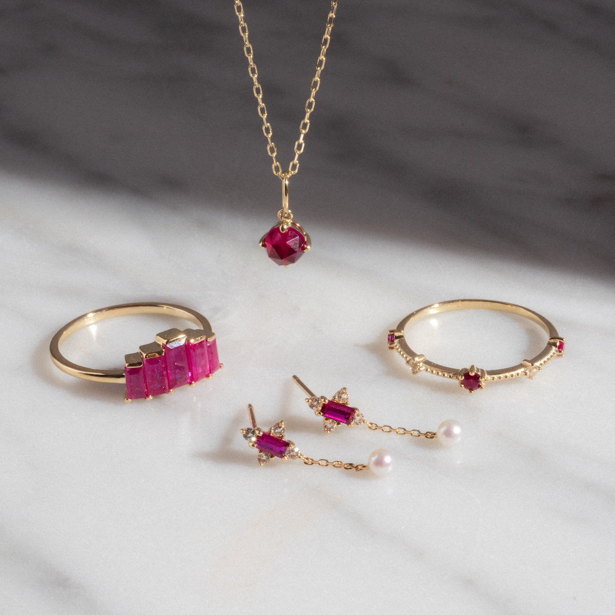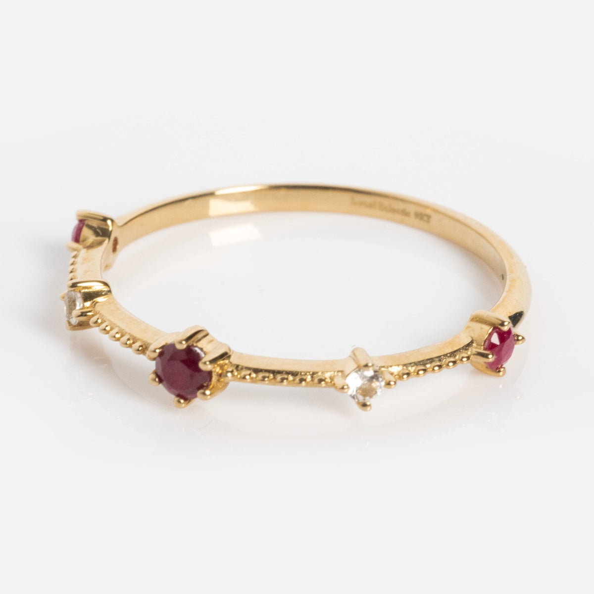 The Solid Gold 2025 July Capsule Delicate Ruby Stacking Ring is beautifully ornate with delicate decorative detail. Featuring luminous ruby and white topaz accents on a slim milgrain band. this stunning solid gold stacker will add the perfect sparkling accent to any stack.