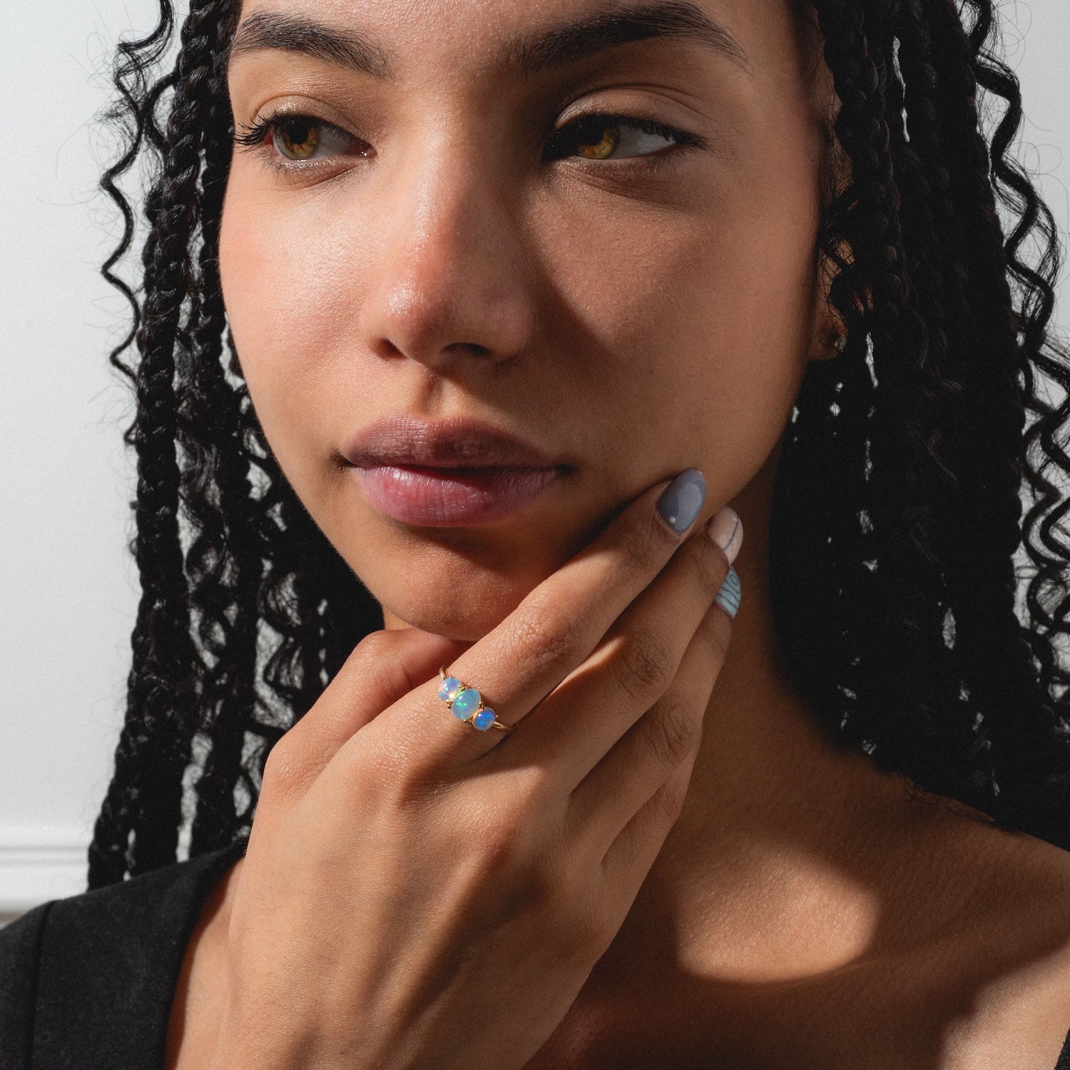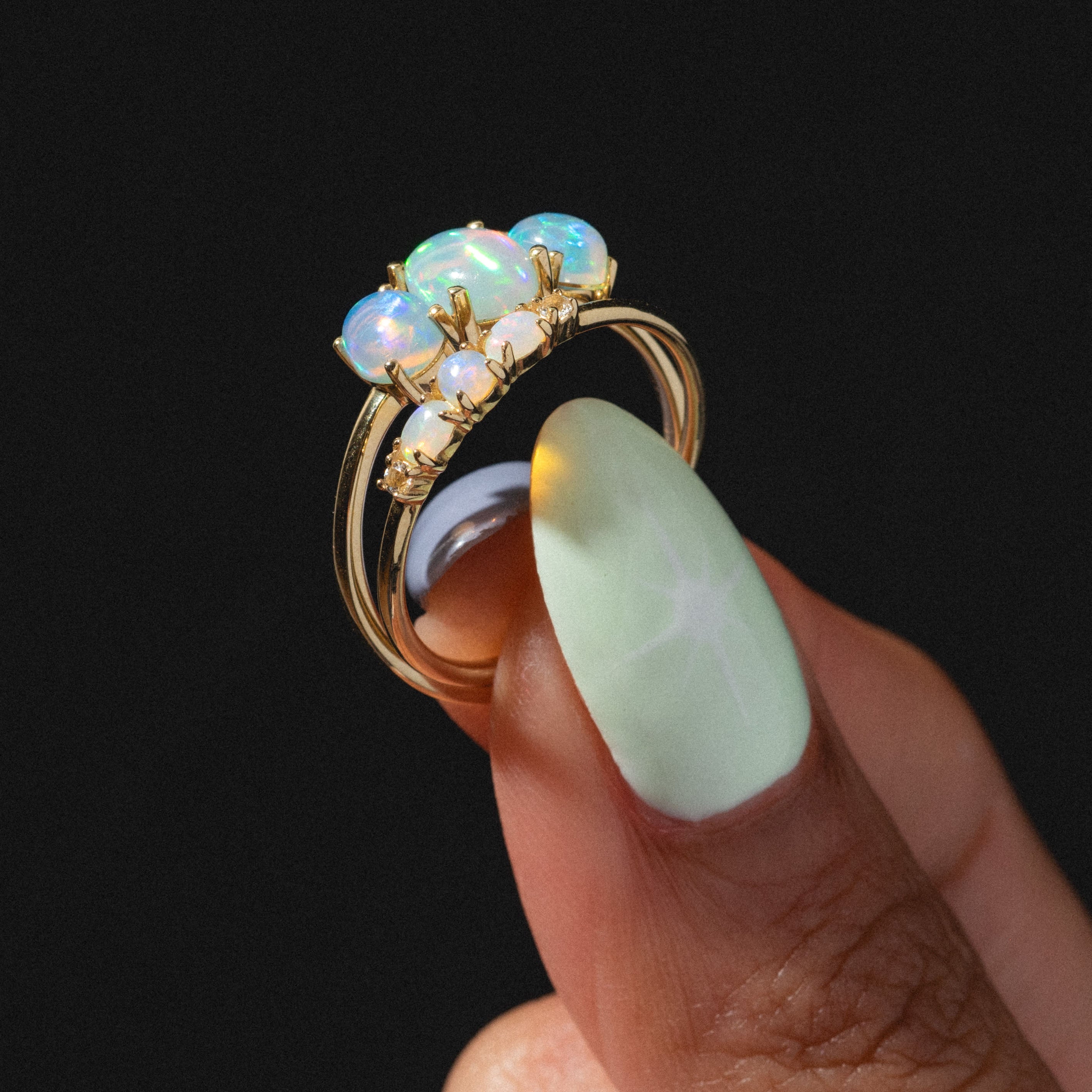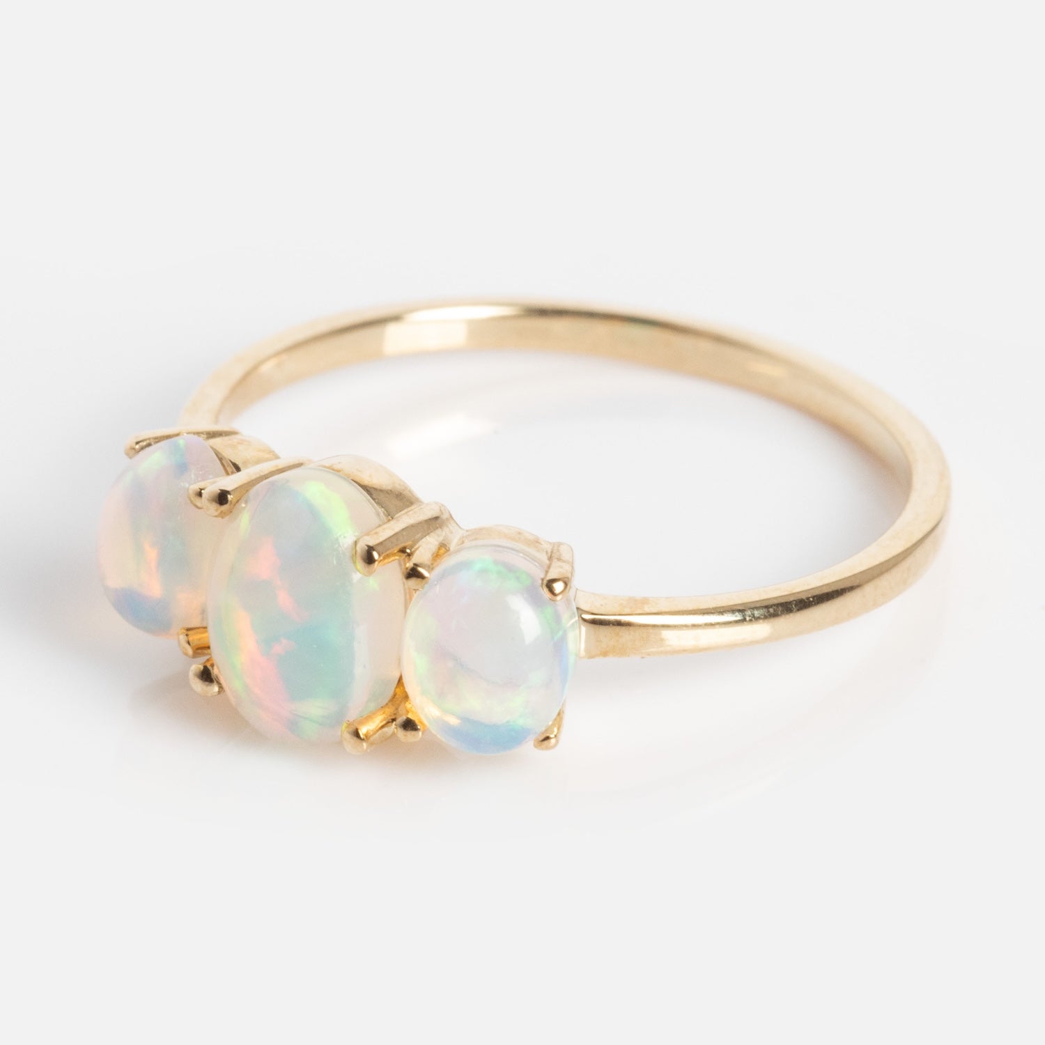 The Solid Gold 2025 October Capsule Classic Opal Trio Statement Ring is a strikingly luminescent take on a classic trio setting with glowing opal stones on sleek solid yellow gold band.