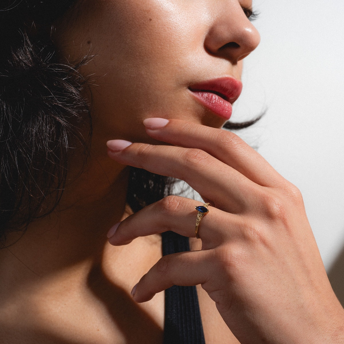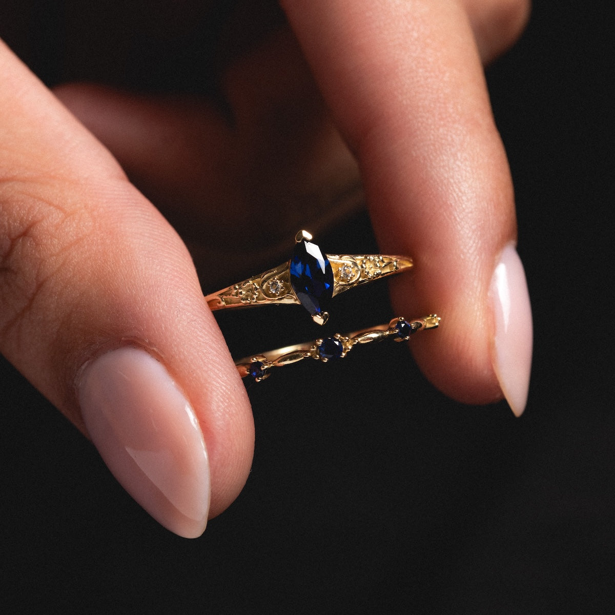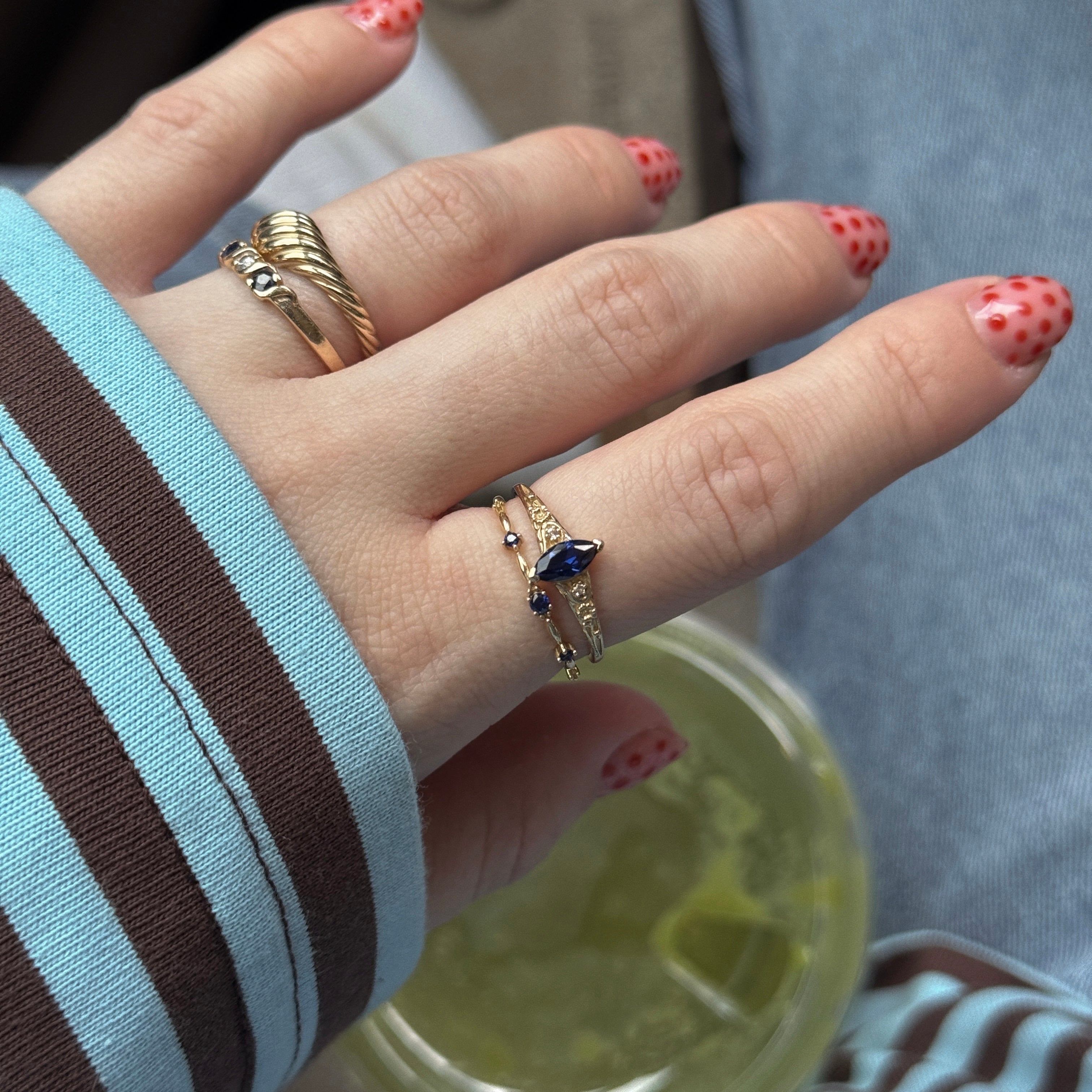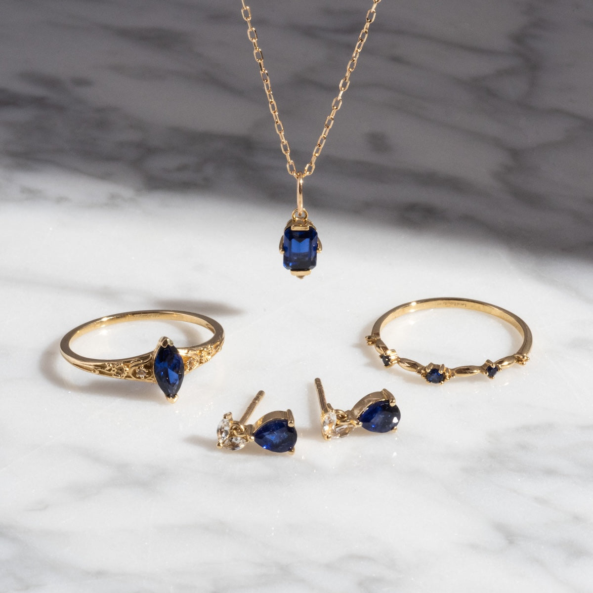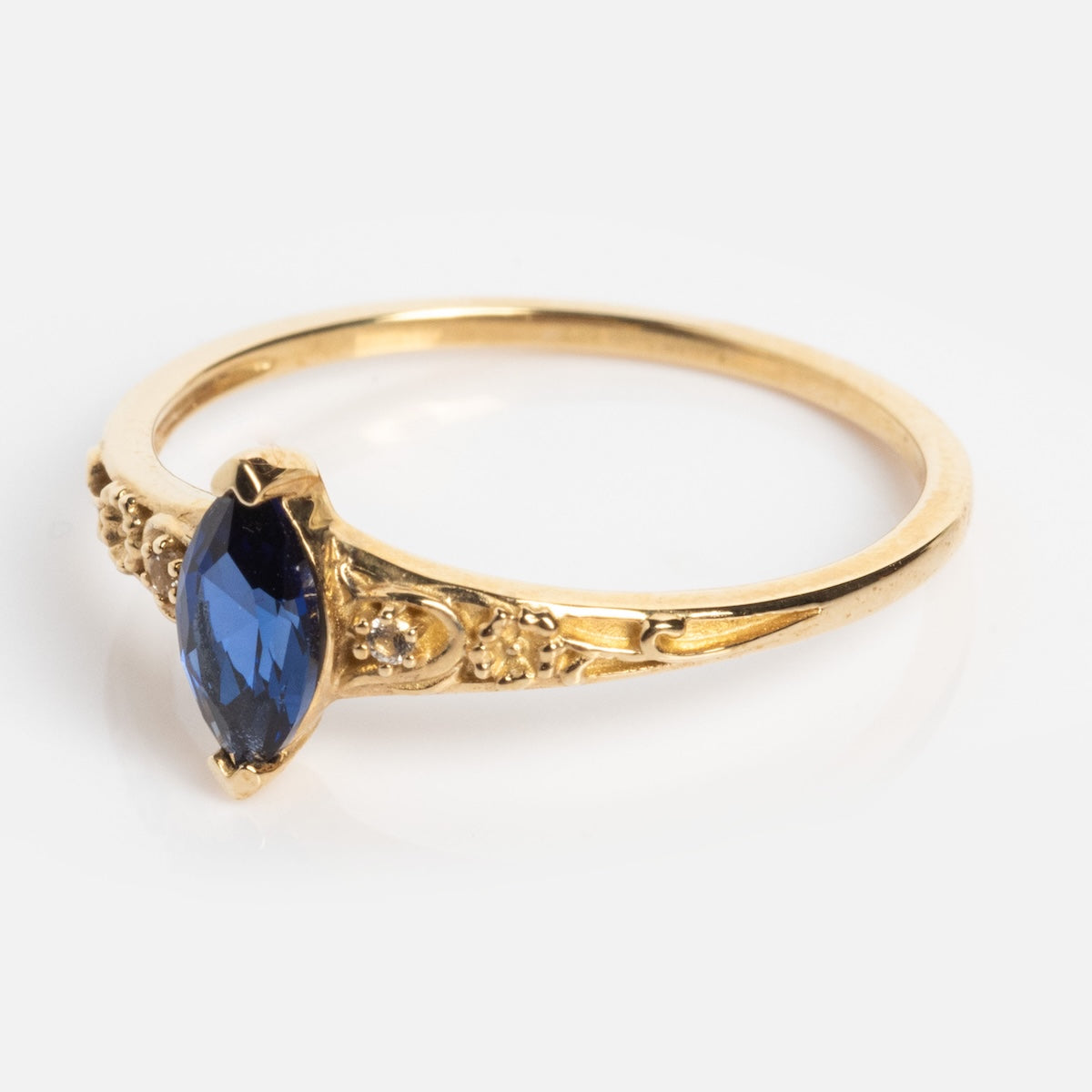 The Solid Gold 2025 September Capsule Classic Blue Sapphire Statement Ring is equal parts classic and detailed with a striking lab created blue sapphire center set in a solid gold filigree design flecked with sparkling white topaz.