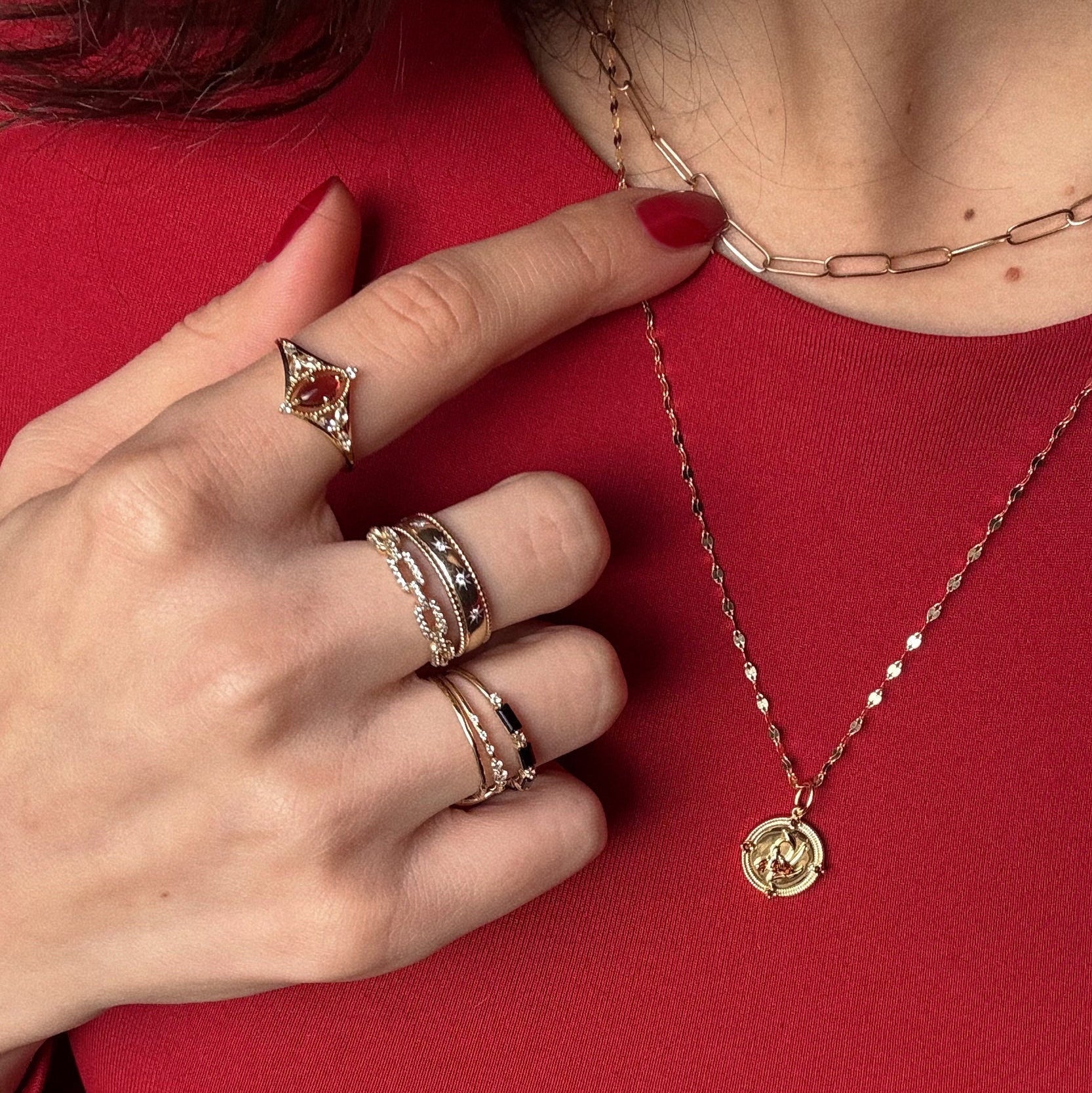 Commemorate the start of the new year or a special someone's January birthday in vintage glamour with the Solid Gold 2026 January Capsule Art Deco Garnet Ring. Crafted in 9k solid yellow gold with fiery red garnet gemstones set in a dazzling vintage inspired setting. this stunning ring is the perfect gift for any lover of garnet.