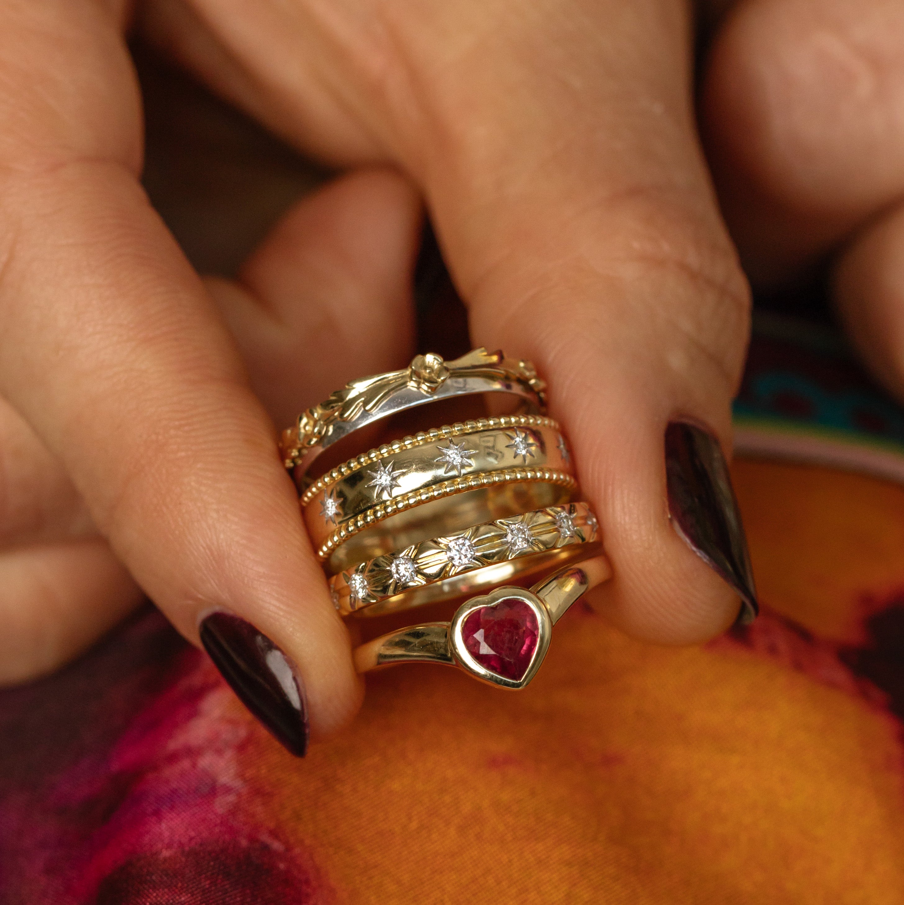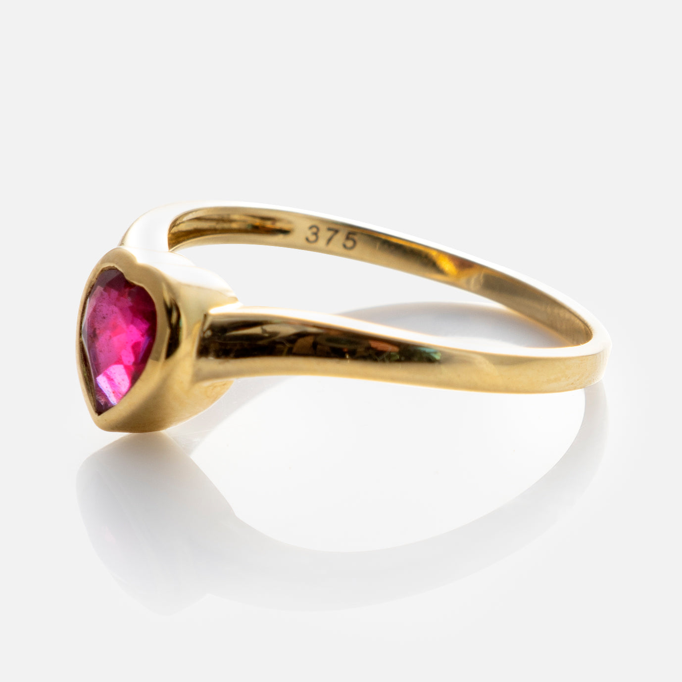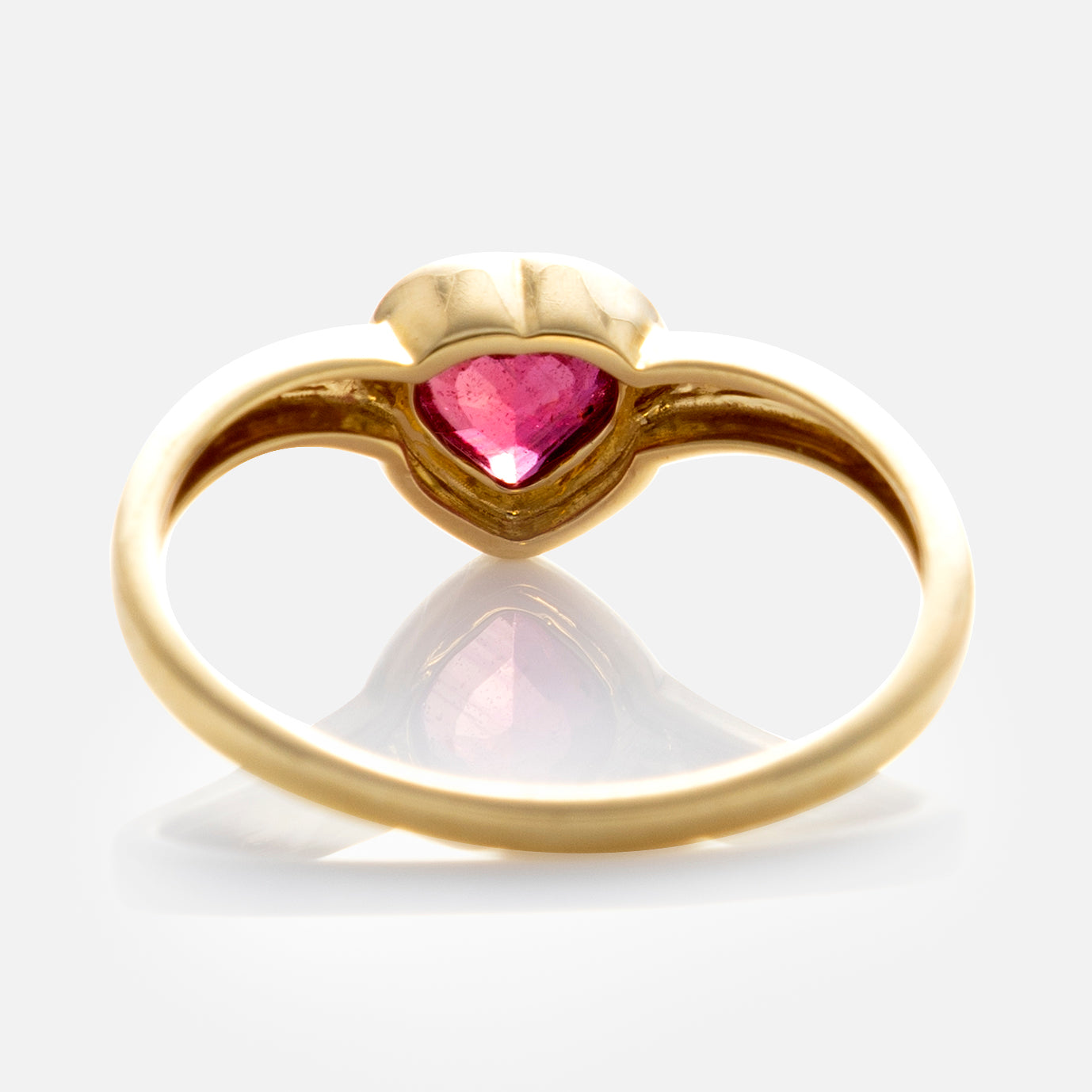 This ring is like a love note. Adorned with a sweet little heart shaped. bezel set ruby. this solid gold band is a precious every day staple.