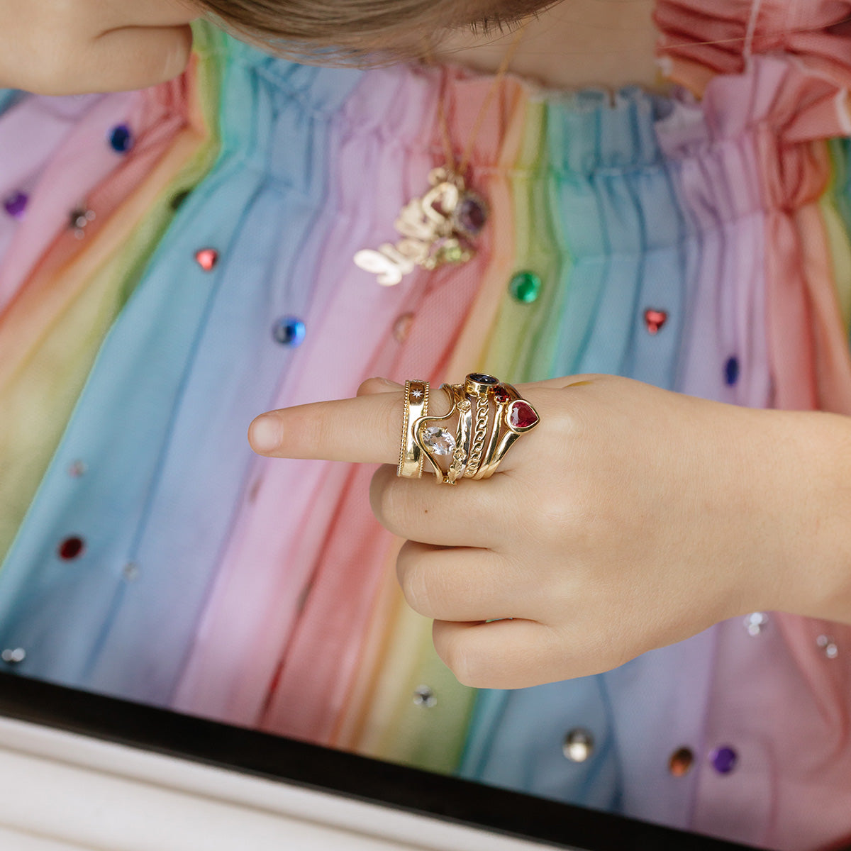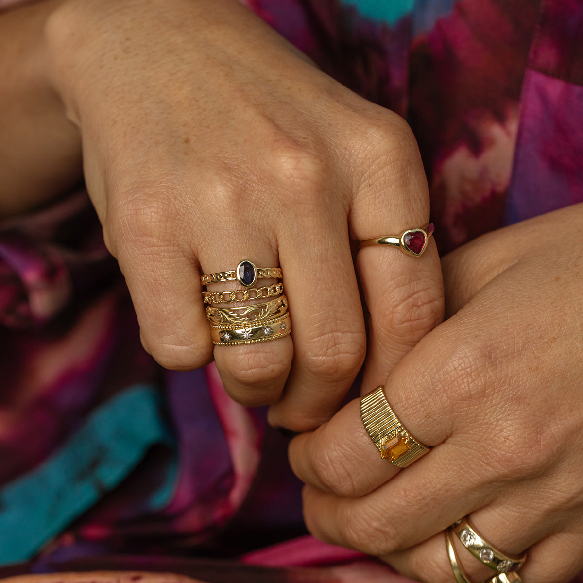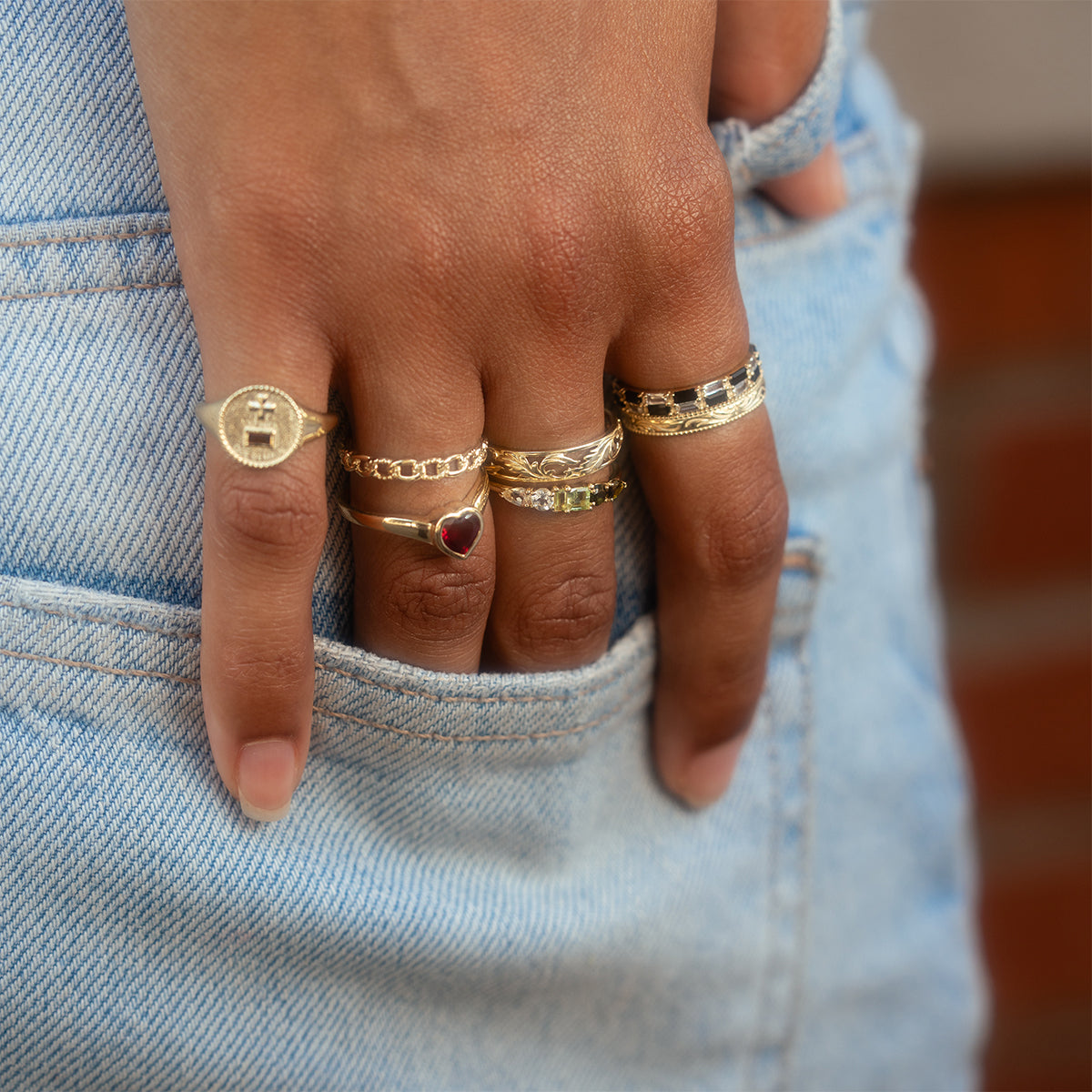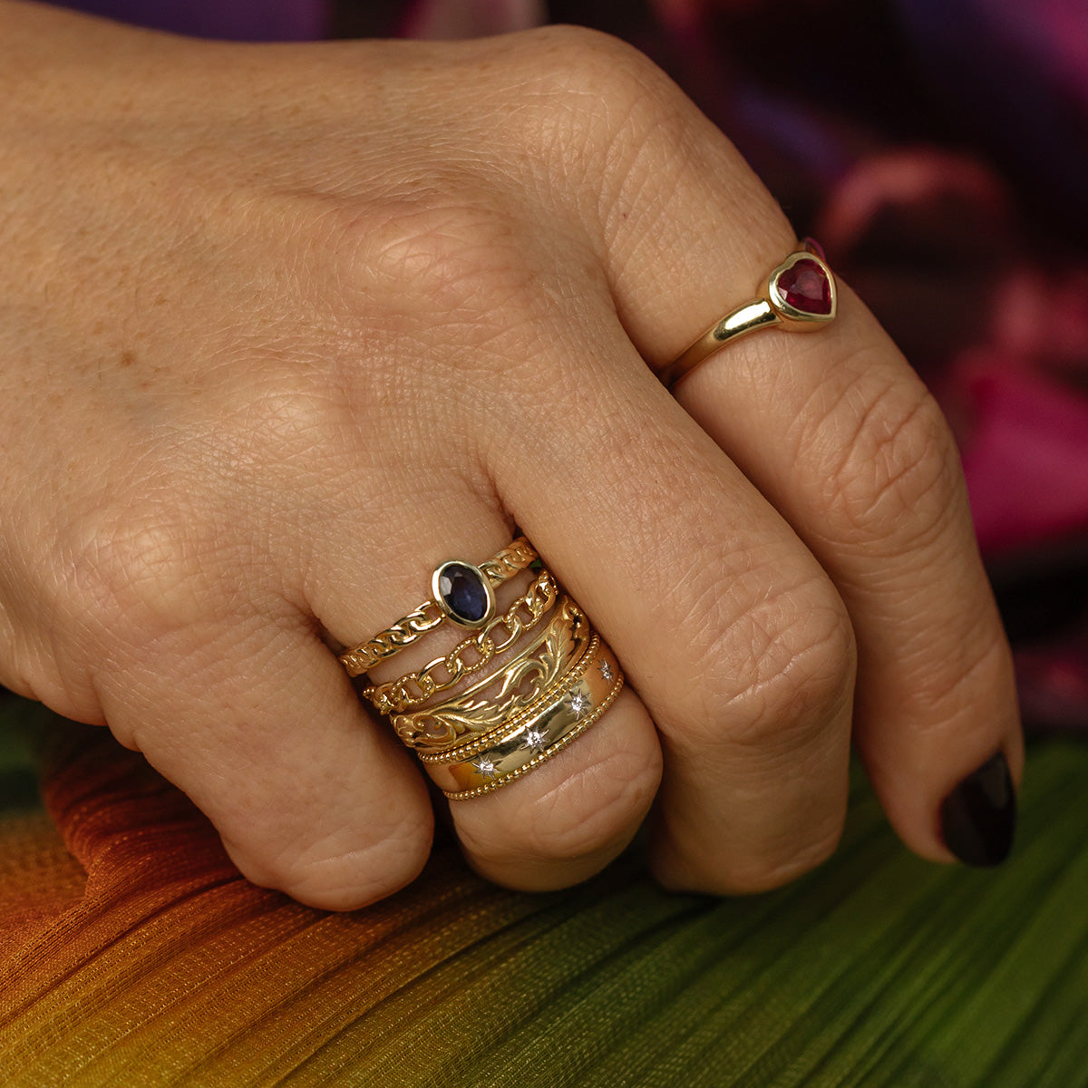 This ring is like a love note. Adorned with a sweet little heart shaped. bezel set ruby. this solid gold band is a precious every day staple.