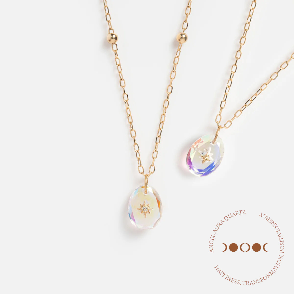 Angel Aura Quartz (note: the design on this necklace slightly differs. stone is not set in a bezel) : Happiness. Transformation. Positive Energy
