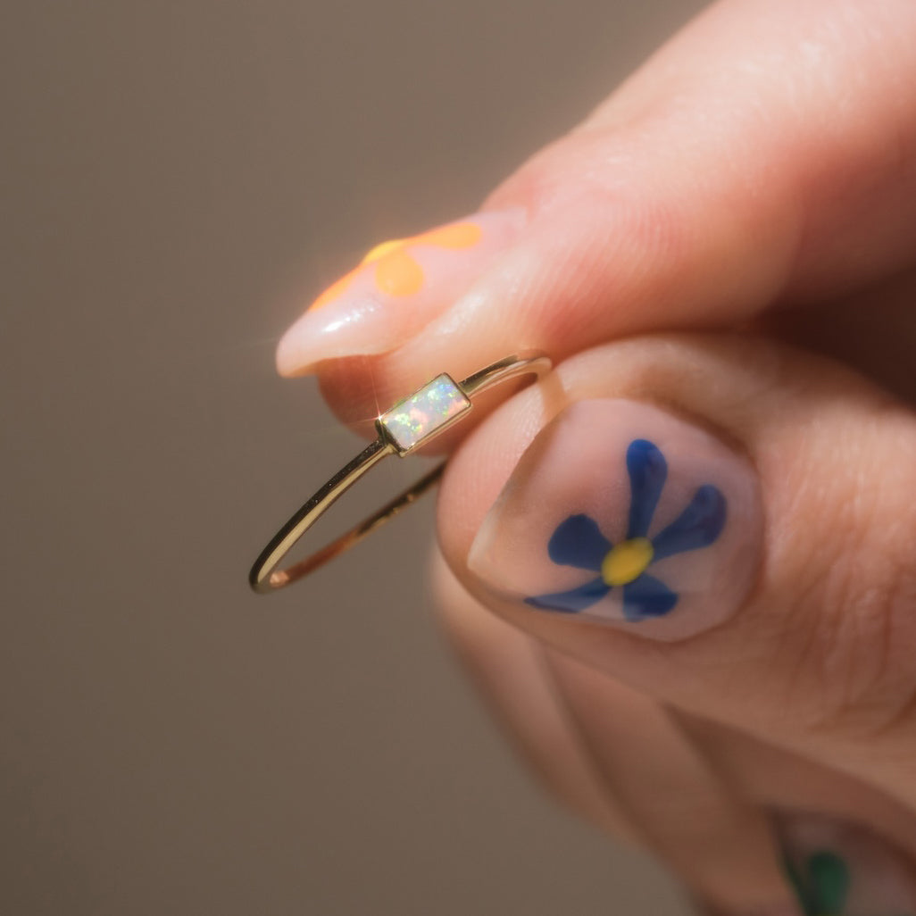 This Solid Gold Delicate Opal Ring showcases a beautifully delicate design and boasts a stunning opal gemstone. The perfect balance of elegance and simplicity. this ring is the perfect addition to any jewelry collection.