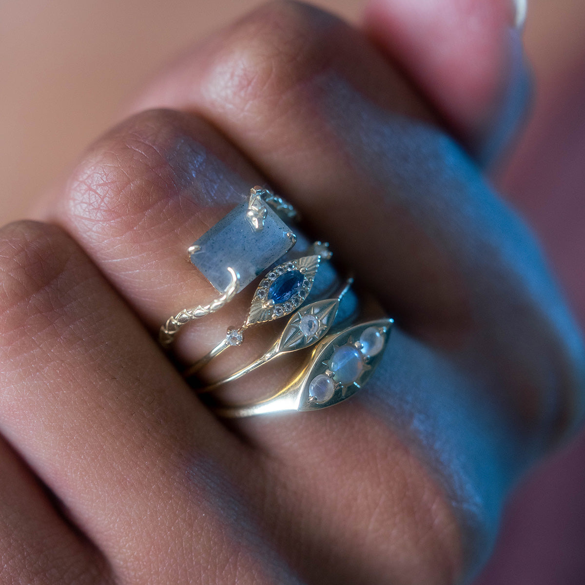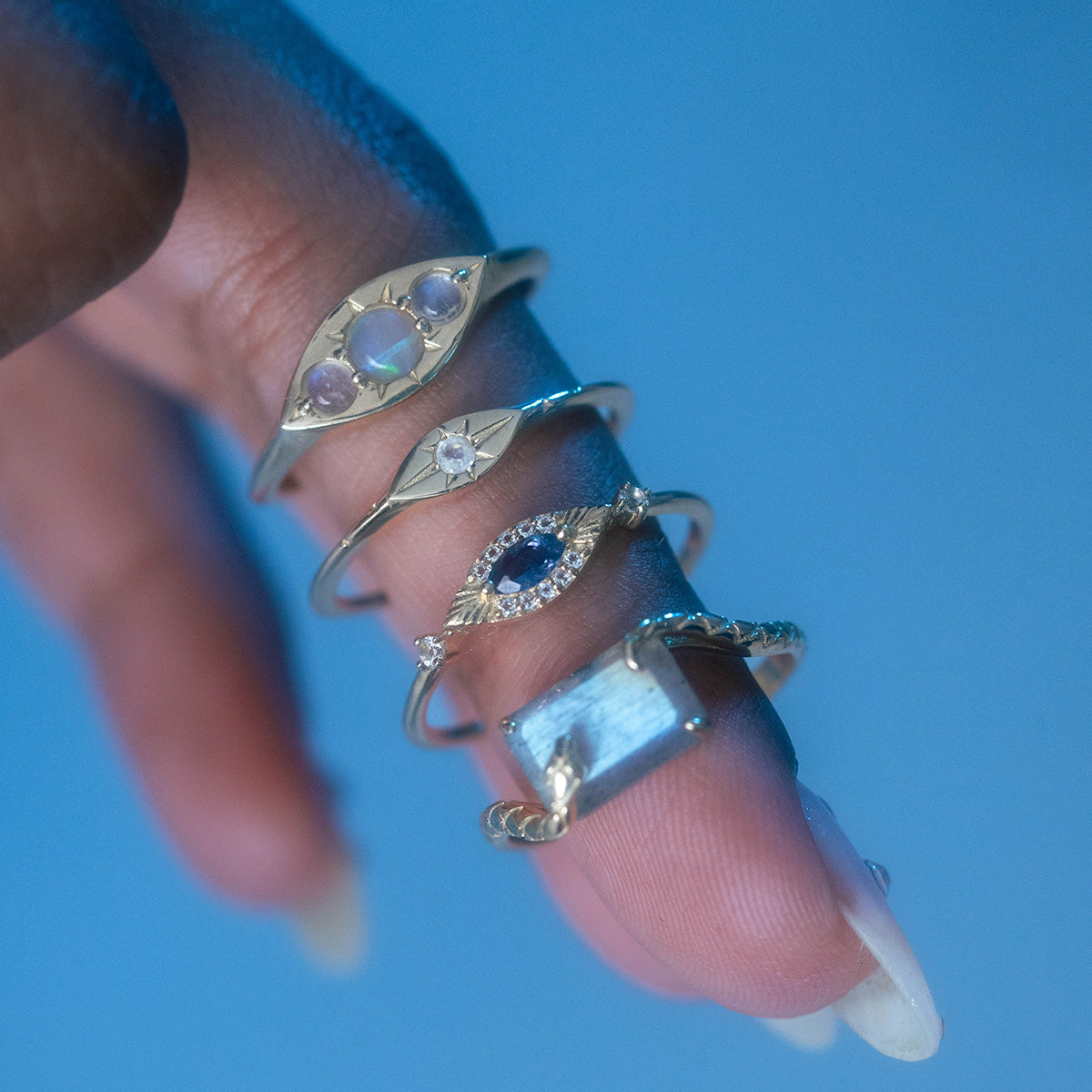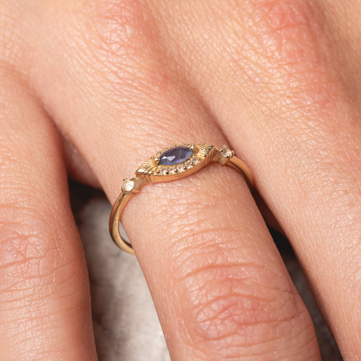 Mystical intrigue and protective energy combined in this delicately ornate solid gold evil eye ring by Harvest Moon. An awe-strikingly hued Iolite surrounded by white topaz give this stunning ring an almost magical soft shimmer.