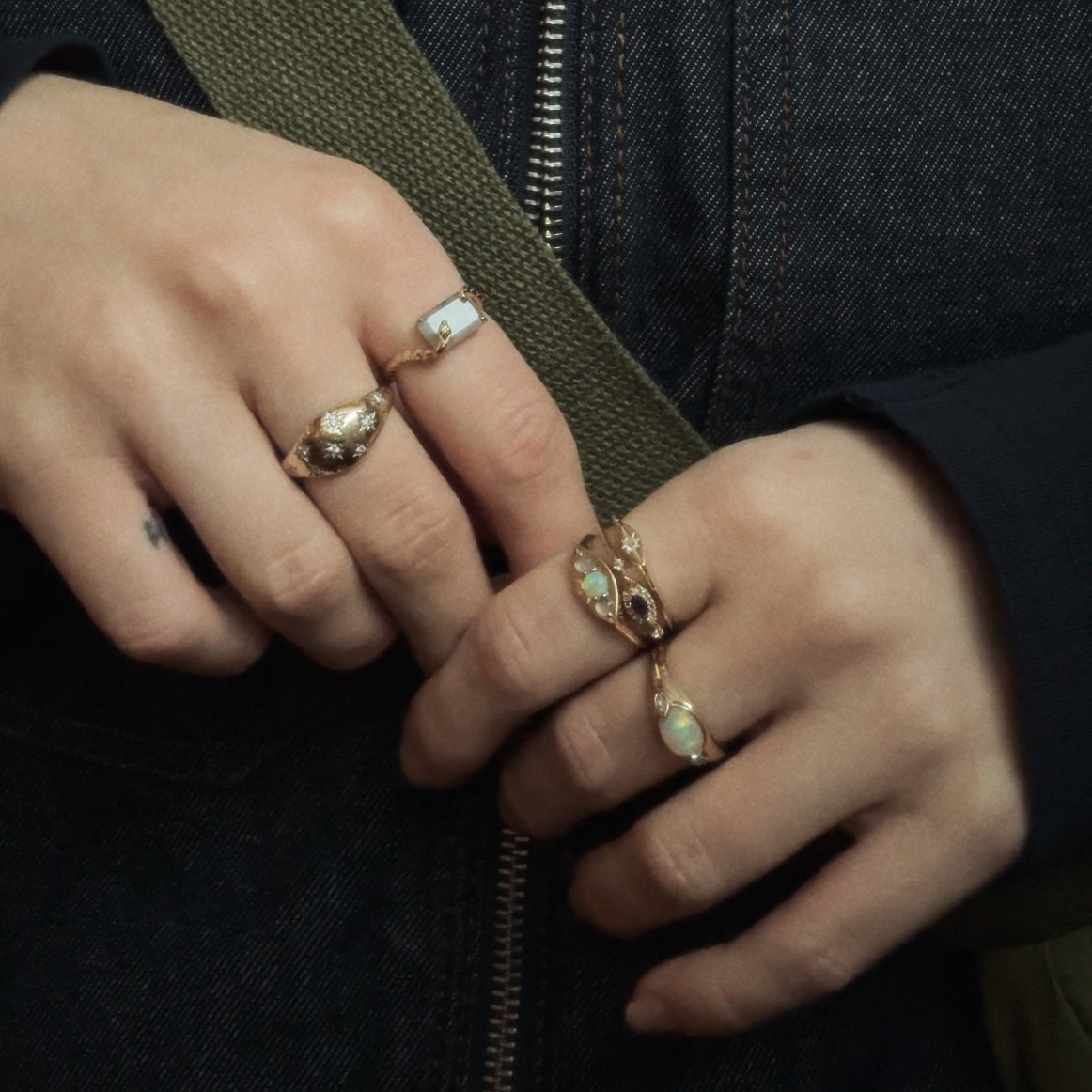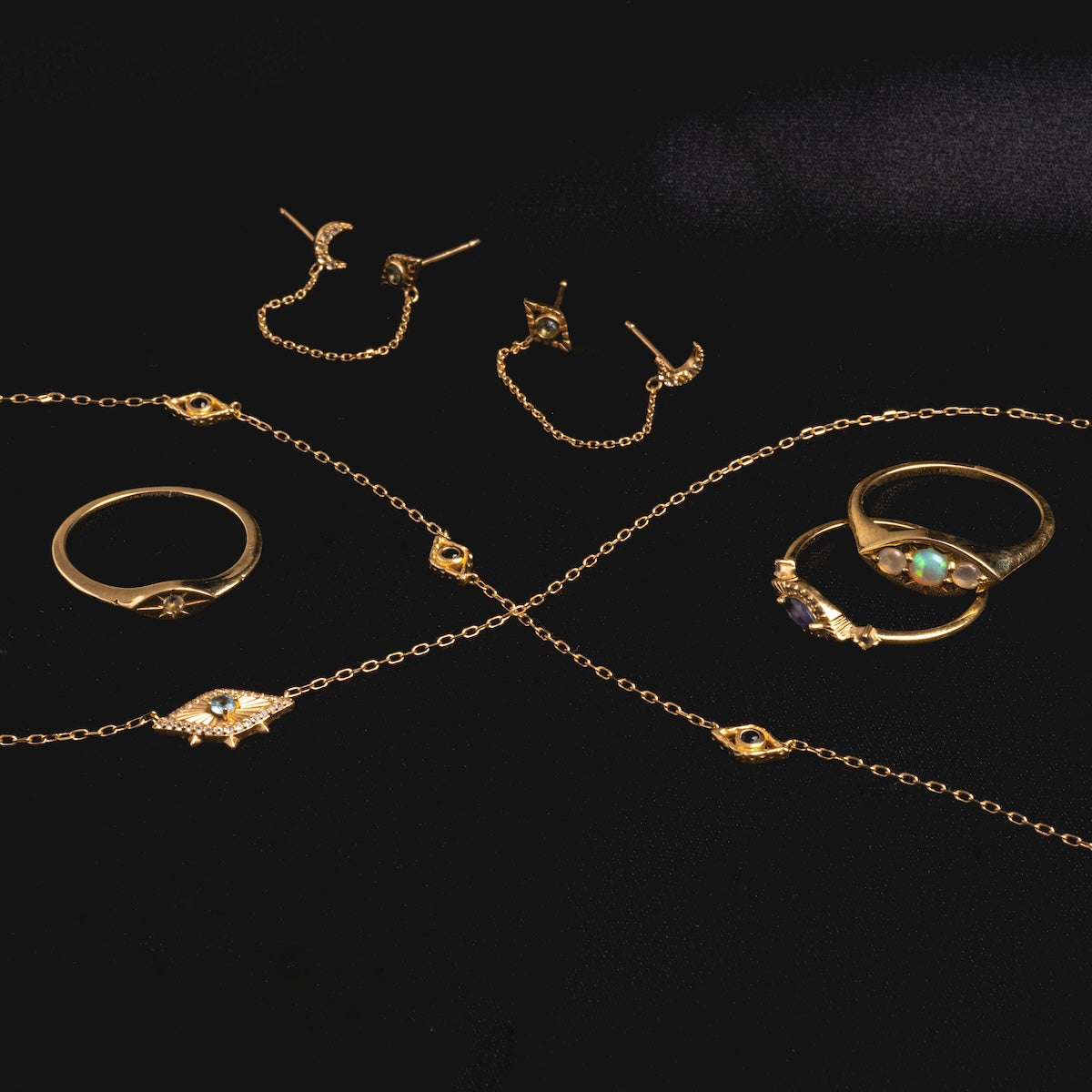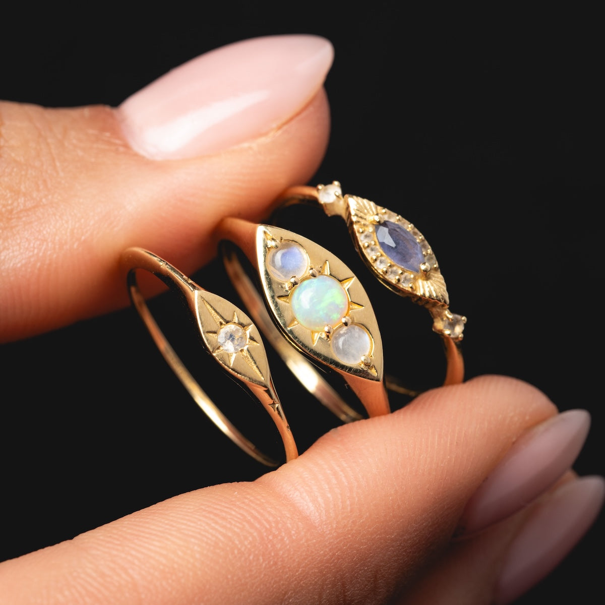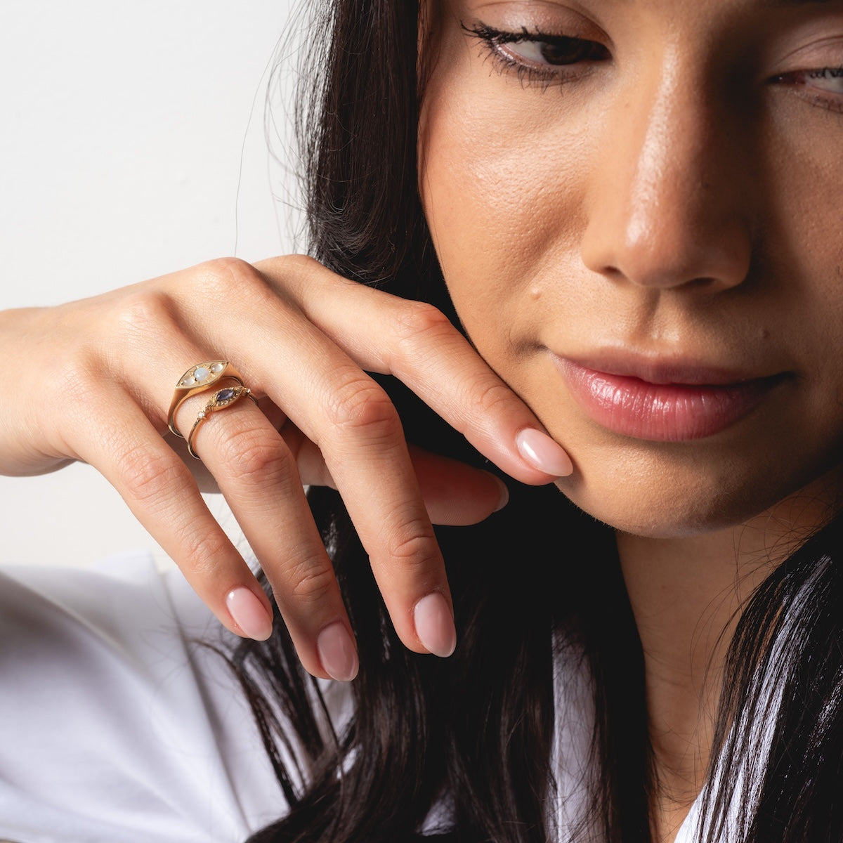 Mystical intrigue and protective energy combined in this delicately ornate solid gold evil eye ring by Harvest Moon. An awe-strikingly hued Iolite surrounded by white topaz give this stunning ring an almost magical soft shimmer.