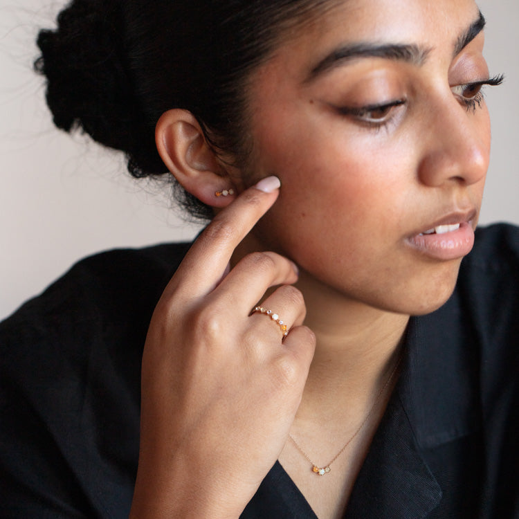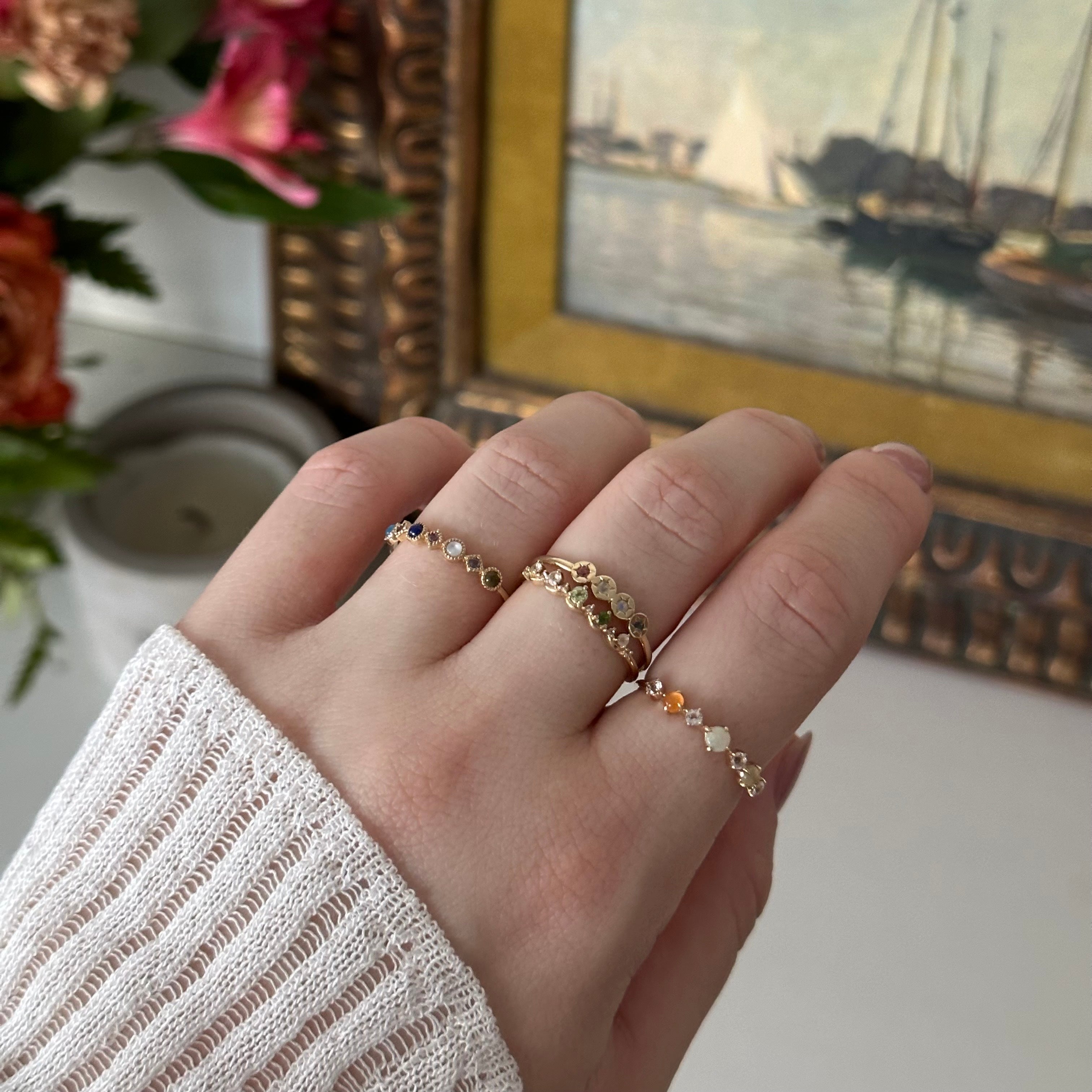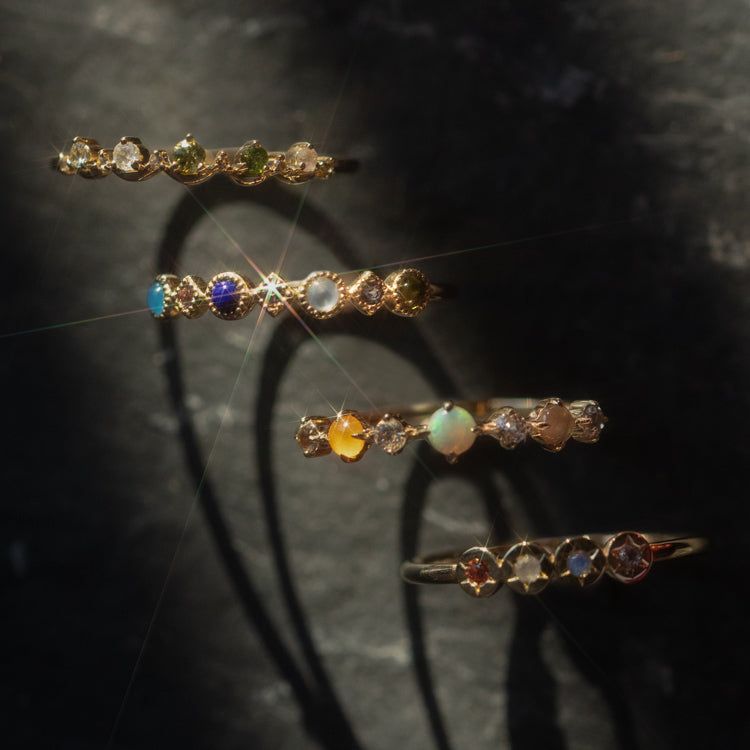Spark joy with this solid gold ring by Family Gold. Beautifully poetic. the sparkling gemstones spell out 'joy' in stone: