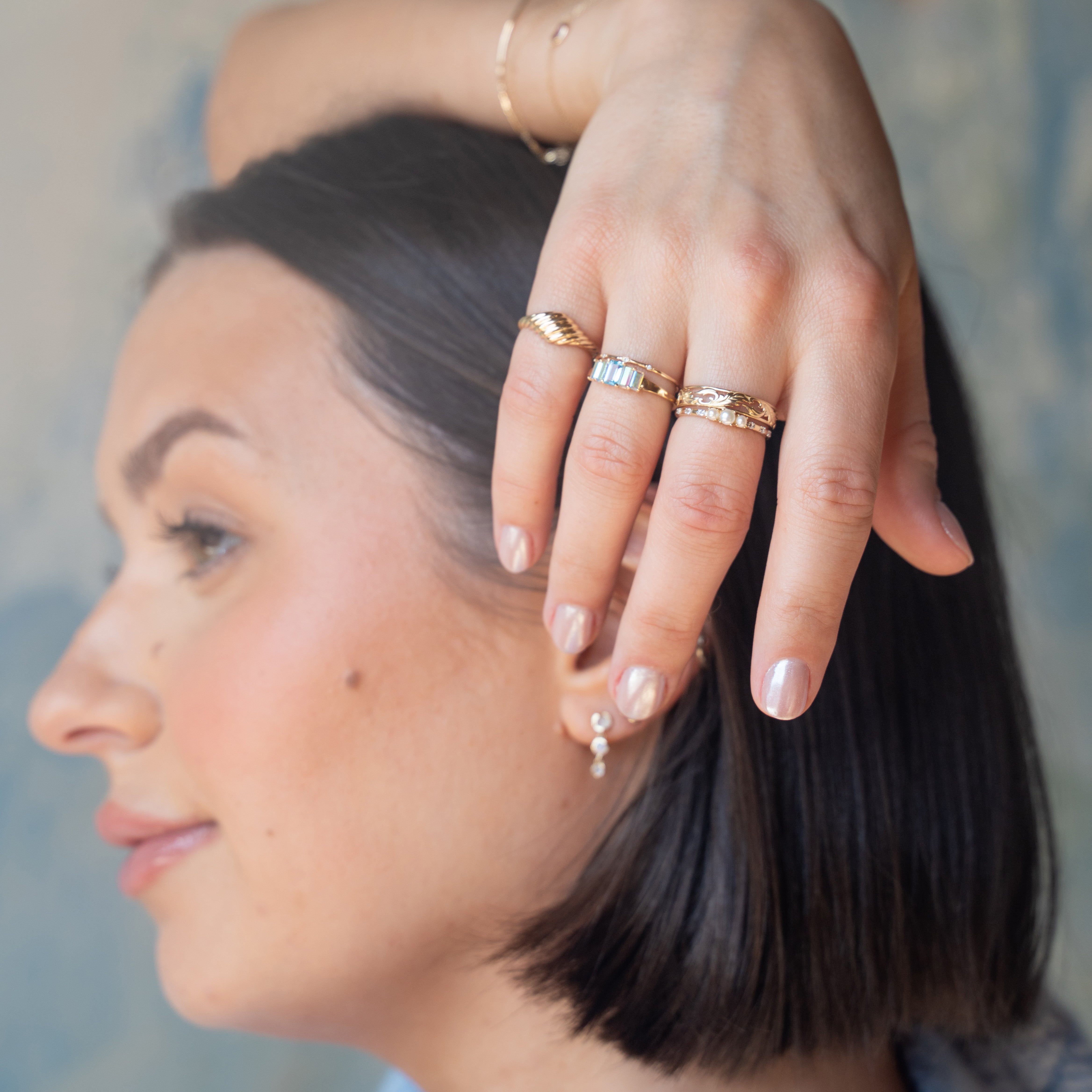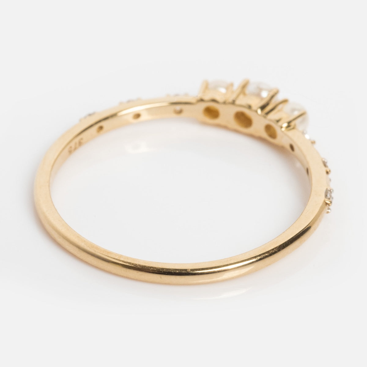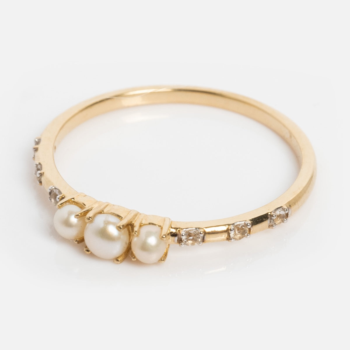 The Solid Gold Luminous Pearl Trio Ring softly glows and sparkles like the hum of a new day. Featuring a sweetly petite pearl trio on a solid gold band adorned with shimmering white topaz. this darling ring makes for the perfect elegant accent to any ring stack.