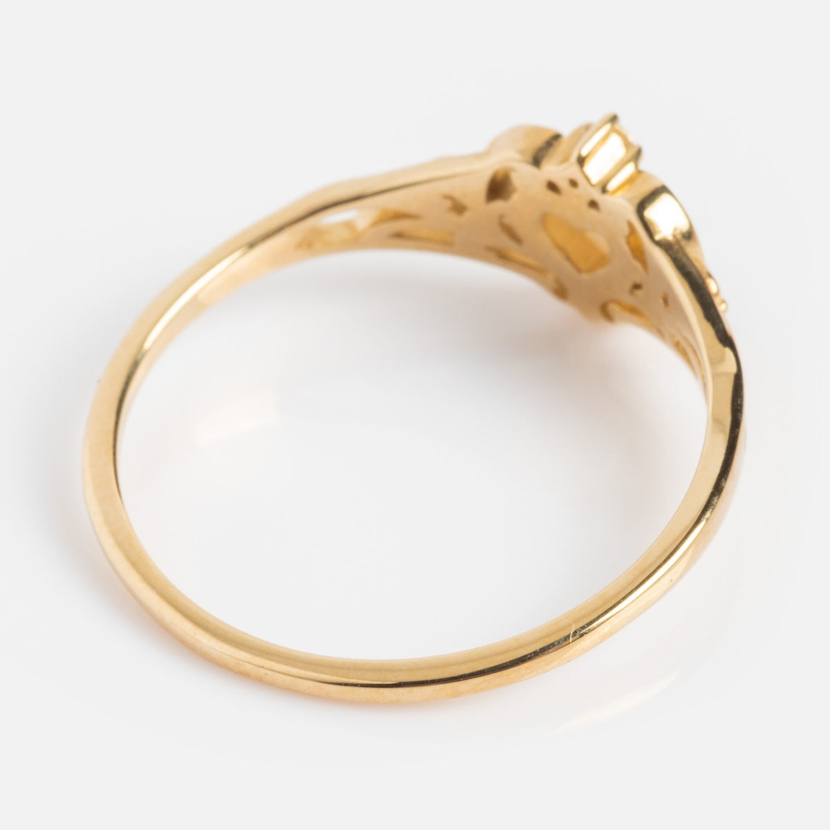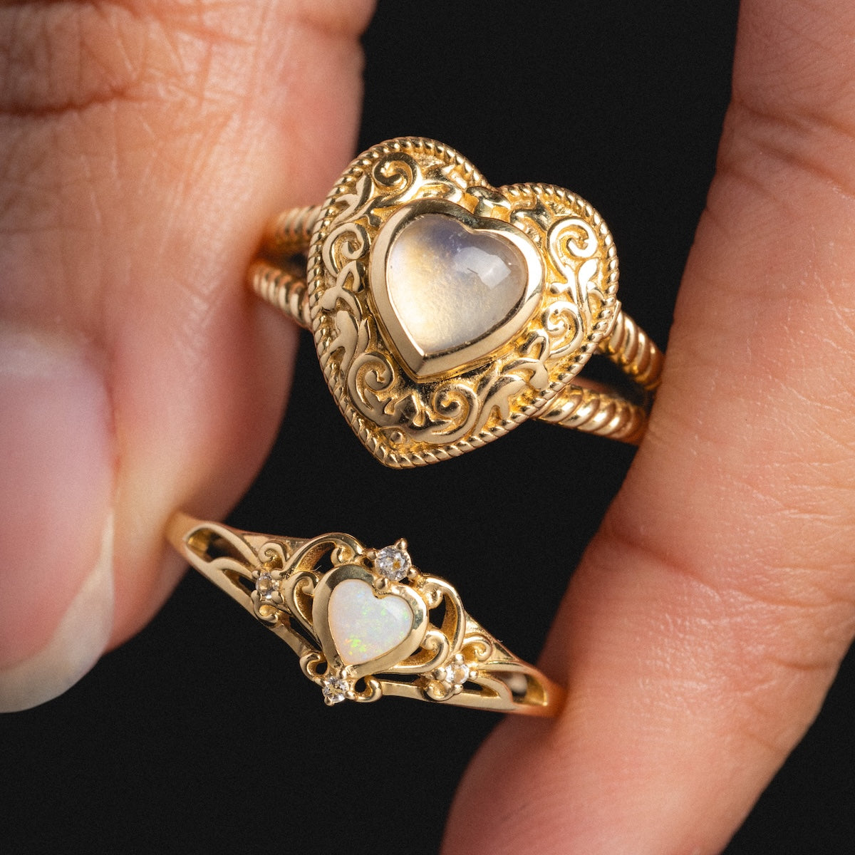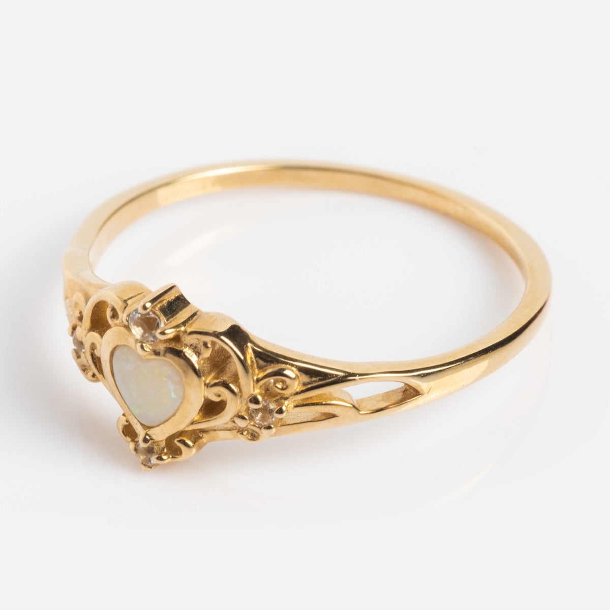 Like a tiara fit for a queen of hearts. this stunning solid gold ring features the loveliest heart shaped Australian opal surrounded by a sweetly swirling openwork filigree setting studded with dazzling white topaz stones.
