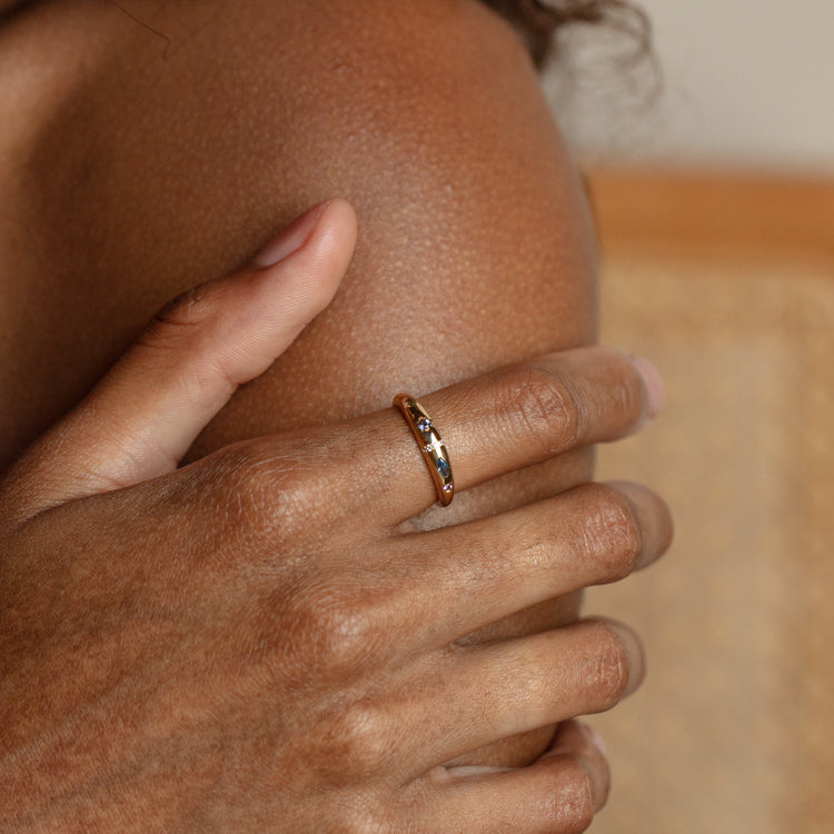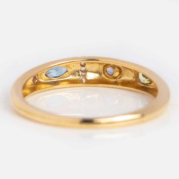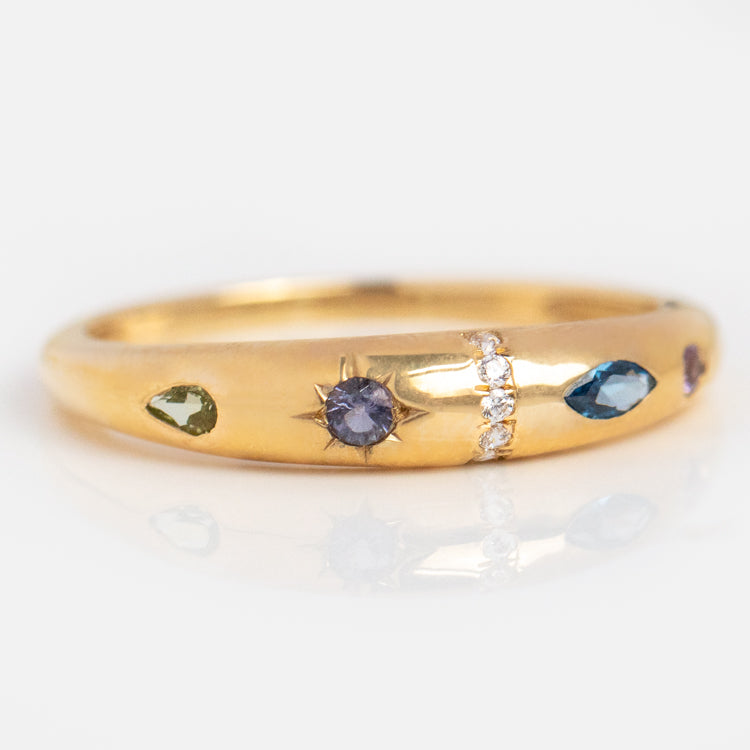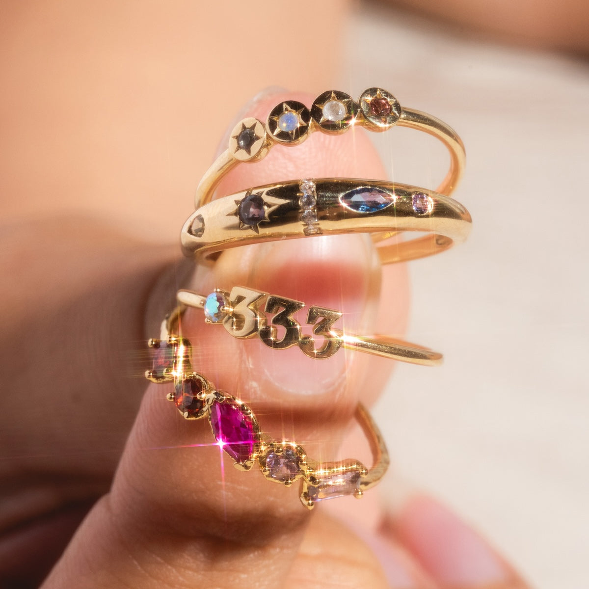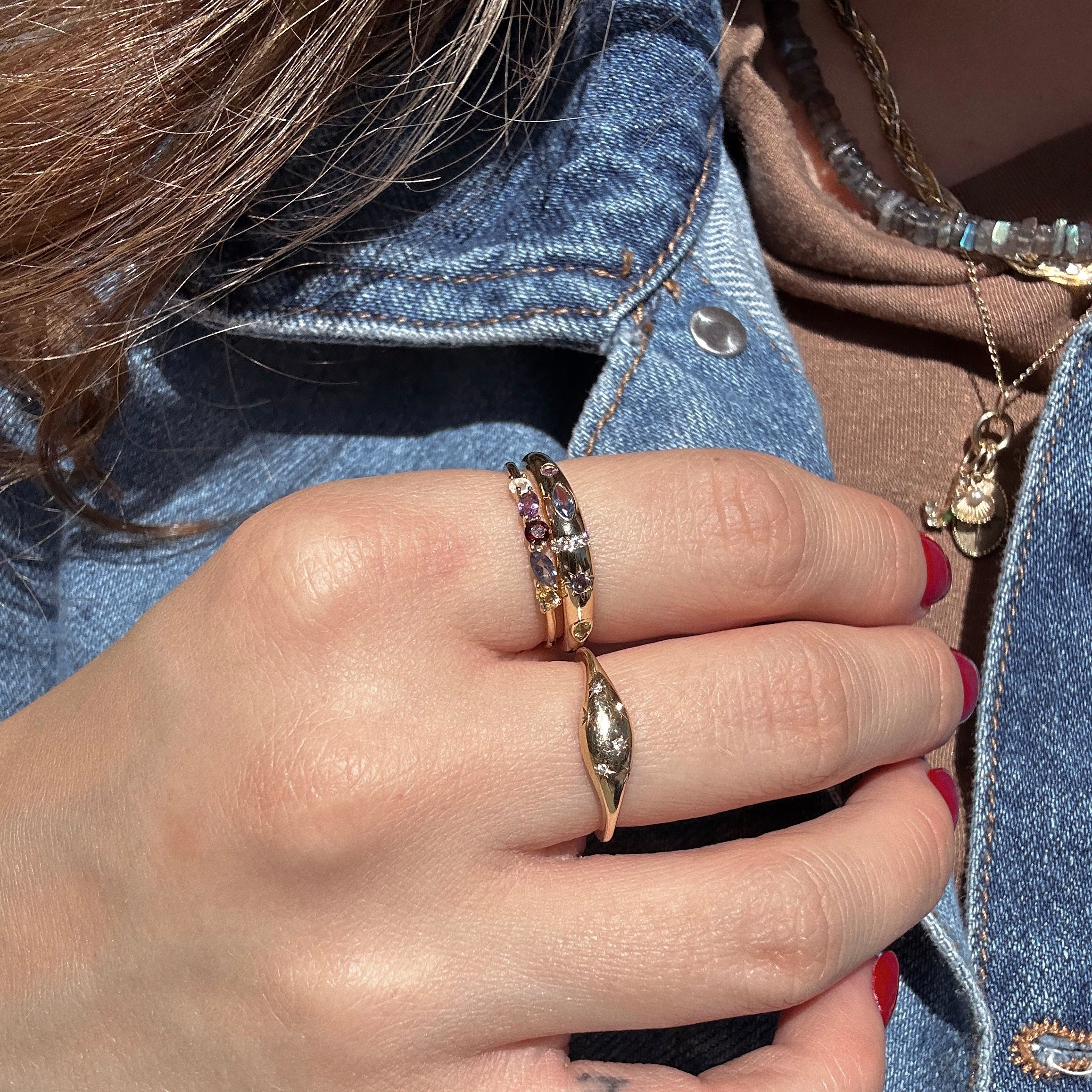 But first. pizza! This dazzling ring by Family Gold is an acrostic poem spelling out "pizza" in shimmering gemstones: