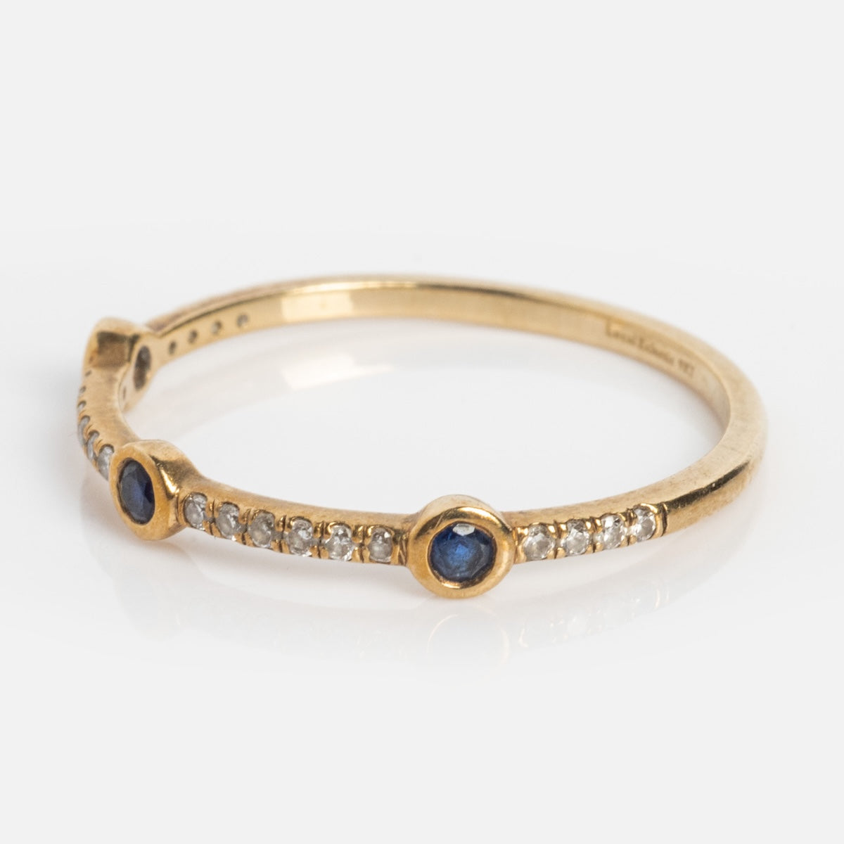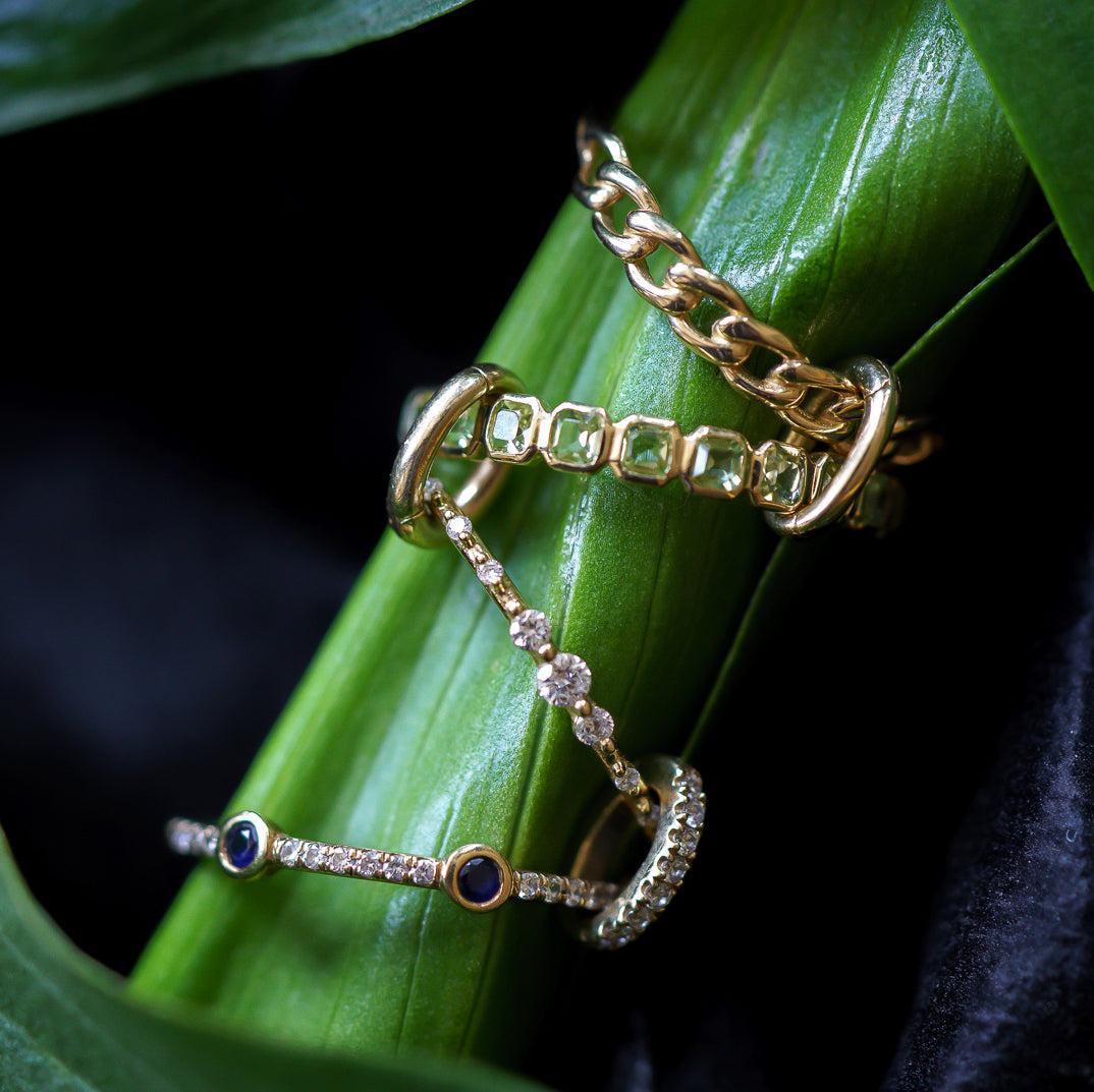The super luxe Solid Gold Slim Sapphire and Diamond Stacking Ring features bold blue sapphire accents bezel set into a delicate diamond pave band giving any stack a striking touch of texture. Stack and clip with other rings of your choice for a unique layered look.