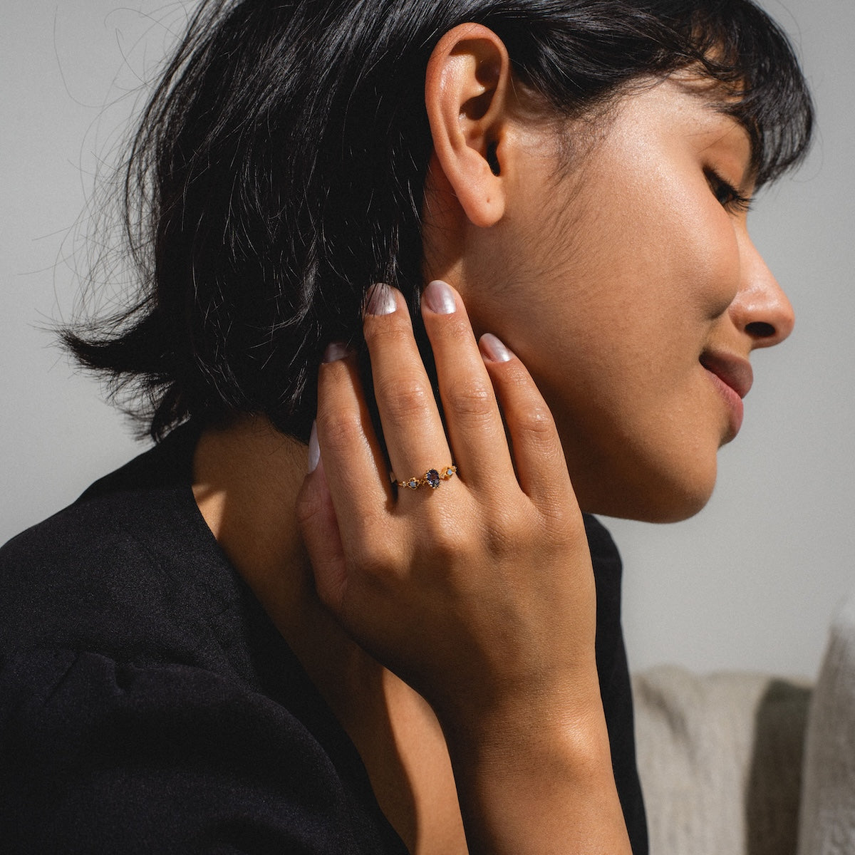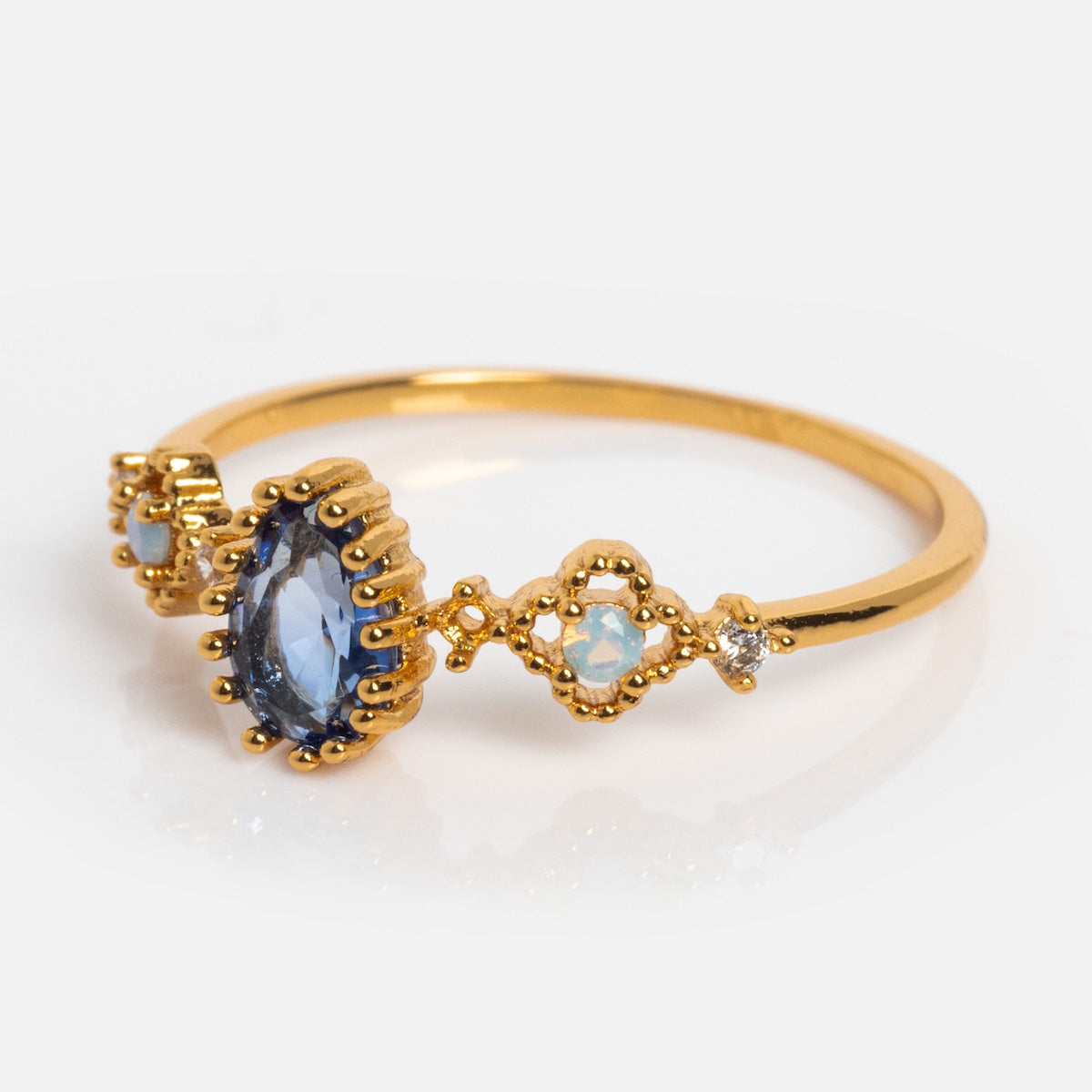 Something blue and impressively lux! This stunning ring features a beautiful blue teardrop center stone and lovely milgrain accents for a sparkly and super elegant look.