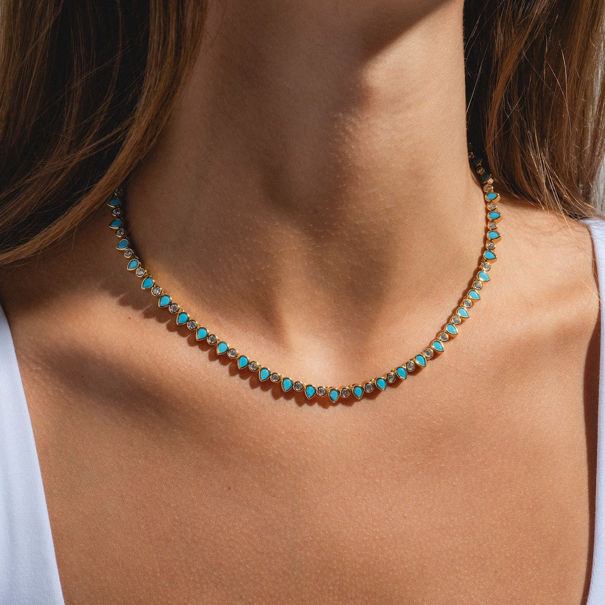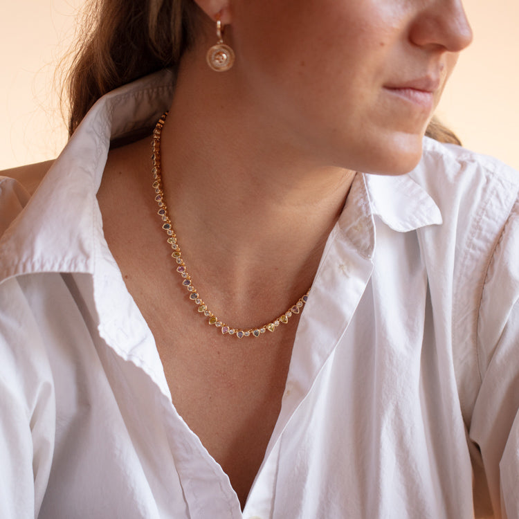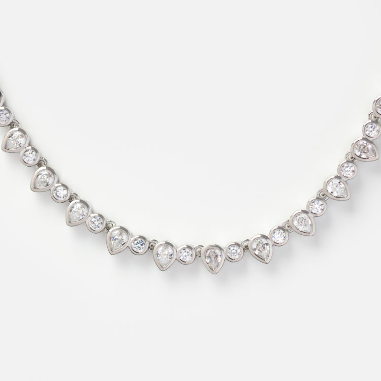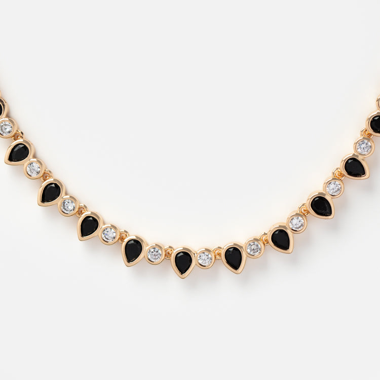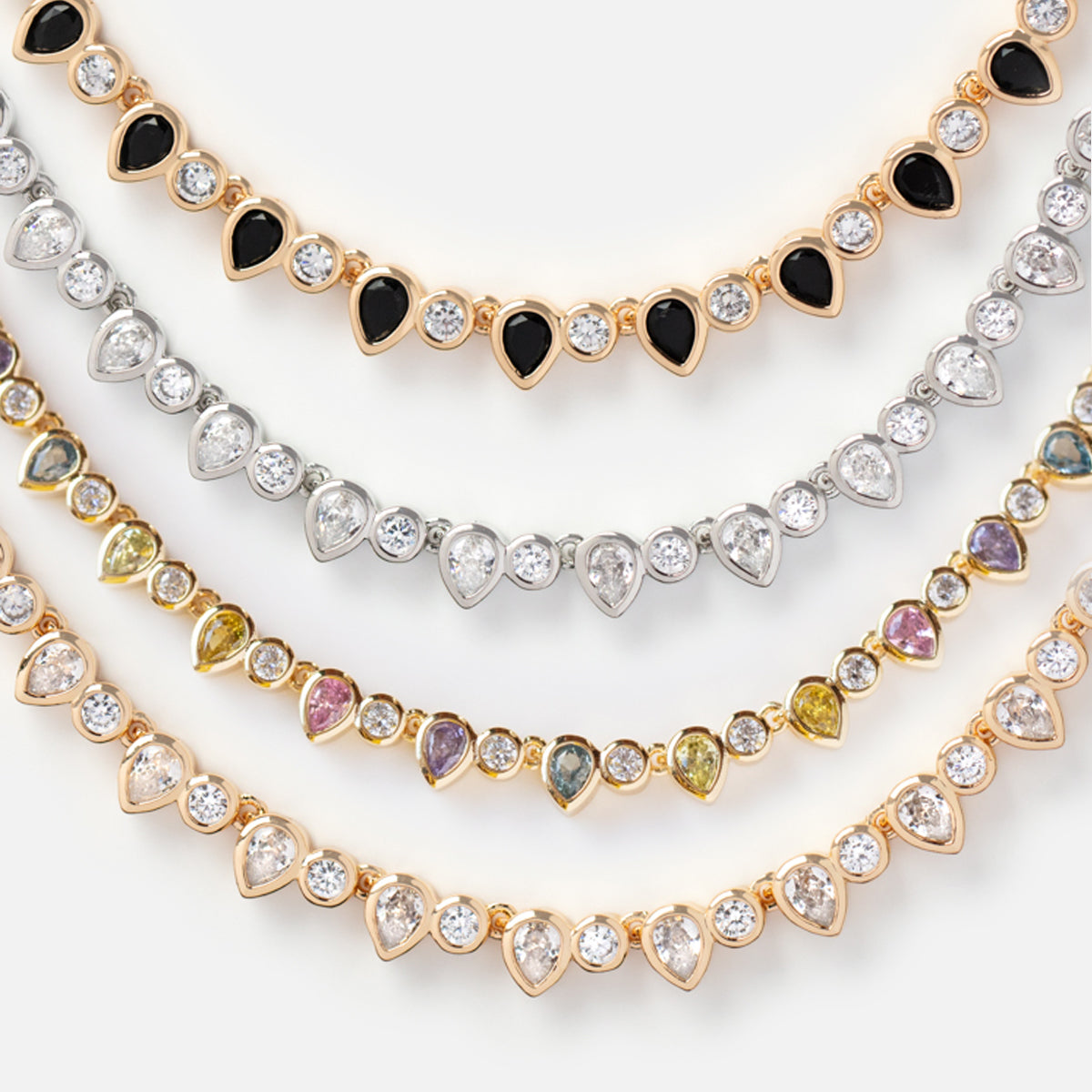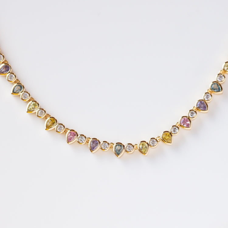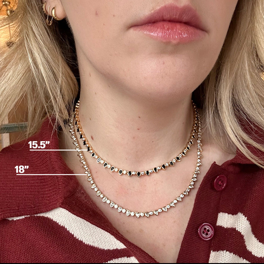 A dazzling tennis necklace for when you're feeling a little extra. This stunning pieces comes in classic white. edgier black. or pretty pastel CZs.